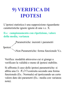 Rapporti statistici di composizione la parte rispetto al tutto percentuali di derivazione per togliere l’influenza di un fattore es.: quoziente di mortalità = morti / popolazione di frequenza (tassi) rapporti usati per esprimere l’intensità di un fenomeno (riferita ad un periodo) es.: tasso di incidenza = proporzione della popolazione che si ammala in un certo periodo di tempo Statistica inferenziale Teoria e metodologie per fare affermazioni sulle caratteristiche di una popolazione a partire da osservazioni su un gruppo (campione) Esempio: • Studio di un farmaco nuovo su un gruppo di pazienti – Il farmaco è efficace nel campione – Sarà efficace nella popolazione? Si basa sulla teoria della probabilità: Dai risultati osservati nel campione l’inferenza statistica permette di indurre (estrapolare) le caratteristiche della popolazione, con un certo grado di incertezza, espresso da una certa probabilità 1 Intervalli di confidenza Fanno parte della statistica inferenziale Sono più informativi del valore p da test Presentano i risultati nella stessa scala dei dati Esprimono anche la significatività statistica Possono essere costruiti per varie stime statistiche campionarie: medie, proporzioni, mediane, tassi, ecc. Intervalli di confidenza per proporzioni Proporzioni: rapporti tra una parte ed un totale f = numero di eventi della variabile dicotomica p = f / N q = 1 – p = (N-f) / N p + q = 1 p e q possono essere interpretate come probabilità; intervallo di confidenza della proporzione al livello 95% si ha: • limite inferiore: • limite superiore: p – 1,96 √p(1-p) /N p + 1,96 √p(1-p) /N 2 Test di ipotesi Test z per due proporzioni Test t di Student per due medie Test chi quadro χ2 per le frequenze Analisi della varianza per il confronto di più di 2 medie Analisi della correlazione e della regressione per studiare il collegamento tra una variabile “indipendente” ed una o più variabili “dipendenti” Tranne il test χ2 richiedono variabili quantitative con distribuzione di frequenza normale (o quasi…) Errori di I e II tipo Nell’applicazione della tecnica del test di ipotesi possono essere commessi due tipi di errore Test significativo (si rifiuta H0) Test non significativo (non si rifiuta H0) H0 vera Errore di I tipo (prob. α) Falso Positivo Conclusione corretta (Confidenza 1 - α) H0 falsa Conclusione corretta (Potenza 1 - β) Errore di II tipo (prob. β) Falso Negativo 3 Analogia giudiziaria Ipotesi nulla H0: l’imputato è innocente Imputato condannato (si rifiuta H0) Imputato assolto (non si rifiuta H0) Imputato innocente (H0 vera) Errore di I tipo (prob. α) Falso Positivo Conclusione corretta (Confidenza 1 - α) Imputato colpevole (H0 falsa) Conclusione corretta (Potenza 1 - β) Errore di II tipo (prob. β) Falso Negativo Metodi statistici avanzati Per variabili quantitative: Analisi della varianza per il confronto di più di 2 campioni Analisi della correlazione e della regressione per studiare il collegamento tra una variabile “indipendente” ed una o più variabili “dipendenti” Entrambi sono basati su assunzioni: distribuzione normale (o che può essere trasformata in normale) variabilità (Varianza) simile 4 Analisi della Varianza (ANOVA) Confronto di medie ottenute secondo diverse classificazioni; esempi di una classificazione a) per dose = ordine b) per categoria = criterio graduale (es. sforzo) c) per macchina = casuale Dati k gruppi, ognuno di numerosità ni Media generale = senza tenere conto dei gruppi Media di gruppo = per ogni gruppo SSq totale = SSq per gruppo + SSq delle medie di gruppo dalla media generale Rapporto tra le varianze: F = varianza “tra” / varianza “entro” dopo l’ANOVA possono essere eseguiti test di confronto tra singoli gruppi Correlazione Scopo: studiare associazione tra due variabili (quantitative) Attenzione: associazione non significa causalità Strumento grafico Diagramma di dispersione (XY) Correlazione lineare: proporzionalità coefficiente di correlazione = r coefficiente di determinazione = r2 Strumento statistico: Regressione lineare (minimi quadrati) 5 Metodi non parametrici Per: Variabili quantitative con distribuzione non normale o ignota eterogeneità della variabilità (Varianza) Variabili ordinali Variabili categoriche Si utilizzano metodi statistici che non presuppongono una distribuzione determinata da parametri (come µ e σ per la distribuzione normale di Gauss) Test non parametrici Due gruppi indipendenti: test della somma dei ranghi di Mann-Whitney stessi soggetti: test di Wilcoxon Più di due gruppi indipendenti: test di Kruskal-Wallis stessi soggetti: test di Friedman Conteggi (variabili categoriche) indipendenti: test del “chi quadro” χ2 stessi soggetti: test di Mc Nemar Correlazione coefficiente di Spearman basato sui ranghi 6 Esempio: Test di Wilcoxon “Test dei ranghi con segno” Test valido per due gruppi di dati “appaiati” Per situazioni prima-dopo ad esempio: cambiamento dei giudizi prima e dopo un corso Vale per variabili quantitative o ordinali Non richiede la distribuzione normale dei dati Permette di gestire tanti valori uguali 7