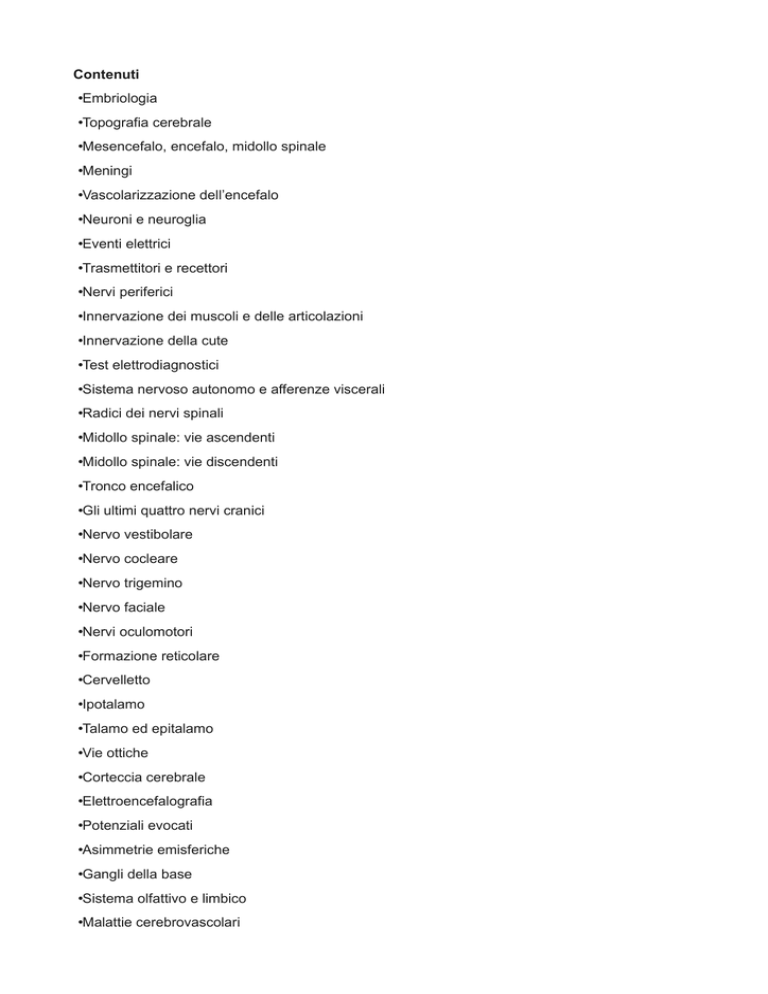 Contenuti •Embriologia •Topografia cerebrale •Mesencefalo, encefalo, midollo spinale •Meningi •Vascolarizzazione dell’encefalo •Neuroni e neuroglia •Eventi elettrici •Trasmettitori e recettori •Nervi periferici •Innervazione dei muscoli e delle articolazioni •Innervazione della cute •Test elettrodiagnostici •Sistema nervoso autonomo e afferenze viscerali •Radici dei nervi spinali •Midollo spinale: vie ascendenti •Midollo spinale: vie discendenti •Tronco encefalico •Gli ultimi quattro nervi cranici •Nervo vestibolare •Nervo cocleare •Nervo trigemino •Nervo faciale •Nervi oculomotori •Formazione reticolare •Cervelletto •Ipotalamo •Talamo ed epitalamo •Vie ottiche •Corteccia cerebrale •Elettroencefalografia •Potenziali evocati •Asimmetrie emisferiche •Gangli della base •Sistema olfattivo e limbico •Malattie cerebrovascolari