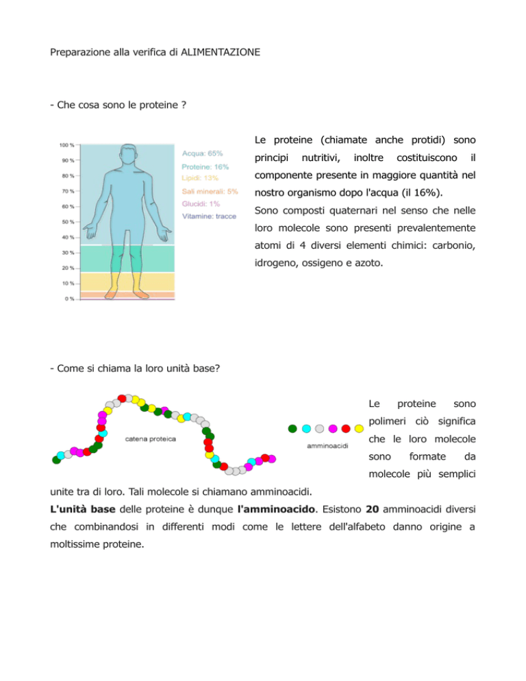 Preparazione alla verifica di ALIMENTAZIONE - Che cosa sono le proteine ? Le proteine (chiamate anche protidi) sono principi nutritivi, inoltre costituiscono il componente presente in maggiore quantità nel nostro organismo dopo l'acqua (il 16%). Sono composti quaternari nel senso che nelle loro molecole sono presenti prevalentemente atomi di 4 diversi elementi chimici: carbonio, idrogeno, ossigeno e azoto. - Come si chiama la loro unità base? Le proteine sono polimeri ciò significa che le loro molecole sono formate da molecole più semplici unite tra di loro. Tali molecole si chiamano amminoacidi. L'unità base delle proteine è dunque l'amminoacido. Esistono 20 amminoacidi diversi che combinandosi in differenti modi come le lettere dell'alfabeto danno origine a moltissime proteine. - Che funzione svolgono le proteine ? Le proteine svolgono prevalentemente una funzione plastica: costruiscono e riparano i nostri organi e i nostri tessuti, sono i mattoni con cui si costruisce il nostro corpo. Le proteine possono anche funzionare da enzimi, ormoni e anticorpi; altre intervengono nel processo di coagulazione del sangue; altre ancora servono per il trasporto delle sostanze nutritive e dell’ossigeno. - Quali sono gli alimenti ricchi di proteine ? Sono un’importante fonte di proteine la carne, il pesce, le uova, il latte e i suoi derivati e i legumi – Che cosa si intende per aminoacidi essenziali? (Dopo averne dato la definizione elencali) . Sono definiti essenziali quegli aminoacidi che l'organismo umano non riesce a produrre in quantità sufficiente a far fronte ai propri bisogni. Pertanto gli amminoacidi essenziali devono essere introdotti nell'organismo con gli alimenti. Essi sono fenilalanina, isoleucina, lisina, leucina, metionina, treonina, triptofano e valina.