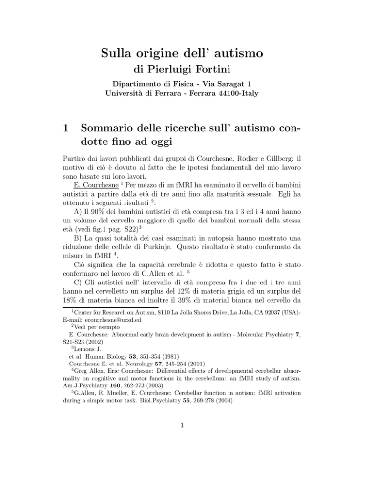 Sulla origine dell’ autismo di Pierluigi Fortini Dipartimento di Fisica - Via Saragat 1 Università di Ferrara - Ferrara 44100-Italy 1 Sommario delle ricerche sull’ autismo condotte fino ad oggi Partirò dai lavori pubblicati dai gruppi di Courchesne, Rodier e Gillberg: il motivo di ciò è dovuto al fatto che le ipotesi fondamentali del mio lavoro sono basate sui loro lavori. E. Courchesne 1 Per mezzo di un fMRI ha esaminato il cervello di bambini autistici a partire dalla età di tre anni fino alla maturità sessuale. Egli ha ottenuto i seguenti risultati 2 : A) Il 90% dei bambini autistici di età compresa tra i 3 ed i 4 anni hanno un volume del cervello maggiore di quello dei bambini normali della stessa età (vedi fig.1 pag. S22)3 B) La quasi totalità dei casi esaminati in autopsia hanno mostrato una riduzione delle cellule di Purkinje. Questo risultato è stato confermato da misure in fMRI 4 . Ciò significa che la capacità cerebrale è ridotta e questo fatto è stato confermaro nel lavoro di G.Allen et al. 5 C) Gli autistici nell’ intervallo di età compresa fra i due ed i tre anni hanno nel cervelletto un surplus del 12% di materia grigia ed un surplus del 18% di materia bianca ed inoltre il 39% di material bianca nel cervello da 1 Center for Research on Autism, 8110 La Jolla Shores Drive, La Jolla, CA 92037 (USA)E-mail: [email protected] 2 Vedi per esempio E. Courchesne: Abnormal early brain development in autism - Molecular Psychiatry 7, S21-S23 (2002) 3 Lemons J. et al. Human Biology 53, 351-354 (1981) Courchesne E. et al. Neurology 57, 245-254 (2001) 4 Greg Allen, Eric Courchesne: Differential effects of developmental cerebellar abnormality on cognitive and motor functions in the cerebellum: an fMRI study of autism. Am.J.Psychiatry 160, 262-273 (2003) 5 G.Allen, R. Mueller, E. Courchesne: Cerebellar function in autism: fMRI activation during a simple motor task. Biol.Psychiatry 56, 269-278 (2004) 1 confrontare con i bambini normali della stessa età. D’ altra parte gli autistici più vecchi e gli adolescenti non hanno tale surplus di materia grigia e bianca (vedi fig 1 pag. S22) D)Ciò significa che il cervello degli autistici segue differenti modelli di sviluppo: con l’ età il surplus di materia grigia e bianca tende a livellarsi sui valori nomali. C. Gillberg 6 Si è accorto che l’ autismo è presente in individui colpiti da malformazioni che riguardano l’ asse cerebrale che indicano una presenza di danni embrionali. Il gruppo di Gillberg si è interessato all’ epidemia di thalidomide che si ebbe negli anni ’60 che colpı̀ 10.000 persone tra le quali 6000 sono sopravvissuti 7 . Gli studiosi Svedesi notarono che assieme al thalidomide vi furono casi di autismo anche nelle sindromi di Möbius e di Goldenhar. Coinvolgimenti statistici dei nervi cranici, nei casi più studiati, erano approssimativamente nelle proporzioni: thalidomide: coinvolgimento del nervo adducente (VI)(44%) coinvolgimento del nervo facciale(VII) (20%) coinvolgimento del nervo ipoglosso (XII) (19%) Möbius: coinvolgimento del nervo abducente (VI)(totalità) coinvolgimento del nervo facciale (VII)(totalità) coinvolgimento del nervo ipoglosso (XII) (64%) In tutte le sidromi la presenza dei disturbi oculari è particolarmente evidente. Tutti i casi investigati portano al legame tra autismo e i disturbi dei XII nervi cranici. Il problema è allora di trovare una connessione (se pure ne esiste una!) tra di essi: lo scopo di questo lavoro è pertanto di trovare una connessione fra di essi. PM. Rodier 8 Parte da un approccio simile a quello investigato da Gillberg con la differenza che Rodier si prende cura della teratologia cioè lo studio delle anomalie e delle loro cause ambientali9 6 Department of child and adolescent psychiatry, Göteborg University, Sweden and St. George’s Hospital Medical School, University of London, UK; E-mail: [email protected] 7 C. Gillberg et al.: Autism associated with conditions characterized by developmental errors in early embryogenesis: a mini review - Int. J.Devl. Neurol. 23, 201-219 (2005) 8 Department of Obstetrics and Gynecology, University of Rochester School of Medicine, New York 14642, USA; E-mail: Patricia [email protected] 9 Vedi TL. Arndt, CJ. Stodgell and PM. Rodier: The teratology of autism - Int. J. Devl.Neuroscience 23, 189-199 (2005) 2 La posizione della Rodier, come è quella in genere della posizione americana, considera l’ autismo dipendente da cause ambientali e nei suoi lavori dà prove a favore di questa teoria. Questi tests consistono nell’ esporre animali da esperimento all’ azione dell’ acido valproico (che è un potente fattore teratologico sugli embrioni dei mammiferi) poi paragonare questi risultati con autistici forniti dalle autopsie. La cosa più interessante nei lavori della Rodier è che vi sono lesioni nei XII nervi cranici lungo le stesse linee dei lavori di Gillberg. Cosı̀ per esempio, esiste un’ autopsia in cui il nucleo facciale e l’ oliva superiore mancano. Continuando in questa linea Rodier ha notato che l’ esposizione all’ acido valproico produceva una riduzione nel numero dei neuroni motori nei nuclei dei nervi V, XII, VI, III and VII 10 . Inoltre il gruppo della Rodier ha notato che quando un ratto femmina è esposto all’ acido valproico all’ epoca della chiusura del tubo neurale i nuclei sono distrutti. 2 Ipotesi di questo lavoro Nel paragrafo precedente abbiamo visto che la ricerca sperimentale si occupava di due aree nell’ asse cerebrale: da una parte il cervelletto con il coinvolgimento nella parte frontale cerebrale (Courchesne) e dall’ altra parte l’ estremo più caudale con i suoi XII nervi che vengono creati vicini al cervelletto (Gillberg, Rodier). Queste parti (cervello fontale e XII nervi) sono legati tra di loro ed il cervelletto gioca un ruolo fondamentale. Infatti le anomalie delle parti frontali sono legati direttamente col cervelletto per mezzo di vari pathways. Per fare 