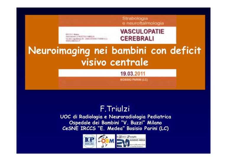 Neuroimaging nei bambini con deficit visivo centrale F.Triulzi UOC di Radiologia e Neuroradiologia Pediatrica Ospedale dei Bambini “V. Buzzi” Milano CeSNE IRCCS “E. Medea” Bosisio Parini (LC) Overview •Sviluppo delle vie visive : feto – neonato •Nuove tecniche di indagine •Lesioni selettive delle vie visive RM Fetale 19.5 24 20.5 26 21 28 22 30 23 34 Sviluppo dei solchi cerebrali Solchi Anatomia RM Calcarina 16 22-23 Cingolato 18 22-23 Centrale 20 24-25 Temporale superiore 23 26 Collaterale 23 24-25 Precentrale 24 26 Postcentrale 25 26 Frontale superiore 25 24-25 Infraparietale 26 26 Frontale inferiore 28 28 Temporale inferiore 30 30 Sviluppo corteccia calcarina 21 23 24 26 28 30 Sviluppo corteccia calcarina 24 26 28 Neonato Neonato Neonato Chiasma Tratti ottici Neonato Corpi genicolati laterali Neonato Radiazione visiva Neonato Radiazione visiva 3 mesi 5 mesi 7 mesi 9 mesi 3 TESLA Tratto ottico Corpo genicolato laterale 3 TESLA Radiazione visiva 3 TESLA Corteccia calcarina 3 TESLA Striscia di Gennari Corteccia calcarina Vie visive centrali - tecniche RM non convenzionali Diffusione - Trattografia Attivazione funzionale effetto BOLD visual pathways functional MRI Pub Med - 1878 articoli chiasma Lesioni delle vie visive centrali •Via visiva primaria •Vie visive associative PERIODO NEONATALE PERIODO POST-NEONATALE PERIODO NEONATALE danno anossico-ischemico Le caratteristiche dell’ encefalopatia anossicoischemica variano in ragione dell’età gestazionale 33 SG 40 SG Leucoencefalopatia del prematuro 25 SG trasfusione feto-fetale PVL- Fase acuta (24-72 ore) US – tecnica di prima scelta RM : rari casi ? PVL – fase acuta (5-7 giorni) Sfumate ipointensità T2 T2W I Iperintensità T1 PVL - fase cronica: esiti a distanza (> 2 mesi) Ventricoli squadrati Assottigliamento della SB Anche la TC può riconoscere Il quadro tipico PVL - fase cronica: esiti a distanza (> 2 mesi) Iperintensità della SB residua ben visibile alla FLAIR PVL non cistica Usualmente eco negativa dopo la prima settimana iperintensità di segnale in T1 PVL non cistica Le lesioni possono essere estremamente piccole e visibili anche in T2 PVL non cistica Controllo a distanza – perdita di sostanza bianca 34 sg 15 mesi Cortesia C. Baldoli PVL - fase cronica: esiti a distanza (> 2 mesi) Valutazione delle fibre coinvolte in esiti PVL mediante mappe vettoriali e trattografia Diffusion tensor imaging of periventricular leukomalacia shows affected sensory cortex white matter pathways. Hoon AH, Lawrie WTJr, Melhem ER, et al Neurology 2002; 59:752-756 Parasagittal lesions Acute phase (CT) Chronic phase (T1WI) Parasagittal lesions acute phase (4 days) HIE “typical” lesions + parasagittal lesions (6 days) HIE “typical” lesions + parasagittal lesions (6 days) Parasagittal lesions chronic phase Parasagittal lesions chronic phase Lesioni parasagittali Corpo genicolato laterale Pulvinar Lesioni parasagittali Corpo genicolato laterale Pulvinar Vene midollari profonde 38 w Vene midollari profonde 38 w Vene midollari profonde 38 w 20m Encefalite da Enterovirus Encefalite da Enterovirus Ipoglicemia Esiti lesione capsulo-talamica Esiti lesione capsulo-talamica Tumore occipitale Esiti traumatici Encefalite Sindrome emolitico uremica DI, f, 10 anni Sindrome emolitico uremica DI, f, 10 anni MALFORMAZIONI Sindrome del dente molare Molar tooth sign Normale MTS Jouber Syndrome Related Disorders (JSRD) Cilia-related gene deficiencies Joubert syndrome Meckel-Gruber syndrome Bardet-Biedl syndrome Orofaciodigital syndrome Displasia e eterotopia dei nn.cerebellari Assenza della decussazione piramidale Anomalie del nucleo olivare inferiore Anomalie nel tratto trigeminale discendente Anomalie nel fascicolo solitario Anomalie nel nn. della colonna dorsale Assenza della decussazione dei ped. cerebellari sup. e del tratto centrale pontino Assenza della decussazione dei peduncoli cerebellari superiori PA,f dob 19.03.93 RM 22.11.01 PA,f dob 19.03.93 RM 22.11.01 PA,f dob 19.03.93 RM 22.11.01 SS,f dob 13.09.05 RM 25.05.06 SS,m dob 01.06.94 RM 22.10.07 RM – vie visive centrali IMAGING INTEGRATO Neuroimaging nei bambini con deficit visivo centrale Grazie per l’attenzione