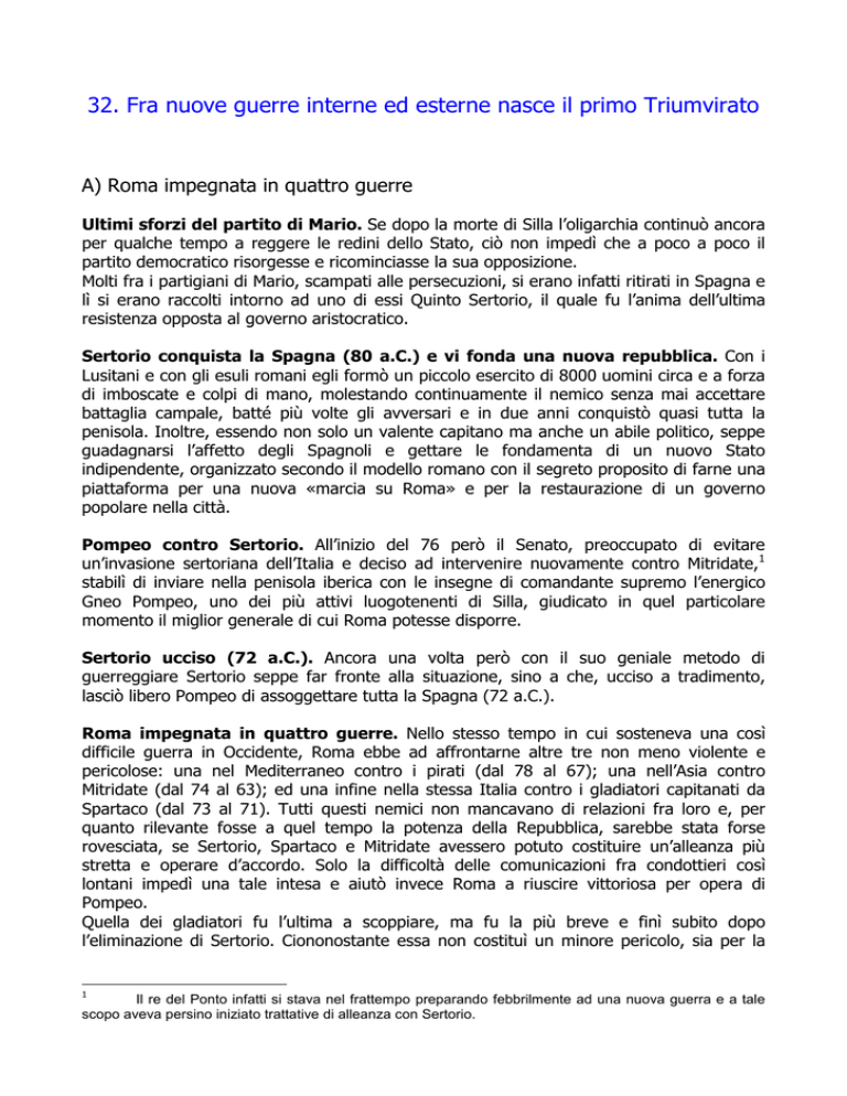 32. Fra nuove guerre interne ed esterne nasce il primo Triumvirato A) Roma impegnata in quattro guerre Ultimi sforzi del partito di Mario. Se dopo la morte di Silla l’oligarchia continuò ancora per qualche tempo a reggere le redini dello Stato, ciò non impedì che a poco a poco il partito democratico risorgesse e ricominciasse la sua opposizione. Molti fra i partigiani di Mario, scampati alle persecuzioni, si erano infatti ritirati in Spagna e lì si erano raccolti intorno ad uno di essi Quinto Sertorio, il quale fu l’anima dell’ultima resistenza opposta al governo aristocratico. Sertorio conquista la Spagna (80 a.C.) e vi fonda una nuova repubblica. Con i Lusitani e con gli esuli romani egli formò un piccolo esercito di 8000 uomini circa e a forza di imboscate e colpi di mano, molestando continuamente il nemico senza mai accettare battaglia campale, batté più volte gli avversari e in due anni conquistò quasi tutta la penisola. Inoltre, essendo non solo un valente capitano ma anche un abile politico, seppe guadagnarsi l’affetto degli Spagnoli e gettare le fondamenta di un nuovo Stato indipendente, organizzato secondo il modello romano con il segreto proposito di farne una piattaforma per una nuova «marcia su Roma» e per la restaurazione di un governo popolare nella città. Pompeo contro Sertorio. All’inizio del 76 però il Senato, preoccupato di evitare un’invasione sertoriana dell’Italia e deciso ad intervenire nuovamente contro Mitridate,1 stabilì di inviare nella penisola iberica con le insegne di comandante supremo l’energico Gneo Pompeo, uno dei più attivi luogotenenti di Silla, giudicato in quel particolare momento il miglior generale di cui Roma potesse disporre. Sertorio ucciso (72 a.C.). Ancora una volta però con il suo geniale metodo di guerreggiare Sertorio seppe far fronte alla situazione, sino a che, ucciso a tradimento, lasciò libero Pompeo di assoggettare tutta la Spagna (72 a.C.). Roma impegnata in quattro guerre. Nello stesso tempo in cui sosteneva una così difficile guerra in Occidente, Roma ebbe ad affrontarne altre tre non meno violente e pericolose: una nel Mediterraneo contro i pirati (dal 78 al 67); una nell’Asia contro Mitridate (dal 74 al 63); ed una infine nella stessa Italia contro i gladiatori capitanati da Spartaco (dal 73 al 71). Tutti questi nemici non mancavano di relazioni fra loro e, per quanto rilevante fosse a quel tempo la potenza della Repubblica, sarebbe stata forse rovesciata, se Sertorio, Spartaco e Mitridate avessero potuto costituire un’alleanza più stretta e operare d’accordo. Solo la difficoltà delle comunicazioni fra condottieri così lontani impedì una tale intesa e aiutò invece Roma a riuscire vittoriosa per opera di Pompeo. Quella dei gladiatori fu l’ultima a scoppiare, ma fu la più breve e finì subito dopo l’eliminazione di Sertorio. Ciononostante essa non costituì un minore pericolo, sia per la 1 Il re del Ponto infatti si stava nel frattempo preparando febbrilmente ad una nuova guerra e a tale scopo aveva persino iniziato trattative di alleanza con Sertorio. vicinanza a Roma del teatro di operazioni, sia per il grande valore di chi la condusse, sia infine per l’animosità con cui quell’«umanità oltraggiata» cercò di vendicarsi. La rivolta del gladiatori (73-71 a.C.); Spartaco sue vittorie (72 a.C.). Nel 73 a.C. infatti circa settanta gladiatori della scuola gladiatoria di Capua – la prima o una delle prime create in Italia – riuscirono ad eludere la sorveglianza dei guardiani e a rifugiarsi sul Vesuvio, sotto la guida di un capo abile e valoroso, il tracio Spartaco. La piccola banda crebbe ben presto al punto da formare un grosso esercito di circa 70.000 uomini, i quali, avidi di bottino e di vendetta, desolarono con le loro scorrerie e con i loro saccheggi il Bruzio e la Campania. Preoccupato per la piega presa dagli avvenimenti, il Senato si affrettò ad inviare alcune legioni formate di truppe scelte, che Spartaco con singolare valore e prudenza riuscì però a sconfiggere. Comprendendo tuttavia che la potenza di Roma avrebbe alla fine trionfato, mosse verso le Alpi, cercando di aprirsi una via per fare ritorno in patria. Marciò quindi verso settentrione, ma i suoi commilitoni, avidi soltanto di preda, lo obbligarono ad un certo momento a tornare indietro, non già, come si è da alcuni affermato, per muovere all’espugnazione della capitale, bensì per passare con l’aiuto dei pirati in Sicilia, dove speravano di suscitare nuovi focolai di rivolta. Vittoria di Crasso (71 a.C.). Spingendosi perciò lungo la costa adriatica fino alla Lucania, Spartaco uscì vincitore da nuovi scontri, finché assalito sul fiume Silaro (l’odierno Sele) dal pretore Marco Licinio Crasso al comando di sei legioni, fu completamente disfatto (71 a.C.) nel corso di una disperata battaglia, nella quale perirono 60.000 schiavi – fra cui lo stesso Spartaco – caduti da valorosi sul campo. Vittoria di Pompeo. I pochi scampati alla strage o sfuggiti alla prigione poterono salvarsi sugli Appennini, ma si scontrarono non molto tempo dopo in Etruria con Pompeo, che tornava dalla Spagna vincitore di Sertorio, e furono da lui massacrati. Consolato di Pompeo e Crasso (70 a.C.). Quindi i due vittoriosi generali si diressero verso Roma, dove si lasciarono indurre a porre la propria candidatura alla massima magistratura dello Stato e a non tenere in alcun conto le prescrizioni e le limitazioni imposte da Silla alla carriera politica (Pompeo infatti non aveva ancora ricoperto altre magistrature). Il Senato naturalmente si oppose ed essi per tutta risposta – benché provenienti dalle file Sillane – si schierarono dalla parte del partito democratico e con l’aiuto anche dei cavalieri ottennero il consolato. Riforme di Pompeo e Crasso. Entrati in carica all’inizio dell’anno seguente (70 a.C.), Pompeo e Crasso si dettero subito a riformare lo Stato e a distruggere quasi del tutto l’opera di Silla, fac