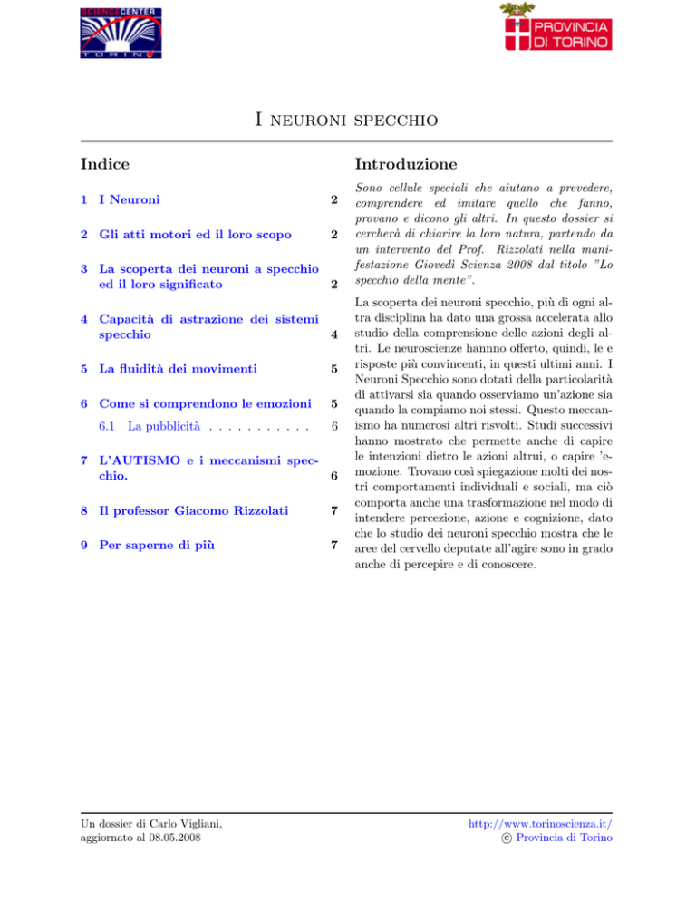 I neuroni specchio Introduzione Indice 1 I Neuroni 2 2 Gli atti motori ed il loro scopo 2 3 La scoperta dei neuroni a specchio ed il loro significato 2 4 Capacità di astrazione dei sistemi specchio 4 5 La fluidità dei movimenti 5 6 Come si comprendono le emozioni 5 6.1 La pubblicità . . . . . . . . . . . 6 7 L’AUTISMO e i meccanismi specchio. 6 8 Il professor Giacomo Rizzolati 7 9 Per saperne di più 7 Un dossier di Carlo Vigliani, aggiornato al 08.05.2008 Sono cellule speciali che aiutano a prevedere, comprendere ed imitare quello che fanno, provano e dicono gli altri. In questo dossier si cercherà di chiarire la loro natura, partendo da un intervento del Prof. Rizzolati nella manifestazione Giovedı̀ Scienza 2008 dal titolo ”Lo specchio della mente”. La scoperta dei neuroni specchio, più di ogni altra disciplina ha dato una grossa accelerata allo studio della comprensione delle azioni degli altri. Le neuroscienze hannno offerto, quindi, le e risposte più convincenti, in questi ultimi anni. I Neuroni Specchio sono dotati della particolarità di attivarsi sia quando osserviamo un’azione sia quando la compiamo noi stessi. Questo meccanismo ha numerosi altri risvolti. Studi successivi hanno mostrato che permette anche di capire le intenzioni dietro le azioni altrui, o capire ’emozione. Trovano cosı̀ spiegazione molti dei nostri comportamenti individuali e sociali, ma ciò comporta anche una trasformazione nel modo di intendere percezione, azione e cognizione, dato che lo studio dei neuroni specchio mostra che le aree del cervello deputate all’agire sono in grado anche di percepire e di conoscere. http://www.torinoscienza.it/ c Provincia di Torino ° I neuroni specchio 1 I Neuroni I neuroni, a differenza di altre cellule del corpo, hanno forme diverse. Ma in generale sono formati da un corpo centrale tondeggiante dove si trova il nucleo e il DNA della cellula e due tipi di estensioni: i dendriti e gli assoni. I dendriti si dipartono dal corpo centrale e insieme ad esso ricevono informazioni da altre cellule nervose. Per i segnali in uscita intervengono invece gli assoni. I segnali che i neuroni si scambiano sono sempre degli impulsi elettrici, indipendentemente dallo stimolo che li ha generati: il movimento di un braccio, uno stimolo tattile ecc. Il cervello riconosce le diverse attivazioni in quanto viaggiano in diverse vie nervose. Se due attivazioni sono provocate dalla stessa azione, il cevello capisce che sono dovute alla stessa causa in quanto fra neuroni di sistemi diversi esistono collegamenti che servono ad integrare i segnali in modo da produrre percezioni coerenti e azioni coordinate. L’insieme dei neuroni e dei collegamenti è chiamato sistema nervoso. Che si divide in sistema nervoso centrale (encefalo e il midollo spinale) e periferico (i nervi). 2 Gli atti motori ed il loro scopo Da molti studi condotti, si è scoperto che a parità di movimento, ad esempio, si attivavano nel Un dossier di Carlo Vigliani, aggiornato al 08.05.2008 2 cervello diversi neuroni a seconda dello scopo del movimento stesso. Oppure, a parità di scopo ma movimenti diversi, si attivava lo stesso neurone. La collezione di questi neuroni costituisce il repertorio celebrale degli atti motori, cosı̀ chiamati per distinguerli dai movimenti privi di scopo, cioè che non attivano neuroni motori implicati in azioni dirette ad oggetti. Per accumulo di esperienze, prove ed errori il repertorio degli atti motori si arricchisce senza sosta. Quanto più esso è ricco ed articolato tanto più si è in grado di produrre movimeti ...difficili.... Si provi ad immaginare le dita del pianista che si muovono veloci sul piano. Per effettuare con naturalezza movimenti che per noi sono semplici e quotidiani, come mangiare con la forchetta, occorrono anni di esperienze molteplici e ripetute a partire dalla prima infanzia. Questo meccanismo si potrebbe paragonare ad uno stampo, ad una impronta. Questa impronta celebrale degli atti motori è fatta di circuiti di neuroni la cui complessità di intrecci e ramificazioni si accresce quanto più sono ricche le esperienze dell’individuo. Sono queste che determinano la forma che assumono gli intrecci e le ramificazioni neuronali nei quali sono codificate le azioni. Si forma cosı̀ il repertorio celebrale di quei segmenti di atti motori che ci permettono di spostarci, nutrirci, agire, di funzionare nell’ambiente che ci circonda. 3 La scoperta dei neuroni a specchio ed il loro significato A volte alcune scoperte vengono fatte quasi per caso. Sta alla sagacia del ricercatore di cogliere la rilevanza della novità giunta inaspettata. In gergo scientifico di dice serendipità. La scoperta dei neuroni a specchio nasce da esperimenti fatti http://www.torinoscienza.it/ c Provincia di Torino ° I neuroni specchio dal prof. Rizzolati all’università di Parma sui neuroni motori. Per un pugno di noccioline In laboratorio quando si fanno esperimenti con macachi ci sono spesso noccioline americane che vengono date in premio oppure come oggetto per compiere delle azioni. Capita che qualche operatore rubi dal contenitore preparato per gli animali qualche nocciolina. In occasione di questi ...furti..., proprio quando l’operatore sta portando alla bocca le noccioline, lo strumento che misura l’attivazione elettrica dei neuroni del cervello del macaco si attiva, nonostante la scimmia non stia interagendo con nessun oggetto. Inizialmente si pensava ad una bizzarria sperimentale. Ma essa si ripeteva troppo sistematicamente. Queste ...anomalie... si ripetevano tutte le volte che il ricercatore compiva davanti al macaco un’azione che l’animale già conosceva per esperienza diretta. Incominciano cosı̀ una serie di esperimenti per capire l’attività dei neuroni della scimmia. In questi esperimenti si scopre che esistono dei neuroni che si attivano sia quando la scimmia compie una certa azione, ad esempio quando con la mano porta alla bocca un acino di uva, sia quand