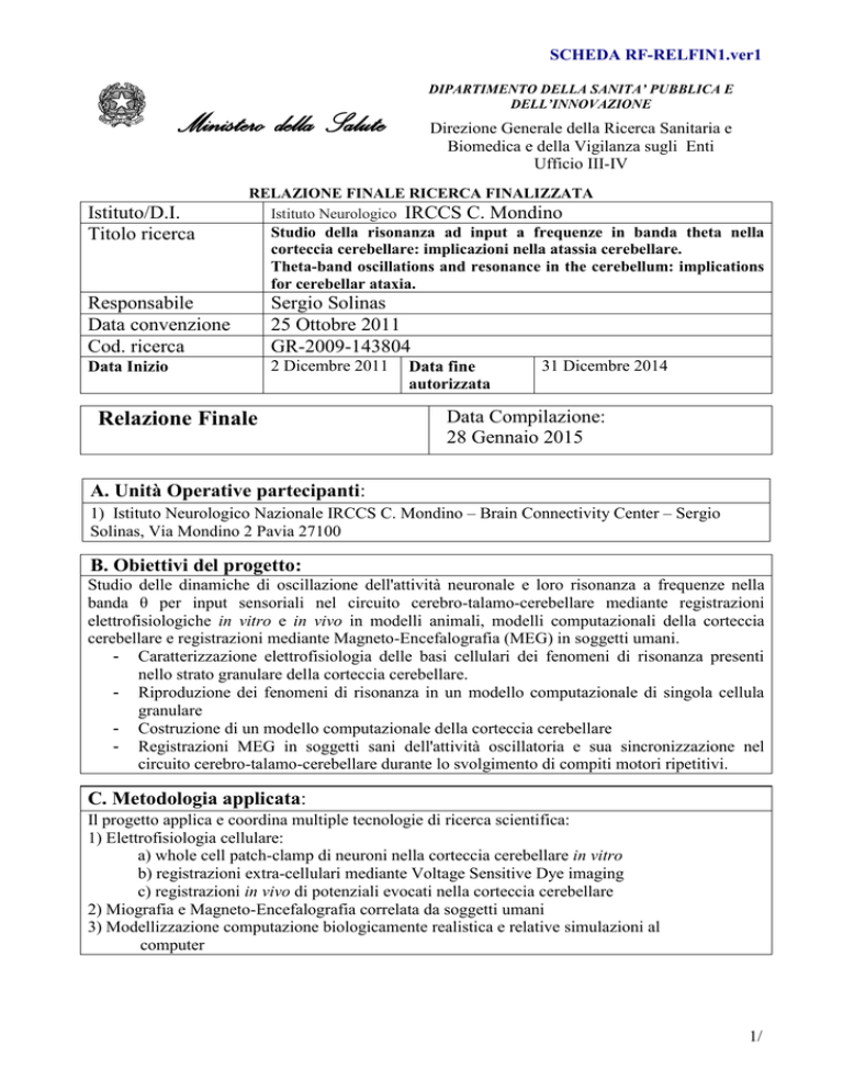 SCHEDA RF-RELFIN1.ver1 DIPARTIMENTO DELLA SANITA’ PUBBLICA E DELL’INNOVAZIONE Ministero della Salute Istituto/D.I. Titolo ricerca Direzione Generale della Ricerca Sanitaria e Biomedica e della Vigilanza sugli Enti Ufficio III-IV RELAZIONE FINALE RICERCA FINALIZZATA Istituto Neurologico IRCCS C. Mondino Studio della risonanza ad input a frequenze in banda theta nella corteccia cerebellare: implicazioni nella atassia cerebellare. Theta-band oscillations and resonance in the cerebellum: implications for cerebellar ataxia. Responsabile Data convenzione Cod. ricerca Sergio Solinas 25 Ottobre 2011 GR-2009-143804 Data Inizio 2 Dicembre 2011 Relazione Finale Data fine autorizzata 31 Dicembre 2014 Data Compilazione: 28 Gennaio 2015 A. Unità Operative partecipanti: 1) Istituto Neurologico Nazionale IRCCS C. Mondino – Brain Connectivity Center – Sergio Solinas, Via Mondino 2 Pavia 27100 B. Obiettivi del progetto: Studio delle dinamiche di oscillazione dell'attività neuronale e loro risonanza a frequenze nella banda θ per input sensoriali nel circuito cerebro-talamo-cerebellare mediante registrazioni elettrofisiologiche in vitro e in vivo in modelli animali, modelli computazionali della corteccia cerebellare e registrazioni mediante Magneto-Encefalografia (MEG) in soggetti umani. - Caratterizzazione elettrofisiologia delle basi cellulari dei fenomeni di risonanza presenti nello strato granulare della corteccia cerebellare. - Riproduzione dei fenomeni di risonanza in un modello computazionale di singola cellula granulare - Costruzione di un modello computazionale della corteccia cerebellare - Registrazioni MEG in soggetti sani dell'attività oscillatoria e sua sincronizzazione nel circuito cerebro-talamo-cerebellare durante lo svolgimento di compiti motori ripetitivi. C. Metodologia applicata: Il progetto applica e coordina multiple tecnologie di ricerca scientifica: 1) Elettrofisiologia cellulare: a) whole cell patch-clamp di neuroni nella corteccia cerebellare in vitro b) registrazioni extra-cellulari mediante Voltage Sensitive Dye imaging c) registrazioni in vivo di potenziali evocati nella corteccia cerebellare 2) Miografia e Magneto-Encefalografia correlata da soggetti umani 3) Modellizzazione computazione biologicamente realistica e relative simulazioni al computer 1/ SCHEDA RF-RELFIN1.ver1 Ministero della Salute DIPARTIMENTO DELLA SANITA’ PUBBLICA E DELL’INNOVAZIONE Direzione Generale della Ricerca Sanitaria e Biomedica e della Vigilanza sugli Enti Ufficio III-IV D. Risultati ottenuti complessivi e delle singole unità operative: D.1. Risultati Complessivi La corteccia cerebellare filtra la maggior parte dei suoi input attraverso il suo strato granulare nel quale le cellule granulari costituiscono il canale di trasmissione dei segnali afferenti e le cellule del Golgi esercitano una operazione di controllo dinamico su tale canale (D’Angelo et al. 2013). Gli esperimenti di elettrofisiologia in vitro e in vivo eseguiti sullo strato granulare della corteccia cerebellare hanno evidenziato la presenza di dinamiche di risonanza alle frequenze di ripetizione degli stimoli delle fibre afferenti. Le cellule granulari mostrano un chiaro picco nell'intensità della loro risposta agli stimoli quando attivate alle frequenze comprese tra 5 Hz e 7 Hz. I protocolli sperimentali sono stati ricostruiti nelle simulazioni computazionali e hanno permesso di rilevare anche nei modelli computazionali la presenza di dinamiche di risonanza. L'uso dei modelli ha fornito uno strumento in grado di identificare l'origine delle dinamiche di risonanza nell'interazione dinamica della attivazione e inattivazione di specifici canali ionici presenti nelle cellule granulari (Gandolfi et al. 2013). Il modello dello strato granulare è stato completato e validato mediante il confronto con i dati sperimentali registrati mediante la tecnica di Voltage Sensitive Dye Imaging riproducendo i dati precedentemente pubblicati (Mapelli et al. 2010a,b). Il modello ha permesso di indurre dinamiche di oscillazione e risonanza nella ricostruzione computazionale della rete dello strato granulare. Lo studio delle dinamiche di risonanza è stato esteso anche al modello della cellula del Purkinje (Masoli et al. 2015) mostrandone l’attitudine ad amplificare segnali con frequenze in banda θ. Inoltre, la modellizzazione della cellula stellata dello strato molecolare ha permesso di completare la modellizzazione di tutto il circuito della corteccia cerebellare. Durante lo svolgimento del progetto è stata compiuta la modellizzazione della Unipolar Brush cell che verrà successivamente inclusa nel modello dello strato granulare. L'attività cerebrale e cerebellare di 4 soggetti sani di sesso maschile è stata registrata mediante un apparto di Magneto-Encefalografia (MEG, 275 channels - VSM, Vancouver Canada) contemporaneamente a registrazioni elettromiografiche dei muscoli flessori ed estensori delle dita. L'analisi dati mostra attività cerebellare nelle frequenze della banda θ in relazione al movimento ritmico del dito indice (finger tapping task). D.2 Risultati Singole UO: Il progetto è stato sviluppato da una singola UO. E. Abstract Ricerca per la pubblicazione Internet La presenza di oscillazioni nell’attività della corteccia cerebrale e cerebellare in relazione a specifici stati funzionali è supportata da molteplici evidenze sperimentali (Buzsáki, 2006, Ros et al. 2009). In particolare, le registrazioni mediante Magneto-Encefalografia (MEG) hanno collegato lo svolgimento di semplici movimenti delle dita o delle mani ad attività oscillatorie del circuito cerebellare in banda θ sincronizzate con diverse aree cerebrali, tra cui aree motorie primarie e aree premotorie (Gross et al., 2002; Pollok et al., 2005). La cooperazione del cervelletto in sincronia con le altre aree cerebrali all’interno del loop Cortico-Cerebellare (CCL) potrebbe essere un requisito fondamentale per il funzionamento dell’intero circuito. In presen