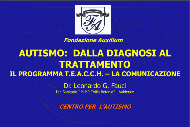 Fondazione Auxilium AUTISMO: DALLA DIAGNOSI AL TRATTAMENTO IL PROGRAMMA T.E.A.C.C.H. – LA COMUNICAZIONE Dr. Leonardo G. Fauci Dir. Sanitario I.M.P.P. “Villa Betania” – Valderice CENTRO PER L’AUTISMO AUTISMO: LA STORIA Inizio ‘900: prime descrizioni nei bambini di disturbi simili a quelli dell’autismo ed introdotti con il nome di psicosi infantili (Melanie Klein anni ‘30); 1943: Leo Kanner (Usa/D) descrive un quadro da lui definito “autismo infantile precoce” in 11 bambini; 1944: Hans Asperger (A) pubblica un articolo per descrivere le caratteristiche peculiari dei soggetti autistici; AUTISMO: LA STORIA Negli anni ‘50 Gilbert Lelord (F) contrappone gli studi neurofisiologici sull’autismo alla psicologia analitica di cui fu forte assertore Bruno Bettelheim (psicoanalista A-Usa) Negli anni ’60 Bettelheim attribuiva la causa dell’autismo ad un rapporto inadeguato con la madre (la cosiddetta madre frigorifero), da cui si doveva essere staccati per una terapia riabilitativa (la cosiddetta parentectomia) che viene oggi considerata superata. AUTISMO: LA STORIA Dopo gli anni ‘60 Ivar Lovaas (psicologo Usa) inizia ad applicare i principi e le metodologie della psicologia comportamentale all’autismo dopo l’esperienza degli studi di Pavlov (riflessi condizionati) e di Skinner (importanza del rinforzo nel condizionare un comportamento). Nel 1968 con Baer, Wolf e Risley nasce il termine ABA (Applied Behavior Analysis = Analisi Applicata del Comportamento) per indicare interventi della psicologia comportamentale. AUTISMO: LA STORIA Nello stesso periodo e sulle stesse basi della teoria comportamentale dell’ABA anche l’approccio T.E.A.C.C.H. (Treatment and Education of Autistic and related Comunication Handicapped Children = Trattamento ed Educazione di Bambini con Autismo e Disabilità della Comunicazione) grazie ai contributi di Eric Schopler ed i suoi collaboratori. AUTISMO: LA STORIA Medicine definite alternative e non convenzionali Nei primi anni ‘90 Bernard Rimland, psicologo padre di un autistico, rivoluziona l’approccio alla terapia con il protocollo DAN (= sconfiggi l’autismo ora !), non senza provocare dubbi e perplessità nel mondo scientifico Diete alimentare priva di glutine e caseina, integratori vitaminici AUTISMO: DEFINIZIONE nel 2013 DSM V “Diagnostic and Statistical Manual of Mental Disorders” Nuovo nome alla categoria : DISTURBI DELLO SPETTRO AUTISTICO comprende: - Disturbo autistico (autismo) - Sindrome di Asperger AUTISMO: DEFINIZIONE nel 2013 DSM V “Diagnostic and Statistical Manual of Mental Disorders” - Disturbo disintegrativo dell’infanzia - Disturbi pervasivi dello sviluppo non altrimenti specificati AUTISMO: aspetti biologici Sono state proposte numerose teorie e spiegazioni sulle cause dei Disturbi dello Spettro Autistico. Negli ultimi anni una parziale convergenza si è avuta sull' idea della multifattorialità delle cause, sia di tipo organico-genetico sia di carattere psicologico- ambientale. AUTISMO: aspetti biologici L’ipotesi organica è quello più accreditabile, anche se solo in una parte dei bambini autistici, circa il 50 %, presenta un disturbo di tipo neurologico evidenziabile. AUTISMO: aspetti biologici I NEURONI SPECCHIO Alcune aree del nostro cervello, normalmente deputate a guidare il movimento, sono dotate di “neuroni specchio”. Il neurone specchio è un neurone specifico che si attiva sia quando si compie un'azione sia quando la si osserva mentre è compiuta da altri. Nell'uomo sono localizzati nell'area di Broca e nella corteccia parietale inferiore del cervello. AUTISMO: aspetti biologici I NEURONI SPECCHIO Il malfunzionamento dei neuroni specchio sembra sia alla base del principale deficit dell’autismo. Nella RM funzionale di soggetti autistici è evidenziabile una scarsa attività nelle aree dove sono presenti solitamente i neuroni specchio. AUTISMO: aspetti biologici In alcuni casi la patologia autistica è una conseguenza di altre malattie organiche, quali per esempio, la sclerosi tuberosa, la fenilchetonuria, alcune malattie neurocutanee (per es. la ipomelanosi di Ito), la rosolia intrauterina e altre. AUTISMO: aspetti biologici Una piccola percentuale di casi di bambini autistici presenta anche una sindrome cromosomica, la più diffusa delle quali è quella nota come X fragile. Nel 25-30% dei casi di autismo si verificano, nel corso della vita, crisi epilettiche. AUTISMO: aspetti biologici In letteratura sono presenti riferimenti che conducono, una parte dei disturbi autistici, ad intolleranze alimentari. AUTISMO: alterazioni funzionali Il 20-65% degli EEG di bambini autistici sono anomali (rallentamento focale, punte, scariche parossistiche p-o). C'è una correlazione negativa tra QI e possibilità che si sviluppino crisi epilettiche. AUTISMO: alterazioni strutturali Analisi di tipo morfometrico forniscono dati contrastanti. La maggior parte delle ricerche condotte con la TAC o la RM mostrano una prevalenza di simmetria o asimmetria emisferica invertita a livello delle zone parieto – occipitali, con regioni destre più sviluppate delle sinistre in soggetti autistici. AUTISMO: alterazioni strutturali Studi con la RM indicano la presenza nei bambini con sindrome autistica di alterazioni a livello del cervelletto. AUTISMO: alterazioni strutturali E stata segnalata, in studi sui cervelli di pazienti autistici, l’immaturità di alcune cellule nervose che non sono migrate verso la loro normale destinazione. Probabilmente capita nelle ultime fasi dello sviluppo del cervello, quando vengono messe a punto le ultime connessioni tra cellule cerebrali che definiscono la rete di comunicazione del cervello maturo. AUTISMO: alterazioni strutturali Il disturbo che provoca l'autismo infantile sarebbe il risultato di mutazioni genetiche, riferibili a diversi cromosomi (> 2 e 7) AUTISMO: caratteristiche • Assenza o riduzione del gioco immaginativo e sociale • Ridotta capacità di fare amicizia con i c
