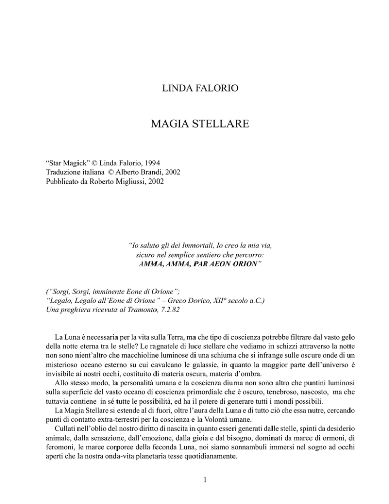 LINDA FALORIO MAGIA STELLARE “Star Magick” © Linda Falorio, 1994 Traduzione italiana © Alberto Brandi, 2002 Pubblicato da Roberto Migliussi, 2002 “Io saluto gli dei Immortali, Io creo la mia via, sicuro nel semplice sentiero che percorro: AMMA, AMMA, PAR AEON ORION” (“Sorgi, Sorgi, imminente Eone di Orione”; “Legalo, Legalo all’Eone di Orione” – Greco Dorico, XII° secolo a.C.) Una preghiera ricevuta al Tramonto, 7.2.82 La Luna è necessaria per la vita sulla Terra, ma che tipo di coscienza potrebbe filtrare dal vasto gelo della notte eterna tra le stelle? Le ragnatele di luce stellare che vediamo in schizzi attraverso la notte non sono nient’altro che macchioline luminose di una schiuma che si infrange sulle oscure onde di un misterioso oceano esterno su cui cavalcano le galassie, in quanto la maggior parte dell’universo è invisibile ai nostri occhi, costituito di materia oscura, materia d’ombra. Allo stesso modo, la personalità umana e la coscienza diurna non sono altro che puntini luminosi sulla superficie del vasto oceano di coscienza primordiale che è oscuro, tenebroso, nascosto, ma che tuttavia contiene in sé tutte le possibilità, ed ha il potere di generare tutti i mondi possibili. La Magia Stellare si estende al di fuori, oltre l’aura della Luna e di tutto ciò che essa nutre, cercando punti di contatto extra-terrestri per la coscienza e la Volontà umane. Cullati nell’oblio del nostro diritto di nascita in quanto esseri generati dalle stelle, spinti da desiderio animale, dalla sensazione, dall’emozione, dalla gioia e dal bisogno, dominati da maree di ormoni, di feromoni, le maree corporee della feconda Luna, noi siamo sonnambuli immersi nel sogno ad occhi aperti che la nostra onda-vita planetaria tesse quotidianamente. 1 Al contempo, coscienti di essi o no, nuovi e sottili correnti, corrosivi raggi stellari di sistemi alieni continuano a bombardarci e a penetrare la ragnatela terrestre, emanando strane e rare frequenze pulsanti, colorando le nostre percezioni con tinte ultraterrene, adescando menti non ancora formate in dimensioni fino ad ora mai sognate. Il filo della storia umana è segnato da racconti di contatti con entità e realtà trans-mondane, come angeli, demoni, dee e dei, intelligenze disincarnate, ET, UFO e fiabe popolari di origine divina, ovvero extraterrestre. Ne esistono numerose documentazioni: la Bibbia, il Necronomicon, “Una Relazione Fedele e Veritiera” di Dee e Kelly, “La Sacra Magia di Abramelin il Mago”, il Liber AL. Similmente, i Miti di CTHULHU, scaturiti da sogni inquietanti, evocano possentemente la presenza di vaste Intelligenze aliene che, in un tempo precedente alla nascita dell’umanità, avevano influenza sulla nostra terra, e le cui origini rimangono oscure, dei cui destini poco possiamo comprendere ma che eternamente tentano di penetrare la nostra onda-vita. E che persino adesso si stanno curvando verso il nostro spazio-tempo, ascoltando, osservando. Coloro la cui coscienza è legata alla ragnatela vitale terrestre, non sintonizzati con le correnti stellari, possono ritenere “malvagie” queste energie od influenze all’Esterno del nostro piccolo mondo. Al contempo c’è urgenza, un potere ed una possibilità di evoluzione nell’attuale dischiudersi delle nostre aure verso queste primeve correnti di coscienza, verso questi viticci sottili di consapevolezza, e verso queste strane geometrie delle mente che fluiscono da distanti stelle aliene. C’è possibilità e potere nel cercare contatti con quelle Intelligenze trans-mondane che dimorano mutamente nella vastità dell’oscuro spazio tra le stelle. La tabella di marcia di un contatto extraterrestre si è rapidamente compressa con l’aumento vertiginoso della popolazione umana. La coscienza umana si è moltiplicata, accelerando ad un ritmo che presto si volgerà verso l’exo-sistema planetario ed attiverà la coscienza della dormiente e sognante Gaia, mentre ci avviciniamo ogni giorno di più verso l’Assemblea delle Stelle. Le origini della Magia Stellare giacciono nell’Africa Occidentale. Il Mistero di Sirio parla della tribù dei Dogon del Mali, con la loro complessa mitologia di contatto ancestrale con esseri extraterrestri dal sistema binario, Sirio. Sirio, che appare significativamente nella comunicazione personale di Aleister Crowley con intelligenze trans-mondane: Amalantarah, Aiwass, Abul-Diz, LAM. Sirio, la Stella-Cane, la Stella del Dio Oscuro Set, che appare significativamente anche negli scritti magici di Kenneth Grant. In “Hecate’s Fountain” Kenneth Grant parla del pianeta Emme-Ya nel sistema di Sirio come del luogo di origine dei Loa, gli dei e le dee del Voudoo, e degli Orisha della tradizione Yoruba, che sono “attualmente interessati ad infiltrare l’aura della terra”. I Dogon conoscono Emme Ya – la Stella delle Donne – come il pianeta della loro dea primordiale, l’Orisha Yemoja. Madre di tutte le dee e dei africani, il Suo nome –“Madre dei Pesci”- richiama antiche leggende degli anfibi Nommo, potenti esseri di statura divina, che portarono la civiltà sulla terra dal sistema di Sirio, e che i Babilonesi conoscevano come Musari. Il Voudoo è una religione di possessione. I suoi praticanti aprono i cancelli ai Contatti Stellari, ed invitano le dee e gli dei a salire su di loro e possederli, a scendere sulle loro teste e cavalcarli. In questo modo comunicano intimamente con i loro dei, i Loa, contattando, direttamente nel presente magico, l’antico flusso di coscienza che per primo penetrò questo pianeta dall’Esterno. Nella pratica tradizionale del Voudoo, l’uso dei vevè - disegni magici e lineari usati per identificare, onorare ed evocare gli dei – nasce dall’antico ricordo dei disegni impiantati nelle cellule, nel sangue e nelle ossa, dei sigilli in uso tempo addietro per stabilire un contatto terreno con i flussi stellari senzienti. Nel corso di lunghe età i Loa hanno rappresentato i C