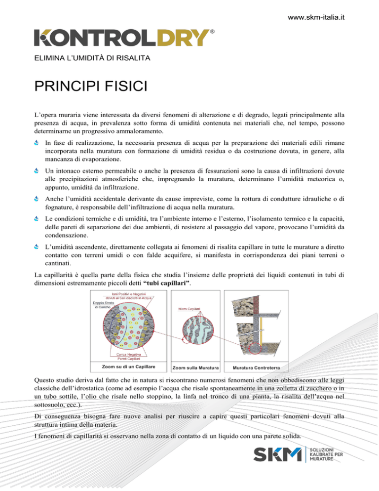 www.skm-italia.it ELIMINA L’UMIDITÀ DI RISALITA PRINCIPI FISICI L’opera muraria viene interessata da diversi fenomeni di alterazione e di degrado, legati principalmente alla presenza di acqua, in prevalenza sotto forma di umidità contenuta nei materiali che, nel tempo, possono determinarne un progressivo ammaloramento. In fase di realizzazione, la necessaria presenza di acqua per la preparazione dei materiali edili rimane incorporata nella muratura con formazione di umidità residua o da costruzione dovuta, in genere, alla mancanza di evaporazione. Un intonaco esterno permeabile o anche la presenza di fessurazioni sono la causa di infiltrazioni dovute alle precipitazioni atmosferiche che, impregnando la muratura, determinano l’umidità meteorica o, appunto, umidità da infiltrazione. Anche l’umidità accidentale derivante da cause impreviste, come la rottura di condutture idrauliche o di fognature, è responsabile dell’infiltrazione di acqua nella muratura. Le condizioni termiche e di umidità, tra l’ambiente interno e l’esterno, l’isolamento termico e la capacità, delle pareti di separazione dei due ambienti, di resistere al passaggio del vapore, provocano l’umidità da condensazione. L’umidità ascendente, direttamente collegata ai fenomeni di risalita capillare in tutte le murature a diretto contatto con terreni umidi o con falde acquifere, si manifesta in corrispondenza dei piani terreni o cantinati. La capillarità è quella parte della fisica che studia l’insieme delle proprietà dei liquidi contenuti in tubi di dimensioni estremamente piccoli detti “tubi capillari”. Questo studio deriva dal fatto che in natura si riscontrano numerosi fenomeni che non obbediscono alle leggi classiche dell’idrostatica (come ad esempio l’acqua che risale spontaneamente in una zolletta di zucchero o in un tubo sottile, l’olio che risale nello stoppino, la linfa nel tronco di una pianta, la risalita dell’acqua nel sottosuolo, ecc.). Di conseguenza bisogna fare nuove analisi per riuscire a capire questi particolari fenomeni dovuti alla struttura intima della materia. I fenomeni di capillarità si osservano nella zona di contatto di un liquido con una parete solida. www.skm-italia.it ELIMINA L’UMIDITÀ DI RISALITA PRINCIPI FISICI Se si immerge un tubo sottile in un liquido, il suo livello può risultare più alto o più basso di quello della superficie libera all’esterno del tubo a secondo che il liquido dentro il tubo si attacchi alla parete, come nel caso dell’acqua o non si attacchi alla parete, come il caso del mercurio. Si suol dire anche che nel primo caso il liquido bagna il tubo, nel secondo non bagna. Il motivo per cui si sperimenta questo fenomeno è dovuto alle forze di adesione e coesione che si manifestano tra le molecole del liquido e tra queste e la superficie interna dei capillari. La grandezza fisica che descrive queste interazioni è nota come “tensione superficiale” e dipende molto dal sistema liquido-solido che si considera. Nel caso di acqua all’interno di tubi capillari si viene a creare una tensione superficiale γ che tende ad attirare le molecole di H2O verso l’alto fino a quando non viene contrastata dall’azione della gravità terrestre, raggiungendo così un’altezza h che può essere calcolata tramite la seguente formula di Jurin: h= 2 cos rg γ = tensione superficiale all’interfaccia acqua/superficie interna capillare; θ = angolo formato tra la direzione di γ e la superficie; ρ = densità dell’acqua; g = costante gravitazionale; r = raggio del capillare. L’angolo θ è detto angolo di bagnabilità e, nel caso dell’acqua a contatto con i capillari, assume valori minori di 90° (mentre nel caso del mercurio assume valori superiori a 90° comportando valori di h negativi e quindi un caso di liquido che non bagna la superficie). Il livello h dipende, anche, dalla tensione superficiale che, a sua volta, dipende, dalla temperatura e dalla concentrazione salina del liquido. Ciò spiega, a parità degli altri parametri, il diverso livello h raggiunto dall’acqua in funzione dell’esposizione della muratura in questione e del grado di concentrazione salina che ha l’acqua nella muratura. Il solo fenomeno della capillarità non è sufficiente a spiegare l’umidità di risalita. Infatti teoricamente, tramite la formula di Jurin si trovano altezze h anche di 10 metri e più, cosa che nella www.skm-italia.it ELIMINA L’UMIDITÀ DI RISALITA PRINCIPI FISICI realtà non trova riscontro (infatti si sperimentano altezze che non superano i 2-3 metri). Per spiegare questa discrepanza bisogna considerare anche un fenomeno di evaporazione in coesistenza con il fenomeno della risalita capillare: l’acqua in prossimità delle superfici esterne della muratura tende ad evaporare mentre altra acqua proveniente dal basso va a rimpiazzare quella evaporata, istaurando così un equilibrio dinamico che a sua volta determina la reale altezza raggiunta dall’acqua di risalita. Un altro fattore che influenza il livello di risalita dell'umidità, meno conosciuto ma molto determinante è il Potenziale Elettrico del muro. Il “fluire” della componente acquosa all’interno della muratura, dovuto ai continui fenomeni di evaporazione, genera una corrente liquida all’interno della muratura. A questo flusso è associato un fenomeno elettrocinetico che genera una differenza di potenziale elettrico all’interno del setto poroso (la muratura). Ciò è confermato dall’esperienza, e dimostra che quando un muro è umido assume una caratteristica elettrica. Interviene poi un altro fenomeno, di forza maggiore, dovuto alla presenza di deboli terminazioni negative O(forze di Van Der Waals) sulle superfici interne dei capillari (caratteristica comune per i materiali da costruzione a base di silicati), che attraggono e “legano” gli ioni positivi (primo strato), che a loro volta attirano gli ioni negativi (secondo strato) presenti nell’acqua (ch