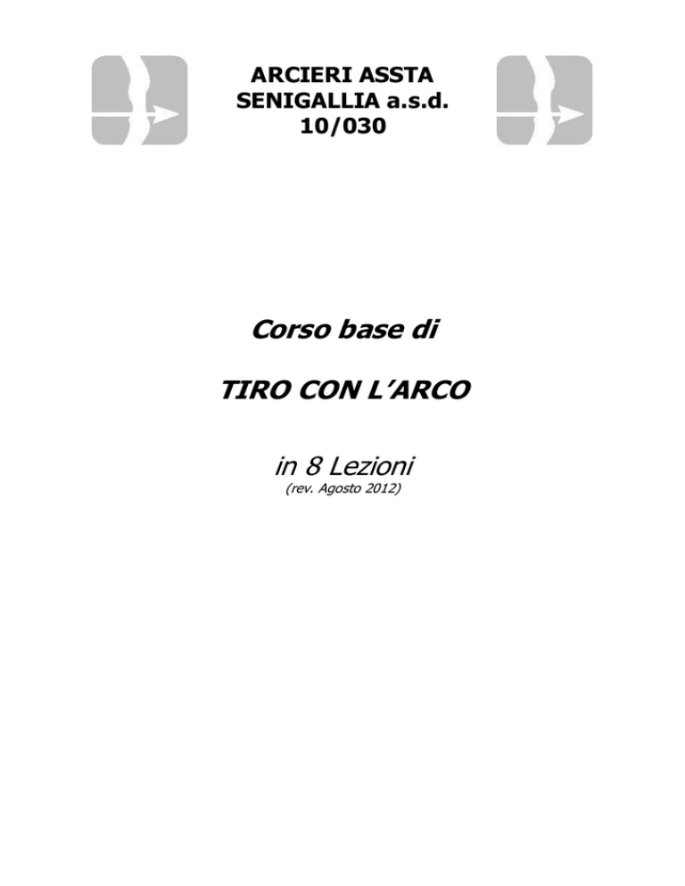 ARCIERI ASSTA SENIGALLIA a.s.d. 10/030 Corso base di TIRO CON L’ARCO in 8 Lezioni (rev. Agosto 2012) ARCIERI ASSTA SENIGALLIA a.s.d. 10/030 Premessa: Scopo del corso di base è l’apprendimento dei fondamentali del tiro con l’arco, la conoscenza delle norme di sicurezza e quant’altro occorra per svolgere questo sport in maniera facile, divertente e redditizia. E’ consigliabile utilizzare scarpe da ginnastica ed abiti aderenti. Nel corso si lavorerà sulla postura e gli equilibri verticali, sugli allineamenti dell’asse orizzontale, sulla dinamica del tiro fino a dare all’allievo una sufficiente indipendenza nella gestione del tiro. Verranno inoltre esposti i vari tipi di arco e le relative tecniche usate nel tiro sportivo per consentire al praticante una scelta consapevole in base alle proprie inclinazioni. L’associazione mette a disposizione l’intera attrezzatura per tutta la durata del corso in maniera gratuita. Gli istruttori sono a disposizione anche dopo la fine del corso per assistere l’allievo nel seguito dell’attività. E ora, buon divertimento … 2 ARCIERI ASSTA SENIGALLIA a.s.d. 10/030 Contenuti: Lezione 1 Lezione 2 Lezione 3 Lezione 4 Lezione 5 Lezione 6 Lezione 7 Lezione 8 PRESENTAZIONE DEL CORSO NORME DI SICUREZZA MATERIALI RISCALDAMENTO E STRETCHING I PRIMI TIRI TIRO AD ARCO NUDO: CONTATTI AL VISO POSTURA ED EQUILIBRI VERTICALI VERIFICA POSTURA ED EQUILIBRI VERTICALI LA MANO DELLA CORDA E LA MANO DELL’ARCO SEQUENZA COMPLETA DEL TIRO ARCHI E ATTREZZATURE ALLINEAMENTI ORIZZONTALI VERIFICA ALLINEAMENTI ORIZZONTALI TIRO AD ARCO OLIMPICO: CONTATTI AL VISO DINAMICA DI TIRO GARE E STILI DI TIRO DINAMICA DI TIRO VERIFICHE GARA TRA ALLIEVI CONCLUSIONI 3 ARCIERI ASSTA SENIGALLIA a.s.d. 10/030 Corso base di tiro con l’arco Lezione 1 Norme sulla sicurezza Pratica questa disciplina in aree appositamente attrezzate, recintate o con reti battifreccia o terrapieni dietro ai bersagli. (Le aree autorizzate da società iscritte alla Federazione Italiana Tiro con l’Arco sono coperte da assicurazione). E’ possibile tirare solo dall’apposita linea di tiro e su un bersaglio perpendicolare ad essa; L’allievo di un corso base potrà tirare solo dietro il via dell’ istruttore o di un assistente; la fine dei tiri sarà segnalata dal medesimo istruttore. La freccia va posizionata sull’arco solo sulla linea di tiro. In nessun caso è possibile tirare se qualcuno è ancora tra la linea di tiro ed i bersagli. Sulla linea di tiro non interferire con i tiratori a fianco, evitare movimenti laterali e non girare su stessi. Nella raccolta delle frecce non correre verso il paglione, la cocca di una freccia può essere pericolosa. Se devi raccogliere una freccia caduta davanti al paglione, presta attenzione a quelle sul bersaglio. Quando estrai le frecce dal paglione tieni una mano su di esso per evitare che ti cada addosso; controlla che non ci sia nessuno dietro di te, eviterai di colpirlo! Controlla frequentemente l’attrezzatura (una freccia danneggiata, una cocca rotta o materiale danneggiato, possono causare danni a se stessi o ad altri) 4 ARCIERI ASSTA SENIGALLIA a.s.d. 10/030 Lezione 1 ARCIERE DESTRO O SINISTRO: GESTUALITA’ E OCCHIO DOMINANTE Per stabilire se un allievo tirerà con arco destro o sinistro occorre rilevare la gestualità dominante e determinare l’occhio dominante. Per occhio dominante si intende quello che prevale nella mira. Per determinare l’ occhio dominante si può creare un cerchio chiuso con le due mani tenendo le braccia tese in avanti. Dopo aver fissato un punto davanti a noi qualche metro, avvicinare le mani al volto che si dirigeranno verso il nostro occhio dominante. Un altro metodo consiste nel distendere un braccio sollevando il pollice verso un punto davanti a noi qualche metro; traguardare il pollice ed il punto con entrambi gli occhi aperti. Chiudere alternativamente l’occhio destro e l’occhio sinistro; l’occhio aperto che manterrà il pollice sul punto sarà l’occhio dominante. Nel caso la gestualità dominante sia diversa dall’occhio dominante si tende a preferire la gestualità. Stabilito per esempio che il nostro arco sarà destro, si userà la sinistra come mano dell’arco e la destra come mano della corda. 5 ARCIERI ASSTA SENIGALLIA a.s.d. 10/030 Lezione 1 ASSEGNAZIONE DEL MATERIALE INDIVIDUALE Arco: destro □ sinistro □ - numero: _____ altezza _____ pollici – potenza: _____ libbre Paraseno □ Dragona □ - Parabraccio □ - Faretra □ - Patella □ - Frecce □ MONTAGGIO DELL’ARCO 6 ARCIERI ASSTA SENIGALLIA a.s.d. 10/030 CONOSCENZA DEL MATERIALE Lezione 1 Unità di misura In arcieria sono usate prevalentemente unità di misura anglosassoni. Di seguito indichiamo le più comunemente utilizzate. Lunghezza 1 Pollice (“ o in) = 2.54 centimetri Peso 1 Libbra (lb) = 0.454 chilogrammi Peso 1 Grano (gr) = 0.065 grammi Velocità 1 Piede al secondo (fps) = 0.305 metri al secondo 7 ARCIERI ASSTA SENIGALLIA a.s.d. 10/030 Lezione 1 RISCALDAMENTO Il riscaldamento viene effettuato prima della seduta di tiro. Attiva le articolazioni interessate, migliora la prestazione e previene gli infortuni. STRETCHING Lo stretching o allungamento muscolare segue il riscaldamento e chiude la seduta di tiro. Attiva le articolazioni interessate, migliora la prestazione e previene gli infortuni. 8 ARCIERI ASSTA SENIGALLIA a.s.d. 10/030 Lezione I PRIMI TIRI 1 La sequenza di tiro può essere suddivisa nelle seguenti fasi: 9 ARCIERI ASSTA SENIGALLIA a.s.d. 10/030 Lezione 1 10 ARCIERI ASSTA SENIGALLIA a.s.d. 10/030 Corso base di tiro con l’arco Lezione 2 TIRO AD ARCO NUDO: CONTATTI AL VISO Sistemi di mira In linea (tiro apache) A triangolo (tiro mongolo o ad arco nudo) A quadrilatero (tiro olimpico) 11 ARCIERI ASSTA SENIGALLIA a.s.d. 10/030 Lezione POSTURA ED EQUILIBRI VERTICALI 2 12 ARCIERI ASSTA SENIGALLIA a.s.d. 10/030 Lezione 2 13 ARCIERI ASSTA SENIGALLIA a.s.d. 10/030 Corso base di tiro con l’arco Lezione VERIFICA POSTURA ED EQU