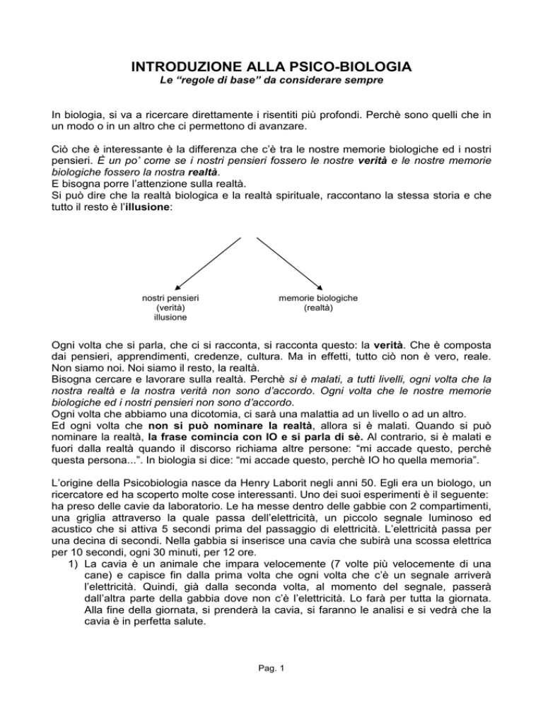 INTRODUZIONE ALLA PSICO-BIOLOGIA Le “regole di base” da considerare sempre In biologia, si va a ricercare direttamente i risentiti più profondi. Perchè sono quelli che in un modo o in un altro che ci permettono di avanzare. Ciò che è interessante è la differenza che c’è tra le nostre memorie biologiche ed i nostri pensieri. È un po’ come se i nostri pensieri fossero le nostre verità e le nostre memorie biologiche fossero la nostra realtà. E bisogna porre l’attenzione sulla realtà. Si può dire che la realtà biologica e la realtà spirituale, raccontano la stessa storia e che tutto il resto è l’illusione: nostri pensieri (verità) illusione memorie biologiche (realtà) Ogni volta che si parla, che ci si racconta, si racconta questo: la verità. Che è composta dai pensieri, apprendimenti, credenze, cultura. Ma in effetti, tutto ciò non è vero, reale. Non siamo noi. Noi siamo il resto, la realtà. Bisogna cercare e lavorare sulla realtà. Perchè si è malati, a tutti livelli, ogni volta che la nostra realtà e la nostra verità non sono d’accordo. Ogni volta che le nostre memorie biologiche ed i nostri pensieri non sono d’accordo. Ogni volta che abbiamo una dicotomia, ci sarà una malattia ad un livello o ad un altro. Ed ogni volta che non si può nominare la realtà, allora si è malati. Quando si può nominare la realtà, la frase comincia con IO e si parla di sè. Al contrario, si è malati e fuori dalla realtà quando il discorso richiama altre persone: “mi accade questo, perchè questa persona...”. In biologia si dice: “mi accade questo, perchè IO ho quella memoria”. L’origine della Psicobiologia nasce da Henry Laborit negli anni 50. Egli era un biologo, un ricercatore ed ha scoperto molte cose interessanti. Uno dei suoi esperimenti è il seguente: ha preso delle cavie da laboratorio. Le ha messe dentro delle gabbie con 2 compartimenti, una griglia attraverso la quale passa dell’elettricità, un piccolo segnale luminoso ed acustico che si attiva 5 secondi prima del passaggio di elettricità. L’elettricità passa per una decina di secondi. Nella gabbia si inserisce una cavia che subirà una scossa elettrica per 10 secondi, ogni 30 minuti, per 12 ore. 1) La cavia è un animale che impara velocemente (7 volte più velocemente di una cane) e capisce fin dalla prima volta che ogni volta che c’è un segnale arriverà l’elettricità. Quindi, già dalla seconda volta, al momento del segnale, passerà dall’altra parte della gabbia dove non c’è l’elettricità. Lo farà per tutta la giornata. Alla fine della giornata, si prenderà la cavia, si faranno le analisi e si vedrà che la cavia è in perfetta salute. Pag. 1 2) Secondo esperimento. Si mettono nella gabbia 2 cavie e si chiude la parete. Si fa passare l’elettricità allo stesso ritmo. Le cavie sono obbligate a subire l’elettricità perché non possono passare dall’altra parte. Allora, al momento del segnale, si raddrizzano su 2 zampe e cominciano a combattere. Ogni volta che arriva la scossa elettrica, esse combattono tra di loro. Quando si fanno le analisi alla fine della giornata, risultano in piena salute. 3) Terzo esperimento. Una cavia dentro la gabbia, la porta è chiusa ed è costretta a subire l’elettricità senza poter fare nulla. Alla fine della giornata, dalle analisi risultano tutti i tassi fuori posto: la cavia è malata. Con questo esperimento, Laborit ha dimostrato che quando si ha un problema importante, se possiamo fuggire non ci ammaliamo. Se possiamo combattere, non ci ammaliamo. Se non possiamo nè fuggire nè combattere, ci ammaliamo. Quindi, quando si è nell’inibizione dell’azione ci si ammala. Perchè non possiamo dare una risposta. Se non diamo una risposta, siamo in uno stato di stress grave e, in queste condizioni, accadono delle cose particolari: 1. Intanto, la nostra biologia mette in moto tutti i segnali di allarme. È come se viaggiassimo con l’aria tirata in macchina: si consuma moltissima energia. 2. Il secondo problema è che tutti i nostri recettori esterni, che normalmente ci danno segnali di avvertimento e permettono di evitare incidenti, in caso di eccesso di stress sono rivolti al problema ed è proprio in quel momento che possono capitare degli incidenti o qualcosa del genere. Che cosa succede? Abbiamo vissuto qualcosa che ci mette in una situazione di stress, a cui pensiamo tutta la giornata ed a volte anche per parecchio tempo. Si mangia meno bene, si dorme meno bene. Si è in conflitto. C’è qualcosa che dobbiamo risolvere e che non riusciamo a risolvere. Se il pensiero non può risolverlo, se le azioni non possono risolverlo. Se non si può fuggire, nè combattere, si è nella INIBIZIONE DELL’AZIONE. Allora, il cervello biologico deve dare una risposta. Perché, altrimenti, si muore. Quindi, quando c’è un avvenimento che ci mette in stress il nostro cervello deve dare una risposta. Ma poiché il cervello gestisce tutte le funzioni, esso non può occuparsi solo di questo problema. Allora, delegherà la gestione del conflitto ad uno specifico gruppo di neuroni. Esso isolerà tale gruppo di neuroni che prenderà in carico il controllo di questo stress. Questo ha tutta una serie di effetti: il più importante è che questo gruppo di neuroni gestisce un tessuto ed anche un comportamento. Si potrà avere quindi una modificazione a livello del tessuto e del comportamento: gruppo di neuroni particolari comportamento particolare tessuto particolare Pag. 2 Dunque, la sequenza è: dall’avvenimento/conflitto Ö al gruppo di neuroni Ö al tessuto/comportamento Se sappiamo quale è il tessuto, possiamo anche conoscere il comportamento e viceversa. Che cosa porta il nostro cervello ad isolare un certo gruppo particolare di neuroni? Non è l’avvenimento in sè, ma è il modo in cui lo si è RISENTITO. E questa è la cosa più importante. La seconda cosa importante è che tutto questo meccanismo di funzionamento ha un senso, non è 