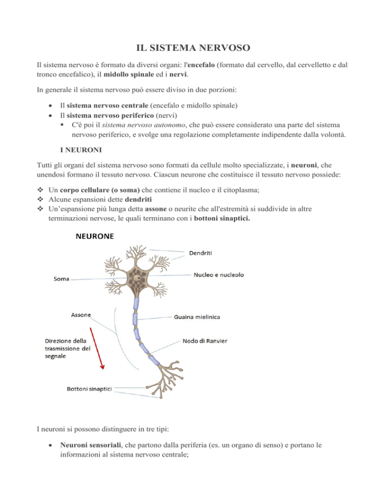 IL SISTEMA NERVOSO Il sistema nervoso è formato da diversi organi: l'encefalo (formato dal cervello, dal cervelletto e dal tronco encefalico), il midollo spinale ed i nervi. In generale il sistema nervoso può essere diviso in due porzioni: • • Il sistema nervoso centrale (encefalo e midollo spinale) Il sistema nervoso periferico (nervi) C'è poi il sistema nervoso autonomo, che può essere considerato una parte del sistema nervoso periferico, e svolge una regolazione completamente indipendente dalla volontà. I NEURONI Tutti gli organi del sistema nervoso sono formati da cellule molto specializzate, i neuroni, che unendosi formano il tessuto nervoso. Ciascun neurone che costituisce il tessuto nervoso possiede: Un corpo cellulare (o soma) che contiene il nucleo e il citoplasma; Alcune espansioni dette dendriti Un’espansione più lunga detta assone o neurite che all'estremità si suddivide in altre terminazioni nervose, le quali terminano con i bottoni sinaptici. I neuroni si possono distinguere in tre tipi: • Neuroni sensoriali, che partono dalla periferia (es. un organo di senso) e portano le informazioni al sistema nervoso centrale; • • Neuroni motori, che partono dal sistema nervoso centrale e portano lo stimolo alla periferia come un muscolo o una ghiandola Neuroni di associazione, che collegano tra loro le varie parti del sistema nervoso centrale e sono privi di guaina mielinica; ad essi sono dovuti le facoltà mentali: memoria, apprendimento, linguaggio. I neuroni si differenziano da tutte le altre cellule, poiché sono cellule eccitabili, cioè capaci di ricevere uno stimolo da altri neuroni o da un organo di senso e di trasformarlo in un impulso elettrico. I neuroni sono uniti l'uno con l'altro attraverso particolari strutture, le sinapsi. I neuroni conducono impulsi elettrici: il segnale elettrico arriva ai dendriti, poi attraversa il corpo cellulare e l'assone fino ad arrivare ai bottoni sinaptici, i quali trasmetteranno l'impulso ai dendriti del neurone successivo e così via. Tra i bottoni sinaptici di un neurone e dendriti di un altro c'è un piccolo spazio detto spazio sinaptico. Quando il segnale elettrico arriva al bottone sinaptico, provoca la liberazione nello spazio sinaptico, di sostante chimiche, dette neurotrasmettitori come l'adrenalina e la dopamina. Quando il mediatore chimico giunge al neurone successivo, si lega ai recettori specifici presenti sulla membrana di quest’ultimo, e scatena di nuovo l'impulso elettrico, che percorre velocemente tutto il neurone sino alla prossima sinapsi e così via. L'assone solitamente è ricoperto dalla guaina mielinica, che accelera la conduzione degli impulsi nervosi evitando la dispersione di questi ultimi. L'assone assieme alla guaina mielinica che lo ricopre prende il nome di fibra nervosa; fasce di fibre nervose formano i nervi. IL SITEMA NERVOSO CENTRALE Il sistema nervoso centrale è formato dall'encefalo e dal midollo spinale. L'ENCEFALO Il cervello Il cervello è la parte più voluminosa dell'encefalo ed è formato da due emisferi celebrali, divisi da una profonda fessura, ma collegati in basso tramite il corpo calloso. La parte più esterna, la corteccia celebrale, detta anche sostanza grigia, è molto più espansa di quanto sembri, poiché è percorsa da numerosi solchi, le circonvoluzioni celebrali. Qui hanno sede le facoltà mentali: apprendimento, memoria, i ricordi, il linguaggio, i sentimenti, le emozioni. La parte più interna del cervello è detta sostanza bianca. Alla base del cervello troviamo l'ipotalamo che controlla il funzionamento delle ghiandole endocrine. Il cervelletto Il cervelletto è posto al di sotto del cervello, ed è molto sviluppato nella nostra specie. Esternamente è costituito dalla sostanza grigia con delle circonvoluzione, mentre all'interno la sostanza bianca. Il cervelletto controlla l'equilibrio del corpo e la postura; è molto importante per coordinare e rendere fluidi i movimenti, anche di precisione del nostro corpo. È grazie al cervelletto che noi possiamo correre e camminare con scioltezza, andare in bicicletta rimanendo in equilibrio o coordinare musica e movimento durante un ballo. Il tronco encefalico Il tronco encefalico fa da tramite tra il cervello e il midollo spinale. È la parte più antica dell'encefalo, infatti controlla funzioni vitali come la respirazione e la frequenza del battito cardiaco. Il midollo spinale Il midollo spinale è posto all'interno del canale vertebrale ed è un cordone lungo circa 40 centimetri. In corrispondenza di ciascuna vertebra parte una coppia di nervi spinali che contengono sia fibre afferenti sensitive (nella figura in basso rosse) che portano informazioni sensoriali dalla periferia alla encefalo, sia fibre efferenti motorie (nella figura in basso blu) che portano gli ordini dall'encefalo ai muscoli o alle ghiandole. Le fibre sensitive partono dalla parte posteriore (radice dorsale) del midollo spinale, mentre le fibre motorie partono dalla zona anteriore (radice ventrale). Il midollo spinale presenta al centro la sostanza grigia a forma di H mentre all'esterno la sostanza bianca. Tutto il sistema nervoso centrale è fasciato da tre membrane, le meningi, che racchiudono il liquido cefalo-rachidiano, che ha la funzione di proteggere l'encefalo e il midollo spinale e di attutire eventuali colpi contro la scatola cranica o contro le vertebre. Quando uno stimolo giunge dall'ambiente esterno ad un recettore sensoriale, percorre immediatamente i neuroni sensoriali, sino al sistema nervoso centrale, dove sarà elaborata una risposta; però per elaborare questa risposta occorre un certo tempo. Ma può accadere che il neurone sensoriale sia collegato direttamente ad un neurone motore; si tratta di un arco riflesso semplice ed in questo caso la riposta è immediata poiché non passa per l'encefalo. Un esempio è il riflesso rotuleo, quello che provoca il medico colpendo con un piccolo martello al di sotto del ginocchio per vedere se il