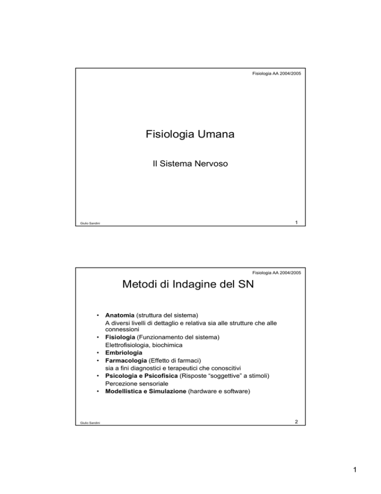 Fisiologia AA 2004/2005 Fisiologia Umana Il Sistema Nervoso 1 Giulio Sandini Fisiologia AA 2004/2005 Metodi di Indagine del SN • Anatomia (struttura del sistema) A diversi livelli di dettaglio e relativa sia alle strutture che alle connessioni • Fisiologia (Funzionamento del sistema) Elettrofisiologia, biochimica • Embriologia • Farmacologia (Effetto di farmaci) sia a fini diagnostici e terapeutici che conoscitivi • Psicologia e Psicofisica (Risposte “soggettive” a stimoli) Percezione sensoriale • Modellistica e Simulazione (hardware e software) Giulio Sandini 2 1 Fisiologia AA 2004/2005 Cervello e Comportamento Le Neural Sciences cercano di spiegare il comportamento sulla base dell’attività del cervello Alcune domande: I processi mentali sono localizzati in aree specifiche del cervello o rappresentano l’attività emergente dell’intero cervello? Se i processi sono localizzati quali regole legano l’anatomia e la fisiologia al comportamento (percezione, pensiero, movimento)? A che livello di dettaglio lavorare (singolo neurone, nuclei etc.)? Quale parametro considerare (elettrico, chimico, fisico)? 3 Giulio Sandini Fisiologia AA 2004/2005 Cenni storici Anatomia Luigi Rolando Università di Padova (1594) (1809) de’ Liuzzi (1313) Mondino Brodmann (1909)Andrea Vesalio (1527) Giulio Sandini Leonardo (1482 ) 4 2 Fisiologia AA 2004/2005 Cenni storici Istologia Fino alla scoperta del microscopio l’idea prevalente era che il cervello fosse una ghiandola e che l’elaborazione avvenisse mediante fluidi. 1624 Alla fine del 1800 Camillo Golgi e Santiago Ramon I Cajal descrivono la struttura delle cellule nervose (i neuroni) - silver staining method. 5 Giulio Sandini Fisiologia AA 2004/2005 Cenni storici (elettro) fisiologia •1809 Rolando stimola elettricamente la corteccia •1820 Inventato il Galvanometro •Nel 1900 si scopre che l’attività elettrica di un neurone influenza l’attività di altri neuroni Alla fine del diciottesimo secolo Luigi Galvani scopre che i tessuti nervosi producono elettricità Giulio Sandini •1906 - Charles S. Sherrington descrive le sinapsi e la corteccia motoria •1929 – Hans Berger pubblica i primi risultati sull’eeg 6 3 Fisiologia AA 2004/2005 Cenni storici Farmacologia Alla fine del diciannovesimo secolo Claude Bernard, Paul Ehrlich e John Langley scoprono che alcuni farmaci interagiscono con specifici recettori. 1963 - John Carew Eccles, Alan Lloyd Hodgkin and Andrew Fielding Huxley share Nobel Prize for work on the mechanisms of the neuron cell membrane 1976 - Erwin Neher and Bert Sakmann develop the patchclamp technique http://faculty.washington.edu/chudler/hist.html 7 Giulio Sandini Fisiologia AA 2004/2005 Cenni storici Psicologia e Comportamento Lo studio del comportamento umano inizia già nell’antichità Uno studio sistematico del comportamento inizia a metà del XIX secolo con Charles Darwin e le sue ricerche sull’evoluzione e sul comportamento animale. experimental psychology: studio del comportamento umano e animale in condizioni controllate ethology: studio del comportamento degli animali nel loro ambiente naturale Giulio Sandini 8 4 Fisiologia AA 2004/2005 Cenni storici Psicologia e Comportamento Il tentativo di mettere in relazione “biologia” e comportamento inizia già alla fine del XVIII secolo con Franz Joseph Gall: aree discrete della corteccia cerebrale controllano funzioni specifiche Il cervello non è un unico organo ma è formato da un insieme di almeno 35 organi a ciascuno dei quali corrisponde una facoltà mentale (anche concetti astratti quali la generosità e la pazienza) L’uso di queste facoltà provoca una crescita degli organi per cui è possibile, analizzando la forma del cranio caratterizzare il carattere degli individui (phrenology) 9 Giulio Sandini Fisiologia AA 2004/2005 Struttura del sistema nervoso Giulio Sandini 10 5 Sistema Nervoso Fisiologia AA 2004/2005 Sistema Nervoso Centrale: Cervello e midollo spinale Sistema nervoso periferico: I neuroni che controllano i muscoli e i recettori periferici 11 Giulio Sandini Fisiologia AA 2004/2005 SNC Ilsistema nervoso centrale è formato da 7 parti principali: 1)Midollo spinale: riceve informazioni sensoriali dagli arti e dagli organi interni e controlla i motoneuroni 2)Medulla 3)Pons Brain Stem 4)Cervelletto 5)Midbrain 6)Diencefalo 11 KS Giulio Sandini 7)Emisferi cerebrali “ricoperti dalla corteccia cerebrale contengono i nuclei della base, l’ippocampo e l’amygdala 12 6 Fisiologia AA 2004/2005 La Corteccia Cerebrale è suddivisa in quattro lobi: frontale, parietale, temporale e occipitale Le convoluzioni cerebrali hanno la funzione di aumentare la superficie della corteccia (evoluzione) e presentano delle regolarità fra individui (solchi e giri si ritrovano simili in tutti gli individui) Ciascun emisfero elabora informazioni controlaterali Gli emisferi non sono simmetrici (sia anatomicamente che funzionalmente) 82 KS 13 Giulio Sandini “We Speak with the left emisphere” Fisiologia AA 2004/2005 Nel 1861 Pierre Paul Broca descrive il caso di un paziente che, pur essendo in grado di capire il linguaggio parlato non è in grado di parlare e/o scrivere correttamente. Il paziente non presenta danni motori che giustifichino questa incapacità ed è in grado di articolare singole parole e di modulare melodie musicali. L’esame del cervello del paziente dopo la morte rivela una lesione nella zona posteriore del lobo frontale dell’emisfero sinistro. Osservazioni analoghe vengono fatte per altri otto pazienti. Nel 1876 Carl Wernicke descrive il caso di un paziente che pur essendo in grado di articolare parole non è in grado di comprendere il linguaggio parlato La lesione cerebrale è in una zona diversa 12 KS Giulio Sandini Wernicke propone il modello dell’elaborazione distribuita: solo le funzioni elementari sono svolte da singoli nuclei specializzati mentre quelle complesse richiedono interconnessioni fra aree diverse. 14 7 Broadman h