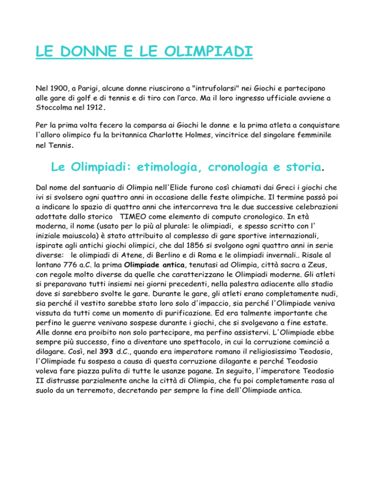 LE DONNE E LE OLIMPIADI Nel 1900, a Parigi, alcune donne riuscirono a "intrufolarsi" nei Giochi e partecipano alle gare di golf e di tennis e di tiro con l’arco. Ma il loro ingresso ufficiale avviene a Stoccolma nel 1912. Per la prima volta fecero la comparsa ai Giochi le donne e la prima atleta a conquistare l'alloro olimpico fu la britannica Charlotte Holmes, vincitrice del singolare femminile nel Tennis. Le Olimpiadi: etimologia, cronologia e storia. Dal nome del santuario di Olimpia nell'Elide furono così chiamati dai Greci i giochi che ivi si svolsero ogni quattro anni in occasione delle feste olimpiche. Il termine passò poi a indicare lo spazio di quattro anni che intercorreva tra le due successive celebrazioni adottate dallo storico TIMEO come elemento di computo cronologico. In età moderna, il nome (usato per lo più al plurale: le olimpiadi, e spesso scritto con l' iniziale maiuscola) è stato attribuito al complesso di gare sportive internazionali, ispirate agli antichi giochi olimpici, che dal 1856 si svolgono ogni quattro anni in serie diverse: le olimpiadi di Atene, di Berlino e di Roma e le olimpiadi invernali.. Risale al lontano 776 a.C. la prima Olimpiade antica, tenutasi ad Olimpia, città sacra a Zeus, con regole molto diverse da quelle che caratterizzano le Olimpiadi moderne. Gli atleti si preparavano tutti insiemi nei giorni precedenti, nella palestra adiacente allo stadio dove si sarebbero svolte le gare. Durante le gare, gli atleti erano completamente nudi, sia perché il vestito sarebbe stato loro solo d'impaccio, sia perché l'Olimpiade veniva vissuta da tutti come un momento di purificazione. Ed era talmente importante che perfino le guerre venivano sospese durante i giochi, che si svolgevano a fine estate. Alle donne era proibito non solo partecipare, ma perfino assistervi. L'Olimpiade ebbe sempre più successo, fino a diventare uno spettacolo, in cui la corruzione cominciò a dilagare. Così, nel 393 d.C., quando era imperatore romano il religiosissimo Teodosio, l'Olimpiade fu sospesa a causa di questa corruzione dilagante e perché Teodosio voleva fare piazza pulita di tutte le usanze pagane. In seguito, l'imperatore Teodosio II distrusse parzialmente anche la città di Olimpia, che fu poi completamente rasa al suolo da un terremoto, decretando per sempre la fine dell'Olimpiade antica. Fu Pierre de Coubertin che riportò agli antichi splendori i Giochi Olimpici, un barone francese, appassionato di sport. Molti altri prima di lui avevano tentato di far rivivere i fasti dell'Olimpiade antica, senza successo, vuoi per mancanza di strutture adeguate, vuoi per lo scarso interessamento delle nazioni. Ma de Coubertin non si lasciò distogliere facilmente dal suo sogno; spese molto del proprio capitale in viaggi per convincere le nazioni a partecipare; nel 1892 ottenne il benestare dell'Unione francese per gli sport atletici e nel 1894 anche quello del Congresso Internazionale di Parigi. Restava soltanto da decidere la data ed il luogo. Pierre de Coubertin pensò il 1896, in modo da avere tempo sufficiente per organizzare il tutto, e come luogo Atene, poiché Olimpia era soltanto un villaggio piuttosto piccolo, ma la nazione ospitante doveva essere la Grecia, la culla dei Giochi Olimpici. Il 6 aprile 1896 re Giorgio I di Grecia aprì ufficialmente la prima edizione delle Olimpiadi moderne davanti a ben 5000 spettatori; le gare furono svolte in uno stadio costruito sull'esatto modello di quello di Olimpia grazie ai fondi messi a disposizione dal banchiere Averof (il governo greco non aveva finanziato nulla). Parteciparono 13 nazioni per un totale di circa 300 atleti non professionisti. Tra gli sport figuravano l'atletica leggera, la ginnastica, il tennis, la scherma, il sollevamento pesi. La gara che provocò le emozioni più forti fu la maratona, nella quale i greci speravano di eccellere. Essa rievocava, infatti, l'incredibile impresa di Filippide (o Fidippide) che, nel 490 a.C., aveva corso senza fermarsi mai da Maratona ad Atene per comunicare la vittoria su Dario ed i Persiani ed era morto per la fatica appena terminata la sua missione. Ed infatti fu un greco a vincere: un pastore dell'Attica, di nome Spyridion Luis, che gareggiava con la divisa della fanteria greca. Il giorno dopo ci furono le premiazioni con medaglie d'argento (per ovvie ragioni di bilancio) e l'incoronazione dei vincitori con ramoscelli d'ulivo raccolti ad Olimpia. La prima edizione dei Giochi Olimpici moderni fu quindi un successo, nonostante le difficoltà e la mancanza di fondi e di strutture adeguate. Il logo che li contraddistingue da sempre, però, non c'era ancora. Bisognerà aspettare il 1913, dopo l'edizione dei Giochi Olimpici di Stoccolma del 1912, perché de Coubertin concretizzasse la sua idea di sopranazionalità e di contemporanea unione dei continenti in un logo. Ideò quindi i cinque cerchi colorati che rappresentano l'incontro degli atleti di tutto il mondo partecipante. L'interpretazione dei colori blu per l'Europa, giallo per l'Asia, nero per l'Africa, verde per l'Oceania e rosso per l'America non è attribuibile a Pierre de Coubertin , ma è ormai un'interpretazione di fatto. Egli, infatti, aveva scelto quei colori perché si trovavano, mescolati in maniere differenti, in tutte le bandiere europee, e in quelle delle nuove nazioni partecipanti: Giappone, Cina, Oceania. La bandiera olimpica fu presentata in occasione dell'anniversario della nascita delle Olimpiade moderne nel 1914 a Parigi e si vide sventolare su uno stadio per la prima volta nei Giochi Olimpici di Anversa nel 1920. Alcuni Giochi Olimpici vanno ricordati per le loro peculiarità: quelli di Parigi del 1900, non sono importanti per l'efficienza dimostrata nella loro organizzazione, bensì per il fatto che, per la prima volta, vi parteciparono delle donne. Altre curiosità da segnalare riguardano i periodi delle due guerre mondiali: i Giochi Olimpici del 1916, del 1940 e del 1948 non furono disputati a caus
