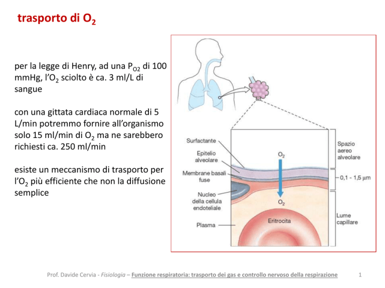 trasporto di O2 per la legge di Henry, ad una PO2 di 100 mmHg, l’O2 sciolto è ca. 3 ml/L di sangue con una gittata cardiaca normale di 5 L/min potremmo fornire all’organismo solo 15 ml/min di O2 ma ne sarebbero richiesti ca. 250 ml/min esiste un meccanismo di trasporto per l’O2 più efficiente che non la diffusione semplice Prof. Davide Cervia - Fisiologia – Funzione respiratoria: trasporto dei gas e controllo nervoso della respirazione 1 questo meccanismo è a livello dei globuli rossi Prof. Davide Cervia - Fisiologia – Funzione respiratoria: trasporto dei gas e controllo nervoso della respirazione 2 Prof. Davide Cervia - Fisiologia – Funzione respiratoria: trasporto dei gas e controllo nervoso della respirazione 3 Prof. Davide Cervia - Fisiologia – Funzione respiratoria: trasporto dei gas e controllo nervoso della respirazione 4 eritrociti privi di nucleo, mitocondri, ribosomi a forma di disco biconcavo altamente deformabili gli elementi corpuscolati più abbondanti del sangue vivono ca. 4 mesi in circolo 5 milioni/mm3 (uomo) e 4,5 milioni/mm3 (donna) contenitori (33%) e trasportatori di emoglobina Prof. Davide Cervia - Fisiologia – Funzione respiratoria: trasporto dei gas e controllo nervoso della respirazione 5 emoglobina cromoproteina tetramerica (68 kDa) formata da 4 anelli tetrapirrolici (gruppo eme) e 4 molecole proteiche (globine) al centro del gruppo eme c’è un atomo di ferro allo stato ferroso (Fe2+) che forma 6 legami di coordinazione nell’adulto il 98% dell’emoglobina è formata da 2 globine α e 2 β mentre il 2% da 2 globine α e 2 δ nell’emoglobina fetale le catene β sono sotituite dalla catene γ che aumentano l’affinità per l’O2 Prof. Davide Cervia - Fisiologia – Funzione respiratoria: trasporto dei gas e controllo nervoso della respirazione 6 eritropoiesi gli eritrociti si originano nel midollo rosso delle epifisi e diafisi delle ossa lunghe (omero, femore, etc.) ma soprattutto nelle ossa corte e piatte (sterno, ossa del bacino, costole, vertebre) è finemente regolata da: eritropoietina (EPO) (proliferazione e maturazione) ferro (gruppo eme) cobalto, rame (formazione dell’emoglobina) vitamina B2 (riboflavina) vitamina B12 (cianocobalamina), acido folico, fattore intrinseco (maturazione dei precursori) Prof. Davide Cervia - Fisiologia – Funzione respiratoria: trasporto dei gas e controllo nervoso della respirazione 7 ca. il 70% del Fe dell’organismo si trova incorporato nel gruppo eme il Fe viene assorbito dall’intestino e trasportato dalla transferrina (proteina carrier) ca. il 30% di Fe (ferrico, Fe3+) viene tamponato dal fegato tramite la ferritina ca. il 3% di Fe è incorporato nella mioglobina Prof. Davide Cervia - Fisiologia – Funzione respiratoria: trasporto dei gas e controllo nervoso della respirazione 8 emolisi ed eritrocateresi l’emolisi è la rottura della membrana eritrocitaria e la conseguente fuoriuscita dell’emoglobina i globuli rossi producono piccole quantità di ATP per mantenere la propria omeostasi e per evitare l’ossidazione del Fe ferroso e delle proteine ma dopo 4 mesi i meccanismi enzimatici dei globuli rossi sono ormai invecchiati i globuli rossi “vecchi” si rompono quando passano nei capillari o si accumulano nel sistema reticolo-endoteliale (milza, fegato, midollo osseo) dove vengono fagocitati dai macrofagi gli aminoacidi dell’Hb servono per fare altre proteine il Fe viene incorporato in altri gruppi eme; l’anello porfirinico viene convertito nel pigmento bilirubina la bilirubina del sangue viene metabolizzata nella bile dal fegato ed espulsa nelle feci mentre i suoi metaboliti vengono escreti dal rene nelle urine Prof. Davide Cervia - Fisiologia – Funzione respiratoria: trasporto dei gas e controllo nervoso della respirazione 9 emoglobina e legame con l’O2 O2 è sia fisicamente disciolto che chimicamente legato Hb + O2 HbO2 deossiemoglobina ossiemoglobina lega 4 molecole di O2 con un legame di coordinazione legame (e reazione) completamente reversibile, dipendente dalla PO2 Fe3+ = metaemoglobina Prof. Davide Cervia - Fisiologia – Funzione respiratoria: trasporto dei gas e controllo nervoso della respirazione 10 la quantità di O2 che si lega ad Hb dipende da: PO2 del plasma numero totale dei siti di legame (numero di molecole di Hb presenti) effetto cooperativo positivo Hb + O2 ↔ Hb(O2)1 + O2 ↔ Hb(O2)2 + O2 ↔ Hb(O2)3 + O2 ↔ Hb(O2)4 la percentuale di saturazione dell’emoglobina indica la percentuale di siti di legame disponibili che sono legati a O2 : se tutti i siti sono occupati il sangue è ossigenato al 100% (= saturo, valore teorico) curva di dissociazione dell’emoglobina (sigmoide) Prof. Davide Cervia - Fisiologia – Funzione respiratoria: trasporto dei gas e controllo nervoso della respirazione 11 Prof. Davide Cervia - Fisiologia – Funzione respiratoria: trasporto dei gas e controllo nervoso della respirazione 12 Prof. Davide Cervia - Fisiologia – Funzione respiratoria: trasporto dei gas e controllo nervoso della respirazione 13 significato funzionale della curva di dissociazione dell’emoglobina riserva di O2: alla saturazione (alveoli) Hb trasporta quasi tutto l’O2 presente nel sangue; alla PO2 nelle cellule a riposo (40 mmHg) la percentuale di saturazione di Hb è del 75%, quindi Hb ha rilasciato solo il 25% di O2 che trasporta il resto viene utilizzato quando il metabolismo (ed il conseguente consumo di O2) aumenta importanza della pendenza: bassa a PO2 > 60 mmHg e alta a PO2 tra 40 e 20 mmHg l’ossigenazione del sangue a livello polmonare non cambia molto al variare della PO2 alto rilascio di O2 nei tessuti al diminuire della PO2 sotto la normalità ad es.: ad una PO2 di 20 mmHg (valore medio del muscolo sotto sforzo) la percentuale di saturazione di Hb scende bruscamente al 30%, quindi Hb ha rilasciato il 70% del contenuto totale di O2 passare da 100 a 40 mmHg fa rilasciare il 25% di O2 passare da 40 a 20 mmHg fa rilasciare il 45% di O2 Prof. 