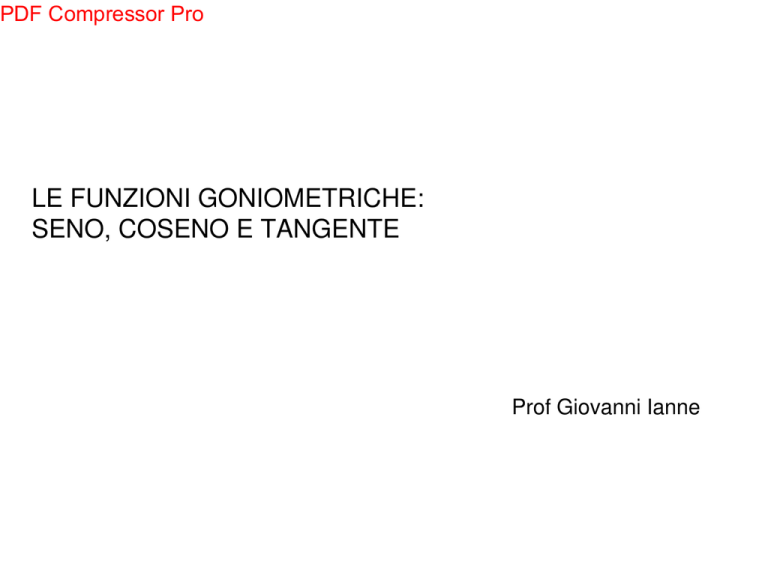 PDF Compressor Pro LE FUNZIONI GONIOMETRICHE: SENO, COSENO E TANGENTE Prof Giovanni Ianne PDF Compressor Pro Prof Giovanni Ianne LE FUNZIONI SENO E COSENO DEFINIZIONE Seno e coseno Consideriamo la circonferenza goniometrica e un angolo orientato a, e sia B il punto della circonferenza associato ad a. Definiamo coseno e seno di a, e indichiamo con cos a e sen a : cos a = xB , sen a = yB . PDF Compressor Pro Prof Giovanni Ianne LE FUNZIONI SENO E COSENO Circonferenza di raggio unitario Circonferenza di centro O e raggio qualsiasi Indichiamo con (x; y) le coordinate di B. Indichiamo con (x'; y') le coordinate di B'. x = cos a y = sen a Scopriamo che: e e quindi sen a e cos a non dipendono dalla particolare circonferenza considerata, ma solo dall’angolo a. PDF Compressor Pro Prof Giovanni Ianne LE FUNZIONI SENO E COSENO Il triangolo OA'B' è un triangolo rettangolo. Le proprietà del seno e del coseno si applicano a tutti i triangoli rettangoli. Triangoli rettangoli sen a = rapporto tra il cateto opposto all’angolo e l’ipotenusa. cos a = rapporto tra il cateto adiacente all’angolo e l’ipotenusa. PDF Compressor Pro Prof Giovanni Ianne LE VARIAZIONI E IL GRAFICO DELLE FUNZIONI SENO E COSENO PROPRIETÀ In particolare si verifica che: –1 ≤ sen x ≤ 1 ; –1 ≤ cos x ≤ 1 ; cos x = cos (–x) ; sen x = –sen (–x) . Costruiamo il grafico delle funzioni y = sen x e y = cos x in [0; 2p] riportando sull’asse x i valori degli angoli e sull’asse y le coordinate dei punti della circonferenza goniometrica. PDF Compressor Pro Prof Giovanni Ianne SINUSOIDE E COSINUSIDE sen (x + 2p) = sen x = sen (x + 4p) = ... , cos (x + 2p) = cos x = cos (x + 4p) = … , cioè sen (x + 2kp) = sen x , cos (x + 2kp) = cos x . Le funzioni seno e coseno sono periodiche di periodo 2p . Il grafico completo della funzione seno si chiama sinusoide, quello della funzione coseno cosinusoide. I due grafici differiscono per una traslazione di p/2. p 2 PDF Compressor Pro Prof Giovanni Ianne LA PRIMA RELAZIONE FONDAMENTALE Prima relazione fondamentale della goniometria cos2 a + sen2 a = 1 Da cui, se è noto cos a , mentre, se è noto sen a , , . PDF Compressor Pro Prof Giovanni Ianne LA FUNZIONE TANGENTE DEFINIZIONE Tangente Consideriamo un angolo orientato a, e sia B il punto della circonferenza associato ad a. Definiamo tangente di a il rapporto, quando esiste, tra l’ordinata e l’ascissa di B: . PDF Compressor Pro Prof Giovanni Ianne LA FUNZIONE TANGENTE Circonferenza di centro O e raggio qualsiasi Triangolo rettangolo Indichiamo con (x'; y') le coordinate di B'. tg a = rapporto tra il cateto opposto all’angolo e il cateto adiacente. Un altro significato geometrico Consideriamo il cerchio goniometrico e la sua tangente t. tg a = ordinata di T. PDF Compressor Pro Prof Giovanni Ianne LE VARIAZIONI E IL GRAFICO DELLA FUNZIONE TANGENTE PROPRIETÀ In particolare si verifica che: tg x tende a + o – quando x si avvicina a p/2, tg x = – tg (–x). Costruiamo il grafico della funzione y = tg x in [0;p] riportando sull’asse x i valori degli angoli e sull’asse y l’ordinata del punto T. PDF Compressor Pro Prof Giovanni Ianne LA TANGENTOIDE tg (a + p) = tg a = tg (a + 2p) = ... cioè tg (a + kp) = tg a . La funzione tangente è periodica di periodo p . Il grafico completo della funzione tangente si chiama tangentoide. PDF Compressor Pro Prof Giovanni Ianne LA SECONDA RELAZIONE FONDAMENTALE Seconda relazione fondamentale della goniometria , yB = sen a , xB = cos a , . PDF Compressor Pro Prof Giovanni Ianne ESERCIZI: SENO E COSENO PDF Compressor Pro Prof Giovanni Ianne ESERCIZI: LA TANGENTE