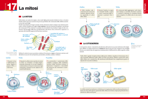 Il SAC, sistema di controllo nella divisione cellulare IFOM per la scuola Lo Studente Ricercatore 2011 Villani Yuri Liceo Scientifico Tecnologico Chimico-Biologico IIS A. Maserati - Voghera(PV) Gruppo: Biologia cellulare computazionale Tutor: Luca Mariani, Elena Chiroli La scelta del lievito per lo studio Perché scegliere il lievito? Sceglierlo ha diversi vantaggi: 1) Ciclo cellulare molto veloce; 2) Facilità di mantenimento; 3) Dimensioni molto ridotte, quindi colture poco ingombranti; 4) Genoma conosciuto; 5) Facilità nel bioingegnerizzarlo; 6) Nessun problema etico. Tratto da: www.atlantebotanica.unito.it Il ciclo cellulare Tratto da: www.torinoscienza.it Il ciclo cellulare comprende tutta la vita di una cellula. Alcuni passaggi sono critici per il successo della divisione. Il primo è la duplicazione del DNA in fase S(ci è utile per le analisi al FACS perché in base alla quantità di DNA capiamo qual è la fase cellulare, il secondo è la connessione microtubulicentromero in fase G2. Un po' di teoria: la mitosi Processo schematizzato della mitosi La mitosi è il processo che permette alla cellula singola la divisione in due cellule figlie. È una fase delicata perché qui avviene la separazione dei cromatidi fratelli, con un'alta probabilità di incorrere in errori che potrebbero portare a mutazioni nel corredo genetico. Tratto e modificato da www.camperperlascienza.ibc.cnr.it Prima e dopo il punto critico: metafase e anafase Nella metafase avviene il collegamento tra i microtubuli e i centromeri. Centrosoma Tratto da: www.bassilo.it In anafase, i centrosomi creano una tensione sui microtubuli che fa separare e migrare nei rispettivi poli i cromatidi fratelli. Tratto da:www.bassilo.it T Cos'è il SAC? Il SAC(Spindle Assembly Checkpoint) è un meccanismo che permette alla cellula di arrestare la divisione prima dell'anafase in caso di anomalie nella struttura del fuso mitotico o, in assenza di errori, fino a che tutti i microtubuli si sono uniti correttamente ai centromeri. Tratto da: www.mcb.harvard.edu Perché avviene l'arresto? L'arresto in metafase avviene nel caso in cui un microtubulo non è correttamente legato al centromero. In mancanza dell'arresto, durante la migrazione dei cromatidi verso i poli, il microtubulo opposto a quello non collegato trainerebbe due cromatidi al posto di uno. Tratto e modificato da: www.fulviobaldanza.it Come avviene l'arresto? La mancata connessione dei microtubuli con i centromeri, induce la formazione di un complesso con Mad2 scatenando una cascata di eventi che portano alla inibizione della separasi e al blocco del fuso mitotico impedendo così la divisione dei cromatidi in modo errato. Tratto da: www.nationwidechildrens.org In laboratorio Ricreare il SAC in laboratorio ci permette di studiarlo. Come attivarlo? 2 metodi principali: Sovraespressione della proteina Mad2 grazie ad una inserzione Gal-Mad2. Distruggendo fisicamente il fuso mitotico con il nocodazolo. Noi utilizzeremo la sovraespressione di Mad2. Inserzione Gal-Mad2 Il gene Gal-Mad2 viene inserito per trasformazione all'interno del corredo genetico del lievito. Permette alla cellula, in presenza di galattosio(Gal), una produzione di Mad2 circa 20 volte quella naturale. Si possono fare più inserzioni(Gal-Mad2 1x, 2x, 3x, cioè 20, 40, 60 volte l'endogeno). Primo passo: la coltura Si prepara una coltura con il ceppo che ci interessa e dopo il rilascio da alpha-factor(un ormone che ci permette di avere le cellule tutte alla stessa fase del ciclo)si tratta con sostanze diverse in base allo studio da fare e si prendono campioni ad intervalli regolari. Cellule ciclanti, prima del trattamento con alpha-factor. Ceppo Gal-Mad2 in galattosio Dopo il rilascio, nella coltura si aggiunge del galattosio. Questo zucchero attiva il promotore Gal-Mad2 che sovraesprime la produzione della proteina Mad2 causando l'arresto. Cellule bloccate in metafase, si può dedurre dalla grandezza delle gemme. Il FACS Il FACS è uno strumento che permette la misurazione della quantità di DNA in una cellula. Come? I campioni prelevati vanno trattati con ioduro propidio che si lega al DNA. Il propidio emana una fluorescenza letta dal FACS. In base alla quantità di fluorescenza rilevata si capisce se la cellula è in fase G1 oppure in fase G2. Se tutte le cellule di un campione sono in fase G2 vuol dire che siamo riusciti a creare un blocco efficace. Leggere i dati del FACS N° di Il FACS invia al computer collegato dei grafici che sta al ricercatore interpretare. cellule Quantità di DNA rilevata; fase G1 o fase G2. Se va oltre si è in presenza di cellule lisate, cioè distrutte. Risultati dell'esperimento Nel caso di 3 inserzioni di Gal-Mad2 il blocco dura per oltre 7 ore. In ultimo ma non meno importante Ma alla fine, cosa serve conoscere il SAC alla ricerca sul cancro? Conoscere in modo perfetto il checkpoint, ci farebbe capire come alcune cellule possano proliferare in modo anomalo, quindi cercare soluzioni più mirate in una eventuale nuova terapia.