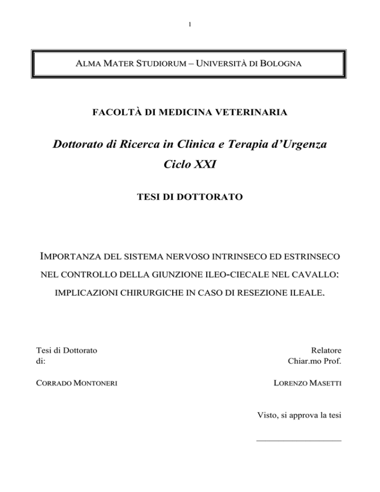 1 ALMA MATER STUDIORUM – UNIVERSITÀ DI BOLOGNA FACOLTÀ DI MEDICINA VETERINARIA Dottorato di Ricerca in Clinica e Terapia d’Urgenza Ciclo XXI TESI DI DOTTORATO IMPORTANZA DEL SISTEMA NERVOSO INTRINSECO ED ESTRINSECO NEL CONTROLLO DELLA GIUNZIONE ILEO-CIECALE NEL CAVALLO: IMPLICAZIONI CHIRURGICHE IN CASO DI RESEZIONE ILEALE. Tesi di Dottorato di: CORRADO MONTONERI Relatore Chiar.mo Prof. LORENZO MASETTI Visto, si approva la tesi ___________________ 2 3 R I N G RA Z I A M E N T I Un ringraziamento al Prof.Lorenzo Masetti, alla Prof.ssa Monika Joechler ed al Dott.Luciano Pisoni, della Sezione di Chirurgia del Dipartimento Clinico della Facoltà di medicina Veterinaria di Bologna, per la disponibilità ed il calore mostrati nell’avermi accolto nel loro gruppo di lavoro come in una famiglia. Un ringraziamento particolare al Prof.Roberto Chiocchetti, del Dipartimento di Morfofisiologia Veterinaria e Produzioni Animali della Facoltà di medicina Veterinaria di Bologna, per l’amicizia dimostrata nel corso di questi anni e l’estrema professionalità ed entusiasmo dimostrati nella conduzione e nell’assistenza allo svolgimento del lavoro quotidiano. 4 MOTIVAZIONI DELLO STUDIO ED OBBIETTIVI Il sistema nervoso enterico (“Enteric Nervous System”, ENS) è un insieme di neuroni e fibre intramurali frammiste a fibre nervose provenienti dal sistema nervoso simpatico e parasimpatico. I neuroni enterici, organizzati nei gangli dei plessi mioenterico e sottomucoso, regolano le principali funzioni enteriche, come l’attività muscolare, l’assorbimento, la secrezione, il flusso ematico e linfatico. Tra i neuroni dell’ENS troviamo motoneuroni eccitatori ed inibitori, interneuroni, neuroni vasomotori e secretomotori, e anche neuroni sensitivi primari, che rendono l’intestino quasi totalmente indipendente dal controllo nervoso centrale. L’intestino perciò possiede un “secondo cervello” definito anche “the little brain” o più propriamente “the brain in the gut”. Sebbene la maggior parte degli studi sull’ENS sia stata svolta su modelli murini, esistono ricerche relative all’organizzazione, morfologia e neurochimica dei neuroni enterici del cavallo. Tuttavia la letteratura non riporta studi morfo-funzionali riguardanti il controllo intramurale della giunzione ileo-ciecale (“ileocaecal junction”, ICJ), sede di frequenti complicazioni gastroenteriche. E’ quindi oggigiorno indispensabile, per il chirurgo, approfondire le conoscenze sull’intimo controllo della ICJ. In questa tesi si presenta uno studio sperimentale condotto in collaborazione tra il Prof.Roberto Chiocchetti (DIMORFIPA) e la Sezione di Chirurgia del Dipartimento Clinico della Facoltà di Medicina Veterinaria dell’Ateneo di Bologna. I risultati di questa ricerca sono stati pubblicati (febbraio 2009) dalla rivista Equine Veterinary Journal (“Intrinsic innervation of the ileocaecal junction in the horse: Preliminary study” doi: 10.2746/042516409X407594) e accettati (marzo 2009) dalla rivista scientifica Research in Veterinary Science (“Intrinsic innervation of the horse ileum”). Altri risultati, in corso di scrittura, saranno presentati quanto prima (“Anatomical evidence of sympathetic control of the distal ileum and ileocaecal junction in the horse”). Questo studio è stato condotto grazie ai fondi del RFO 2007, Università di Bologna. 5 AUTORIZZAZIONE ALLA SPERIMENTAZIONE Tutte le procedure descritte a seguito sono state svolte seguendo la legislazione italiana che riguarda i protocolli di sperimentazione animale, dopo approvazione del Comitato Etico-Scientifico per Sperimentazioni su Animali della Università di Bologna (Rif. BQ/gf PROT.: 13825-X/10 All. 17 del 19/03/2007). Sono stati compiuti tutti gli sforzi possibili allo scopo di minimizzare il numero di animali impiegati e la loro sensibilità al dolore. 6 LISTA DELLE ABBREVIAZIONI CaudMG - caudal mesenteric ganglion CG - coeliac ganglion CGRP - calcitonin gene-related peptide ChAT - choline acetyl transferase CMG - cranial mesenteric ganglion CML - circular muscle layer CNS - central nervous system DBH - dopamine-beta hydroxylase DRG - dorsal root ganglion EGS - equine grass sickness ENS - enteric nervous systems GIT - gastrointestinal tract ICJ - ileocaecal junction IML - intermedio-lateral cell colum IPANs - intrinsic primary sensory neurons IR - immunoreactive ISMP - inner submucosal plexus LML - longitudinal muscle layer mm - muscularis mucosae MMC - myoelectric migrating complex MP - myenteric plexus NF200 - neurofilament 200kDa nNOS - neuronal nitric oxide synthase NPY - neuropeptide Y NSE - neuron specific enolase OSMP - outer submucosal plexus PBS - phosphate buffer saline PGP 9.5 - protein gene product S100 - calcium binding protein SC - sympathetic chain SG - splanchnic ganglia SMP - submucosal plexus SNA - autonomic nervous system SNS - sympathetic nervous system SP - substance P TH-IR - tyrosine hydroxylase TSC - toracic sympathetic chain 7 INDICE 1. ANATOMIA 1.1. ILEO - P.12 - P.12 1.1.1. STRUTTURA DELLA PARETE ILEALE - P.12 1.1.2. ANATOMIA TOPOGRAFICA ILEALE - P.15 1.1.3. ANATOMIA VASCOLARE ILEALE - P.15 1.1.3.1. 1.2. CIECO FLUSSO SANGUIGNO ILEALE - P.17 - P.20 1.2.1. STRUTTURA DELLA PARETE CECALE - P.20 1.2.2. ANATOMIA TOPOGRAFICA CECALE - P.21 1.2.3. VASCOLARIZZAZIONE CECALE - P.21 1.3. VALVOLA ILEO-CIECALE (Ileo-Caecal Junction, ICJ) - P.2 2 1.3.1. STRUTTURA DELLA ICJ - P.22 1.3.2. VASCOLARIZZAZIONE DELLA ICJ - P.23 1.3.3. INNERVAZIONE ESTRINSECA DELLA ICJ - P.25 1.3.3.1. SISTEMA NERVOSO SIMPATICO - P.25 1.3.3.1.1. Simpatico addominale - P.25 1.3.3.1.1.1. Plesso e ganglio celiaco - P.26 1.3.3.1.1.2. Plesso e ganglio mesenterico craniale - P.27 1.3.3.1.1.3. Plesso e ganglio mesenterico caudale - P.27 1.3.3.2. SISTEMA NERVOSO PARASIMPATICO - P.27 1.3.3.3. INNERVAZIONE SENSITIVA - P.28 1.3.3.3.1. Gangli delle radici dorsali del midollo spinale - P.28 1.3.3.3.2. Organizzazione della sostanza grigia del midollo spinale - P