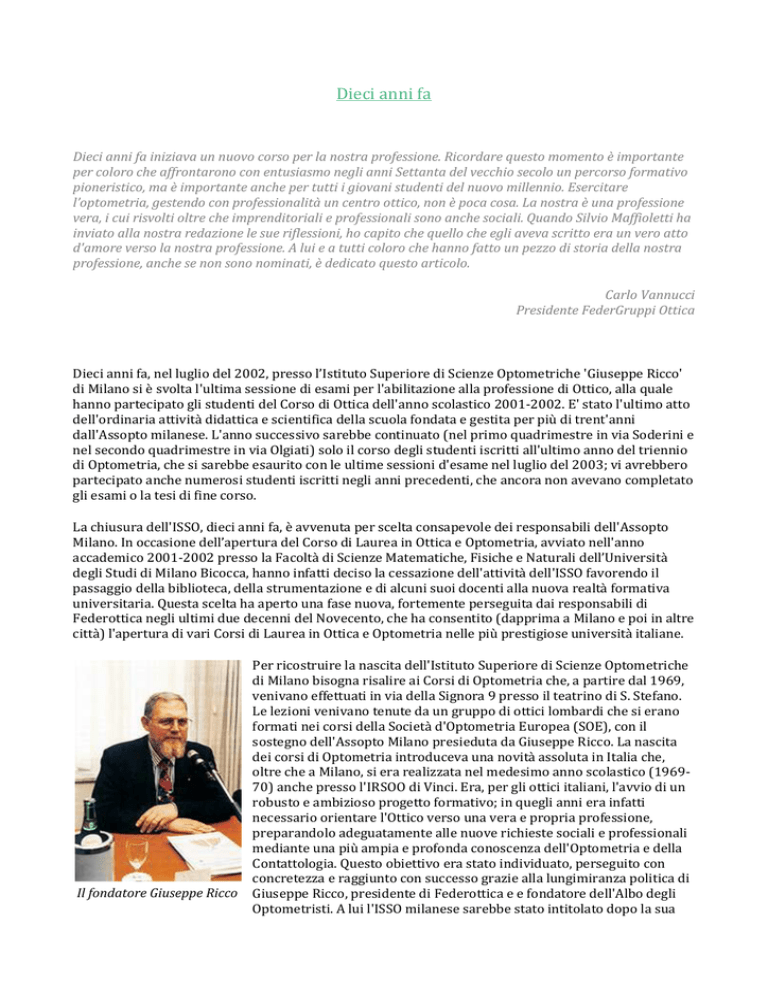 Dieci anni fa Dieci anni fa iniziava un nuovo corso per la nostra professione. Ricordare questo momento è importante per coloro che affrontarono con entusiasmo negli anni Settanta del vecchio secolo un percorso formativo pioneristico, ma è importante anche per tutti i giovani studenti del nuovo millennio. Esercitare l’optometria, gestendo con professionalità un centro ottico, non è poca cosa. La nostra è una professione vera, i cui risvolti oltre che imprenditoriali e professionali sono anche sociali. Quando Silvio Maffioletti ha inviato alla nostra redazione le sue riflessioni, ho capito che quello che egli aveva scritto era un vero atto d'amore verso la nostra professione. A lui e a tutti coloro che hanno fatto un pezzo di storia della nostra professione, anche se non sono nominati, è dedicato questo articolo. Carlo Vannucci Presidente FederGruppi Ottica Dieci anni fa, nel luglio del 2002, presso l’Istituto Superiore di Scienze Optometriche 'Giuseppe Ricco' di Milano si è svolta l'ultima sessione di esami per l'abilitazione alla professione di Ottico, alla quale hanno partecipato gli studenti del Corso di Ottica dell'anno scolastico 2001-2002. E' stato l'ultimo atto dell'ordinaria attività didattica e scientifica della scuola fondata e gestita per più di trent'anni dall'Assopto milanese. L'anno successivo sarebbe continuato (nel primo quadrimestre in via Soderini e nel secondo quadrimestre in via Olgiati) solo il corso degli studenti iscritti all'ultimo anno del triennio di Optometria, che si sarebbe esaurito con le ultime sessioni d'esame nel luglio del 2003; vi avrebbero partecipato anche numerosi studenti iscritti negli anni precedenti, che ancora non avevano completato gli esami o la tesi di fine corso. La chiusura dell'ISSO, dieci anni fa, è avvenuta per scelta consapevole dei responsabili dell'Assopto Milano. In occasione dell’apertura del Corso di Laurea in Ottica e Optometria, avviato nell'anno accademico 2001-2002 presso la Facoltà di Scienze Matematiche, Fisiche e Naturali dell’Università degli Studi di Milano Bicocca, hanno infatti deciso la cessazione dell'attività dell'ISSO favorendo il passaggio della biblioteca, della strumentazione e di alcuni suoi docenti alla nuova realtà formativa universitaria. Questa scelta ha aperto una fase nuova, fortemente perseguita dai responsabili di Federottica negli ultimi due decenni del Novecento, che ha consentito (dapprima a Milano e poi in altre città) l'apertura di vari Corsi di Laurea in Ottica e Optometria nelle più prestigiose università italiane. Il fondatore Giuseppe Ricco Per ricostruire la nascita dell'Istituto Superiore di Scienze Optometriche di Milano bisogna risalire ai Corsi di Optometria che, a partire dal 1969, venivano effettuati in via della Signora 9 presso il teatrino di S. Stefano. Le lezioni venivano tenute da un gruppo di ottici lombardi che si erano formati nei corsi della Società d'Optometria Europea (SOE), con il sostegno dell'Assopto Milano presieduta da Giuseppe Ricco. La nascita dei corsi di Optometria introduceva una novità assoluta in Italia che, oltre che a Milano, si era realizzata nel medesimo anno scolastico (196970) anche presso l'IRSOO di Vinci. Era, per gli ottici italiani, l'avvio di un robusto e ambizioso progetto formativo; in quegli anni era infatti necessario orientare l'Ottico verso una vera e propria professione, preparandolo adeguatamente alle nuove richieste sociali e professionali mediante una più ampia e profonda conoscenza dell'Optometria e della Contattologia. Questo obiettivo era stato individuato, perseguito con concretezza e raggiunto con successo grazie alla lungimiranza politica di Giuseppe Ricco, presidente di Federottica e e fondatore dell'Albo degli Optometristi. A lui l'ISSO milanese sarebbe stato intitolato dopo la sua prematura scomparsa, avvenuta nel 1997. La nascita e il rapido sviluppo dell'ISSO avevano confermato la centralità del capoluogo lombardo nella storia della professione optometrica in Italia: a Milano era nata e si trovava la sede nazionale di Federottica, a Milano operava la più numerosa e organizzata tra le Assopto italiane e inoltre proprio a Milano la forte richiesta di formazione e cultura professionale, che gli ottici avevano unitariamente espresso negli anni precedenti, aveva reso maturi i tempi per la fondazione dell'Albo degli Optometristi, che sarebbe avvenuta nel 1973. L'organizzazione e il rapido sviluppo dei corsi di Optometria aveva confermato la vocazione dinamica e moderna del capoluogo lombardo: agli studenti che giungevano da tutta Italia e, in alcuni casi, dall'estero (Grecia, Israele, Palestina, Albania e Uganda), l'istituto milanese manifestava la propria disponibilità ad accogliere senza giudicare ma anche il proprio rigore nel richiedere l'impegno personale, affinchè gli studenti conseguissero i titoli e i meriti mediante la propria dedizione e serietà. L'Assessore regionale Filippo Hazon Dopo gli anni pioneristici di via della Signora, la sede della visita la nuova scuola (1970) scuola milanese di Optometria aveva avuto vari spostamenti fino a trovare una sede stabile dapprima in via Noale, poi in via Murillo (presso il CAPAC) e infine, dal 1990, in via Soderini. Due anni dopo averlo richiesto (1971), il riconoscimento ufficiale da parte della Regione Lombardia era finalmente arrivato (1973); poi, nel 1975, la scuola aveva assunto la nuova e definitiva denominazione di "Istituto Superiore di Scienze Optometriche". Dal punto di vista amministrativo e organizzativo l'ISSO faceva riferimento all'Assopto Milano, il cui presidente ne assumeva la responsabilità. Dopo Giuseppe Ricco, questo compito era stato svolto in modo esemplare da Luigi Baccini e poi da Gianfranco Sala mentre le funzioni amministrative facevano capo a Pierluigi Mapelli, segretario dell'Assopto Milano. L'ISSO richiamava studenti da tutta Italia grazie alla qualità dei suoi corsi, biennali fino al 1979 e poi triennali (con possibilità di f
