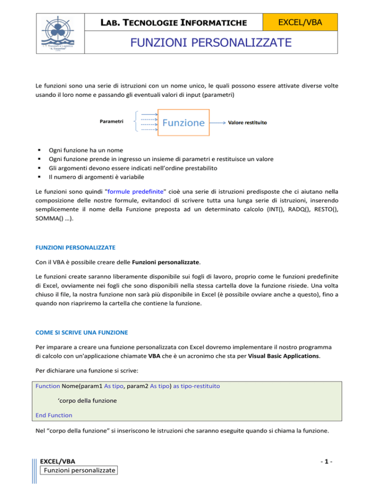 LAB. TECNOLOGIE INFORMATICHE EXCEL/VBA FUNZIONI PERSONALIZZATE Le funzioni sono una serie di istruzioni con un nome unico, le quali possono essere attivate diverse volte usando il loro nome e passando gli eventuali valori di input (parametri) Parametri Ogni funzione ha un nome Ogni funzione prende in ingresso un insieme di parametri e restituisce un valore Gli argomenti devono essere indicati nell’ordine prestabilito Il numero di argomenti è variabile Le funzioni sono quindi "formule predefinite" cioè una serie di istruzioni predisposte che ci aiutano nella composizione delle nostre formule, evitandoci di scrivere tutta una lunga serie di istruzioni, inserendo semplicemente il nome della Funzione preposta ad un determinato calcolo (INT(), RADQ(), RESTO(), SOMMA() …). FUNZIONI PERSONALIZZATE Con il VBA è possibile creare delle Funzioni personalizzate. Le funzioni create saranno liberamente disponibile sui fogli di lavoro, proprio come le funzioni predefinite di Excel, ovviamente nei fogli che sono disponibili nella stessa cartella dove la funzione risiede. Una volta chiuso il file, la nostra funzione non sarà più disponibile in Excel (è possibile ovviare anche a questo), fino a quando non riapriremo la cartella che contiene la funzione. COME SI SCRIVE UNA FUNZIONE Per imparare a creare una funzione personalizzata con Excel dovremo implementare il nostro programma di calcolo con un'applicazione chiamate VBA che è un acronimo che sta per Visual Basic Applications. Per dichiarare una funzione si scrive: Function Nome(param1 As tipo, param2 As tipo) as tipo-restituito ‘corpo della funzione End Function Nel “corpo della funzione” si inseriscono le istruzioni che saranno eseguite quando si chiama la funzione. EXCEL/VBA Funzioni personalizzate -1- Esempio 1: la funzione restituisce la stringa “Ciao a tutti” (Formula senza parametri) Function Ciao() as string Ciao="Ciao a Tutti" End Function nella cella basta scrivere =Ciao() e il risultato è "Ciao a Tutti" Esempio 2: (Formula con parametri) codice: Function Ciao_Amico(Nome as string) as string Ciao_Amico="Ciao a " & Nome End Function nella cella mi basta scrivere =Ciao_Amico("carlo") e il risultato è "Ciao a Carlo" Esempio 3: Function Ciao_Amico(Nome as string,Anni as integer) as string Ciao_Amico="Ciao a " & Nome & " (hai " & anni & " anni)" End Function nella cella mi basta scrivere =Ciao_Amico("carlo";10) Oppure =Ciao_Amico(A1;A2) o =Ciao_Amico(Foglio1!A1;10) Esempio 4: questa funzione somma 1 al valore passato ‘ Incrementa di 1 il valore passato Function SommaUno(valore As Integer) As Integer SommaUno=valore+1 End Function Prima della definizione è utile inserire una intestazione, come commento, per indicare lo scopo della funzione. CREARE UNA FUNZIONE PERSONALIZZATA Nell'esempio seguente verranno dettagliati i passaggi per la costruzione della semplice funzione AreaCerchio(Raggio) la quale consente di calcolare l'area di un cerchio a partire dal suo unico argomento: il raggio. Per… Aprire l'editor di Visual Basic Inserire un modulo EXCEL/VBA Funzioni personalizzate … usare … Strumenti > Macro > Visual Basic Editor (in alternativa: Alt + F11) Inserisci > Modulo -2- Inserire la nuova funzione Doppio click su “modulo1” e poi digitare la funzione Tornare ad excel Utilizzare la funzione File > Chiudi e torna a Microsoft Excel (in alternativa: Alt + Q) Operatori di Confronto < > = <= >= <> Minore Maggiore Uguale Minore o uguale Maggiore o uguale diverso Operatori matematici + * / \ ^ Mod addizione sottrazione Moltiplicazione Divisione Divisione con restituzione della sola parte intera Elevamento a potenza Resto della divisione EXCEL/VBA Funzioni personalizzate -3- Operatori Logici Se dovessimo combinare due o più espressioni, attraverso uno o più operatori relazionali, abbiamo anche gli operatori logici. Essi li riassumiamo in questa tabella: Not Negazione - Il risultato del test A>B se dovesse essere uguale a true; anteporre Not a quell'espressione significherebbe eseguire una negazione. Sarebbe come effettuare il test a<=b Disgiunzione logica - Abbiamo due espressioni da testare. Seguendo questa tabella di verità sapremo quando il risultato dell'applicazione della disgiunzione sarà Vero Or A>B=VERO B>C=VERO A>B OR B>C=VERO A>B=FALSO B>C=VERO A>B OR B>C=VERO A>B=VERO B>C=FALSO A>B OR B>C=VERO A>B=FALSO B>C=FALSO A>B OR B>C=FALSO Congiunzione Logica - Abbiamo due espressioni da testare. Seguendo questa tabella di verità sapremo quando il risultato dell'applicazione della congiunzione logica sarà Vero And A>B=VERO B>C=VERO A>B AND B>C=VERO A>B=FALSO B>C=VERO A>B AND B>C=FALSO A>B=VERO B>C=FALSO A>B AND B>C=FALSO A>B=FALSO B>C=FALSO A>B AND B>C=FALSO EXCEL/VBA Funzioni personalizzate -4-