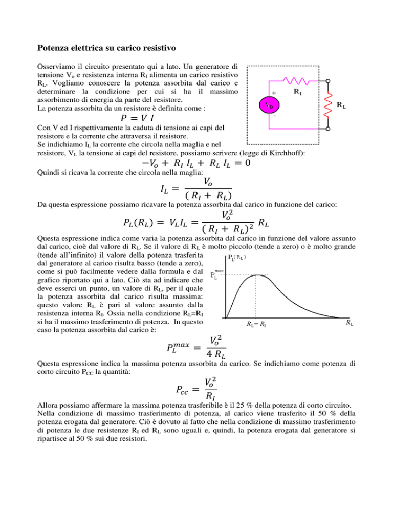 Potenza elettrica su carico resistivo Osserviamo il circuito presentato qui a lato. Un generatore di tensione Vo e resistenza interna RI alimenta un carico resistivo RL. Vogliamo conoscere la potenza assorbita dal carico e determinare la condizione per cui si ha il massimo assorbimento di energia da parte del resistore. La potenza assorbita da un resistore è definita come : Con V ed I rispettivamente la caduta di tensione ai capi del resistore e la corrente che attraversa il resistore. Se indichiamo IL la corrente che circola nella maglia e nel resistore, VL la tensione ai capi del resistore, possiamo scrivere (legge di Kirchhoff): Quindi si ricava la corrente che circola nella maglia: Da questa espressione possiamo ricavare la potenza assorbita dal carico in funzione del carico: Questa espressione indica come varia la potenza assorbita dal carico in funzione del valore assunto dal carico, cioè dal valore di RL. Se il valore di RL è molto piccolo (tende a zero) o è molto grande (tende all’infinito) il valore della potenza trasferita dal generatore al carico risulta basso (tende a zero), come si può facilmente vedere dalla formula e dal grafico riportato qui a lato. Ciò sta ad indicare che deve esserci un punto, un valore di RL, per il quale la potenza assorbita dal carico risulta massima: questo valore RL è pari al valore assunto dalla resistenza interna RI. Ossia nella condizione RL=RI si ha il massimo trasferimento di potenza. In questo caso la potenza assorbita dal carico è: Questa espressione indica la massima potenza assorbita da carico. Se indichiamo come potenza di corto circuito PCC la quantità: Allora possiamo affermare la massima potenza trasferibile è il 25 % della potenza di corto circuito. Nella condizione di massimo trasferimento di potenza, al carico viene trasferito il 50 % della potenza erogata dal generatore. Ciò è dovuto al fatto che nella condizione di massimo trasferimento di potenza le due resistenze RI ed RL sono uguali e, quindi, la potenza erogata dal generatore si ripartisce al 50 % sui due resistori. La potenza trasferita al resistore viene trasformata in calore per effetto Joule. La potenza è legata all’energia in base alla formula: Dove E è la quantità di energia trasferita nel tempo t. La potenza si misura in Watt mentre l’energia si misura in Joule. Poiché l’energia è anche calore, che si misura in calorie, l’equivalenza tra Joule (J) e Calorie (Cal) è: Poiché deve sempre essere soddisfatto il principio di conservazione dell’energia ciò comporta che la potenza erogata deve essere sempre uguale alla somma delle potenze utilizzate. Un’altra unità di misura dell’energia è il Watt-Ora indicato con Wh o un suo multiplo il KWh (*). Infatti possiamo scrivere: % & ! $ %& !" # !$ !&'%& %& %& Dall’ultima espressione scritta si comprende che il Wh (leggi wattora) è un’unità di misura dell’energia e che, quindi, rappresenta la quantità di energia assorbita/fornita in un’ora. Spesso si usa il chilo-wattora KWh il cui costo mediamente è di 30/100 di euro. Se ad esempio teniamo acceso una lampada da 45 W per 3 ore al giorno, il contributo sulla bolletta Enel sarà: % $ %& ( )!& (! (! ( )!& ' %& % $ %& % $ %& Quindi: )!& *+, + ( . $ /& $ 0 12+342$ / 563+ 7 / 563+ %& ______________ (*) Il singolare del termine “kilowattora” è “kilowattora”. Il suo plurale invece è “kilowattora”, ossia lo stesso. Questa parola composta, indicante le migliaia di watt prodotte/consumate nel tempo di una sola ora, presenta cioè la stessa forma sia al singolare che al plurale. Non va declinato. Cioè non si dice né “Kilowattore” né “kilowattori”.