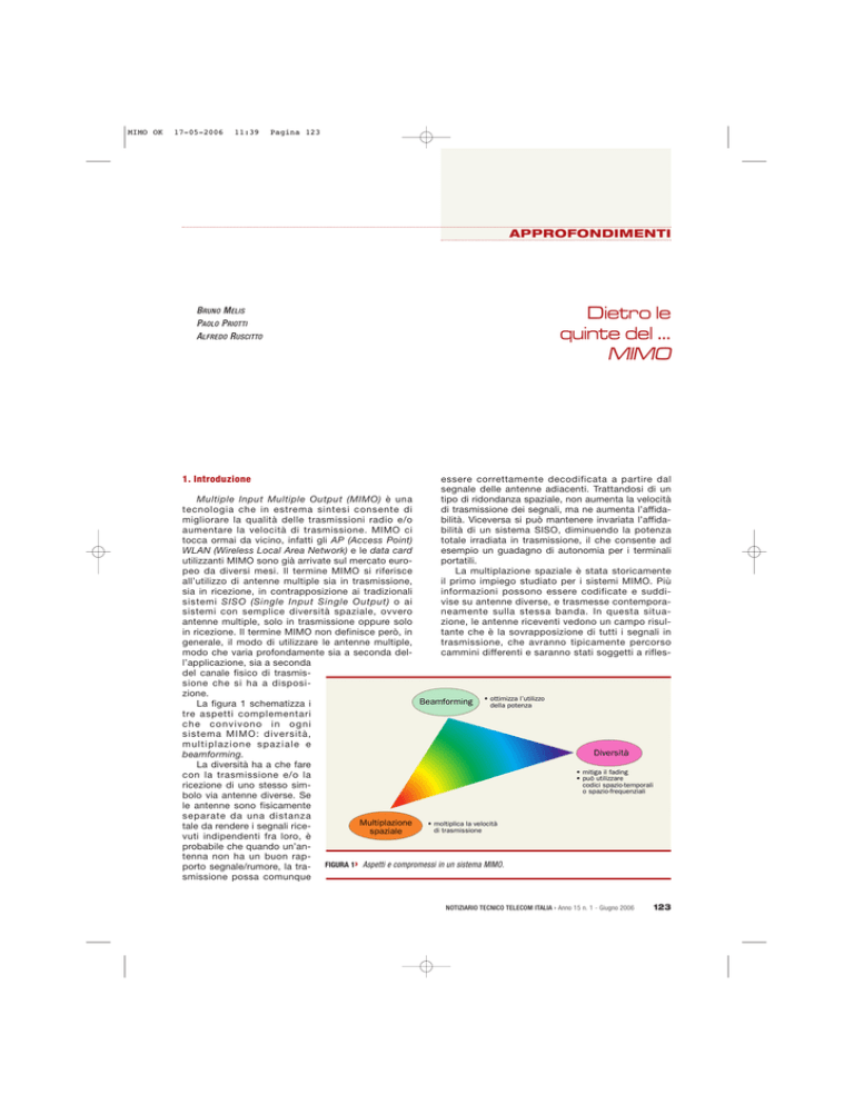 MIMO OK 17-05-2006 11:39 Pagina 123 APPROFONDIMENTI Dietro le quinte del ... MIMO BRUNO MELIS PAOLO PRIOTTI ALFREDO RUSCITTO 1. Introduzione essere correttamente decodificata a partire dal segnale delle antenne adiacenti. Trattandosi di un tipo di ridondanza spaziale, non aumenta la velocità di trasmissione dei segnali, ma ne aumenta l’affidabilità. Viceversa si può mantenere invariata l’affidabilità di un sistema SISO, diminuendo la potenza totale irradiata in trasmissione, il che consente ad esempio un guadagno di autonomia per i terminali portatili. La multiplazione spaziale è stata storicamente il primo impiego studiato per i sistemi MIMO. Più informazioni possono essere codificate e suddivise su antenne diverse, e trasmesse contemporaneamente sulla stessa banda. In questa situazione, le antenne riceventi vedono un campo risultante che è la sovrapposizione di tutti i segnali in trasmissione, che avranno tipicamente percorso cammini differenti e saranno stati soggetti a rifles- Multiple Input Multiple Output (MIMO) è una tecnologia che in estrema sintesi consente di migliorare la qualità delle trasmissioni radio e/o aumentare la velocità di trasmissione. MIMO ci tocca ormai da vicino, infatti gli AP (Access Point) WLAN (Wireless Local Area Network) e le data card utilizzanti MIMO sono già arrivate sul mercato europeo da diversi mesi. Il termine MIMO si riferisce all’utilizzo di antenne multiple sia in trasmissione, sia in ricezione, in contrapposizione ai tradizionali sistemi SISO (Single Input Single Output) o ai sistemi con semplice diversità spaziale, ovvero antenne multiple, solo in trasmissione oppure solo in ricezione. Il termine MIMO non definisce però, in generale, il modo di utilizzare le antenne multiple, modo che varia profondamente sia a seconda dell’applicazione, sia a seconda del canale fisico di trasmissione che si ha a disposizione. l’utilizzo Beamforming • ottimizza La figura 1 schematizza i della potenza tre aspetti complementari c he c onvivono i n o g n i sistema MIMO: diversità, multipla zione spazi al e e beamforming. La diversità ha a che fare con la trasmissione e/o la ricezione di uno stesso simbolo via antenne diverse. Se le antenne sono fisicamente separate da una distanza Multiplazione • moltiplica la velocità tale da rendere i segnali ricedi trasmissione spaziale vuti indipendenti fra loro, è probabile che quando un’antenna non ha un buon rapporto segnale/rumore, la tra- FIGURA 1› Aspetti e compromessi in un sistema MIMO. smissione possa comunque Diversità • mitiga il fading • può utilizzare codici spazio-temporali o spazio-frequenziali NOTIZIARIO TECNICO TELECOM ITALIA › Anno 15 n. 1 - Giugno 2006 123 MIMO OK 17-05-2006 11:39 Pagina 124 GASBARRONE • Alla scperta delle reti MESH sioni multiple differenti. Si dimostra matematicamente che se i vari cammini sono effettivamente indipendenti, è possibile ricostruire tutte le informazioni trasmesse a partire da tutti i segnali presenti sulle antenne riceventi. La multiplazione spaziale permette, su canali trasmissivi ad alto rapporto segnale/rumore e molto ricchi di oggetti riflettenti sparsi, di aumentare notevolmente la velocità di trasmissione. La multiplazione spaziale è realizzabile a patto di avere in ricezione un numero di antenne maggiore o uguale al numero di flussi di informazione trasmessi in parallelo. Viceversa, l’utilizzo di MIMO in diversità non pone vincoli sul numero di antenne in trasmissione e ricezione. Il beamforming consente invece, in generale, di indirizzare la potenza irradiata non uniformemente nello spazio, ma verso direzioni preferenziali in cui ad esempio possono essere localizzati gli utenti. Nei sistemi MIMO, quando il canale di trasmissione è noto al trasmettitore, è possibile adottare una codifica di trasmissione detta “eigen-beamforming” (ovvero beamforming basato sui modi spaziali del canale), che ottimizza l’utilizzo della potenza e massimizza la trasmissione dell’informazione tra tutte le antenne trasmittenti e tutte quelle riceventi. L’eigen-beamforming è utilizzabile soprattutto quando è possibile stimare il canale di trasmissione con grande precisione e quando la variazione nel tempo del canale stesso non è troppo rapida. Quando applicabile, l’ ei g en beamfor ming garan ti sce i n o l tre u n n o tevo l e aumento della capacità del canale rispetto ai sistemi SISO. Le tecnologie MIMO impiegate in sistemi commerciali si basano su una combinazione dei tre aspetti sopra riportati. Data questa genesi, è chiaro come non sia possibile dare ad un sistema MIMO massima diversità ed al contempo massimo grado di multiplazione spaziale. Si deve quindi progettare il sistema come un compromesso fra i due aspetti, che sono in contrapposizione e sono regolati dal cosiddetto “diversity-multiplexing trade-off” (ovvero compromesso tra diversità e multiplazione). L’utilizzo di eigen-beamforming, a sua volta, comporta un certo grado di diversità e di multiplazione spaziale. Nei recenti apparati di accesso broadband wireless e cellulari, si stanno progettando sistemi MIMO adattativi che consentono di muoversi all’interno del triangolo di figura 1, in modo da scegliere in ogni momento il tipo di modulazione MIMO più adatto alle condizioni del canale di trasmissione in un certo istante. 2. Applicazioni della tecnica MIMO La richiesta di nuovi servizi dati ad elevata velocità di trasmissione e la scarsa disponibilità di banda giustificano l’impiego di nuove tecnologie radio che consentono l’aumento dell’efficienza spettrale e della qualità radio dei futuri sistemi di comunicazione wireless. Per questa ragione la tec- 124 NOTIZIARIO TECNICO TELECOM ITALIA › Anno 15 n. 1 - Giugno 2006 nica MIMO è già oggi parte integrante di alcuni sistemi in corso di standardizzazione o il cui standard è stato recentemente completato. Occorre comunque ricordare che l’introduzione di una nuova tecnologia in un sistema d