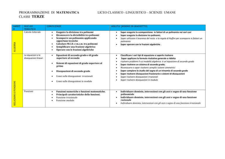 PROGRAMMAZIONE DI MATEMATICA CLASSI TERZE NUCLEO TEMATICO Calcolo letterale ALGEBRA AMBIT O RELAZIONI E FUNZIONI CONOSCENZE Funzioni ABILITA’ (MINIME IN GRASSETTO) Eseguire la divisione tra polinomi Riconoscere la divisibilità tra polinomi Scomporre un polinomio applicando opportune tecniche Calcolare M.C.D. e m.c.m. tra polinomi Semplificare una frazione algebrica Operare con le frazioni algebriche Saper eseguire la scomposizione in fattori di un polinomio nei vari casi Saper eseguire la divisione tra polinomi; Saper utilizzare il teorema del resto e la regola di Ruffini per scomporre in fattori un polinomio Saper operare con le frazioni algebriche . Equazioni di secondo grado e di grado superiore al secondo Sistemi di equazioni di grado superiore al primo Disequazioni di secondo grado Cenni sulle disequazioni irrazionali Cenni sulle disequazioni in modulo Classificare i vari tipi di equazione e saperle risolvere Saper applicare la formula risolutiva generale e ridotta risolvere problemi il cui modello algebrico è un’equazione di secondo grado Saper risolvere un sistema di secondo grado; Riconoscere e saper risolvere semplici sistemi simmetrici Saper compiere lo studio del segno di un trinomio di secondo grado Saper risolvere disequazioni frazionarie e sistemi di disequazioni Saper risolvere disequazioni irrazionali Saper risolvere disequazioni in modulo Funzioni numeriche e funzioni matematiche. Principali caratteristiche delle funzioni. Funzione irrazionale Funzione modulo Individuare dominio, intersezioni con gli assi e segno di una funzione polinomiale Individuare dominio, intersezioni con gli assi e segno di una funzione razionale Individuare dominio, intersezioni con gli assi e segno di una funzione irrazionale Le equazioni e le disequazioni lineari LICEO CLASSICO –LINGUISTICO – SCIENZE UMANE Coordinate cartesiane e Retta (richiami) GEOMETRIA Circonferenza Parabola GEOMETRIA Ellisse Coordinate cartesiane sul piano cartesiano. Punto medio di un segmento. Baricentro di un triangolo. Distanza tra due punti. Area di un triangolo Equazione lineare in x e y. Forma implicita della retta. Condizione di parallelismo e perpendicolarità tra due rette. Retta per un punto. Distanza di un punto da una retta. Simmetria assiale. Alcuni luoghi geometrici: asse di un segmento. La circonferenza come luogo geometrico, equazione cartesiana ed elementi caratterizzanti. Intersezioni di una circonferenza con una retta. Rette tangenti. Condizioni per determinare l’equazione di una circonferenza. Tracciare il grafico di una circonferenza di data equazione. Determinare l’equazione di una circonferenza dati alcuni elementi. Stabilire la posizione reciproca retta-circonferenza e circonferenzacirconferenza. Determinare l’equazione delle tangenti ad una circonferenza. Risolvere i problemi di geometria analitica sulla circonferenza. La parabola come luogo geometrico, equazione cartesiana ed elementi caratterizzanti. Equazione della parabola con asse di simmetria parallelo all’asse y e all’asse x. Intersezioni di una parabola con una retta. Rette tangenti. Condizioni per determinare l’equazione di una parabola. Disequazioni di secondo grado con uso della parabola. L’ellisse come luogo geometrico. Equazione e proprietà dell’ellisse. Intersezione di un’ellisse con una retta e condizione di tangenza. Condizioni per determinare l’equazione di un’ellisse. Individuare gli elementi caratterizzanti una parabola. Tracciare il grafico di una parabola di data equazione. Determinare l’equazione di una parabola dati alcuni elementi Stabilire la posizione reciproca retta-parabola. Trovare le rette tangenti ad una parabola. Risolvere problemi di geometria analitica sulla parabola. Individuare gli elementi caratterizzanti una ellisse. Tracciare il grafico di una ellisse di data equazione. Determinare l’equazione di una ellisse dati alcuni elementi. Stabilire la posizione reciproca retta-ellisse. Trovare le rette tangenti ad una ellisse. Risolvere problemi di geometria analitica sull’ellisse. Saper determinare le coordinate del punto medio di un segmento e la distanza tra due punti Calcolare e utilizzare il punto medio, la lunghezza di un segmento, il baricentro di un triangolo. Saper risolvere semplici problemi di geometria analitica Passare da grafico di una retta alla sua equazione e viceversa. Individuare, nell’equazione, il coefficiente angolare della retta. Determinare l’equazione di una retta dati alcuni elementi. Stabilire la posizione di due rette, anche utilizzando la condizione di parallelismo e di perpendicolarità. Calcolare la distanza tra punto e retta. Calcolare perimetro e area di un triangolo di un poligono. Determinare l’asse di un segmento. Iperbole DATI E PREVISIONI Probabilità L’iperbole come luogo geometrico. Equazione e proprietà dell’iperbole. Iperbole equilatera. Intersezioni di un’iperbole con una retta e condizioni di tangenza. Condizioni per determinare l’equazione di un’iperbole. L’iperbole traslata. La funzione omografica. Individuare gli elementi caratterizzanti una iperbole. Tracciare il grafico di una iperbole di data equazione. Determinare l’equazione di una iperbole dati alcuni elementi. Stabilire la posizione reciproca retta-iperbole. Trovare le rette tangenti ad una iperbole. Determinare le equazioni di iperboli traslate. Tracciare il grafico di iperboli traslate e di funzioni omografiche. Risolvere problemi di geometria analitica sull’iperbole. Calcolo combinatorio: combinazioni, disposizioni, permutazioni Definizione classica di probabilità Probabilità totale Probabilità contraria Probabilità condizionata Calcolare la probabilità di eventi semplici Utilizzare la probabilità della somma logica e del prodotto logico di eventi Calcolare la probabilità condizionata PROGRAMMAZIONE DI MATEMATICA CLASSI QUARTE . AMBITO NUCLEO TEMATICO Angoli e funzioni goniometriche GEOMETRIA RELAZIONI E FUNZIONI Formule goniometriche Equazioni