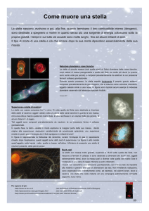 Materia nucleare, stelle di neutroni e altre “stranezze” Giuseppe Pagliara Dip. Fisica e Scienze della Terra, Universita' degli studi di Ferrara Sommario ● Intro: pulsars come laboratorio naturale per studiare le proprieta' della materia nucleare ● Struttura delle stelle compatte ● Materia “strana” ● Osservabili: supernovae, lampi di raggi gamma, onde gravitazionali Guardando nel cielo... X-ray & gamma-ray astronomy, anni '60 Opacita' dell'atmosfera: diverse bande dello spettro elettromagnetico “viste” con strumenti diversi. Radio-astronomia, anni '30 Astronomia (luce visibile) … dal Febbraio 2016, una nuova !! finestra di osservazione ! w e N dell'Universo VIRGO experiment (Pisa) Una misteriosa sorgente: radio-pulsar Crab pulsar Dalla prima (casuale) scoperta nel 1967 ad oggi si conoscono piu' di 2000 pulsars con periodi tra 1.4ms e 8.5 sec. Velocita' di rallentamento Stelle oscillanti? No, perche' il periodo cresce nel tempo, la stella rallenta. Interpretazione corretta: stelle rotanti dotate di un grosso campo magnetico Perdita di energia dovuta ad un campo magnetico rotante: Dalle misure di rallentamento si stima il campo B: campi magnetici fino a 1015 G (magnetars). Campi magnetici prodotti nei lab ∼ 106 G Una semplice stima della densita' media di una pulsar e della sua composizione Usando la gravita' Newtoniana, imponendo che la forza centrifuga sia uguale a quella gravitazionale per una particella posta sulla superficie 1 Msun=2×1033 gr, G=6.67×10−8 gr-1 cm3 s-2 (ex: dimostrare la formula) Il piu' piccolo periodo misurato: Massa tipica M=1-2 Msun Raggio piu' piccolo di circa 20km. Assumendo una sfera di densita' uniforme: ρ=M/(4/3 π R3) ~ 1014 gr/cm3 densita' dei nuclei atomici !!! Costituenti : neutroni e protoni ! Una pulsar è un gigantesco nucleo atomico. Carta dei nuclei Pulsar: 1057 neutroni (10% protoni). Stella di neutroni Perche' ruotano in fretta? Perche' hanno un campo magnetico cosi' grande? Neutron stars: responsabili di molti fenomeni astrofisici di alta energia ...inoltre: eventi esplosivi Segnale di neutrini associato alla formazione di una stella di neutroni in un' esplosione di supernova (unico esempio di detection diretta SN1987A … non ancora chiaro se nel centro della nebulosa ci sia una stella di neutroni o un buco nero) Lampi di raggi gamma -) Energia rilasciata 10-3 volte massa del sole (ex:tradurre in Joule mediante E=mc2) -) Detection: circa uno al giorno (BATSE experiment) -) Distanza: cosmologica (miliardi di anni luce) -) Motore interno: black-holes o stelle di neutroni Come sono fatte all'interno le stelle di neutroni (caso Newtoniano) ● La stabilita' meccanica viene dal bilancio tra gravita' e pressione della materia contenuta nella stella:M(r) (massa gravitazionale all'interno di una sfera di raggio “r” ), p(r) pressione, ρ(r) densita' di massa, ε densita di energia + condizioni iniziali : p(0)=pc , m(0)=0 + relazione tra pressione e densita' di energia i.e. Equazione di stato della materia nucleare. Ad un fissato valore di pc corrisponde una configurazione stabile con una determinata massa e raggio. Variazione della pressione Gravita' C'e' bisogno di lui: Le stelle di neutroni sono gli oggetti piu' estremi dopo i buchi neri, la gravita' di Newton è solo un'approssimazione (molto buona alle nostre scale) della relativita' generale. Modifiche di relativita' generale ● Equazione di TolmanOppenheimer-Volkov L'equazione di stato determina in modo univoco la relazione tra massa e raggio di una stella. Se l'equazione di stato è “soffice”: stelle compatte e leggere. “Dura”: grandi e pesanti. Idea: la fisica nucleare (particellare) determina l'equazione di stato. Misure astrofisiche di masse e raggi permettono di testare la microfisica dell'interazione nucleare ad alta densita'. Ogni punto corrisponde ad una stella (o a una specifica scelta di pc) Molte equazioni di stato (non conosciamo la fisica nucleare di alta densita' ), molte relazioni massaraggio by Lattimer Un' importante osservazione: a differenza del caso Newtoniano in relativita' generale esiste una massa massima Mmax . Oltre quel valore la stella collassa a buco nero. Un esempio (semplice) di equazione di stato P V = k N T (pressione*volume=costante di Boltzmann*numero di particelle*temperatura) =k n T (dove n=densita' di particelle), la pressione dipende da densita' e temperatura. Ma considerando una stella come un sistema che (approssimazione) non scambia calore, posso considerare una equazione di stato adiabatica: dQ=pdV+NCvT (primo principio della termodinamica, Cv calore specifico a volume costante, Cp calore specifico a pressione costante, Cp -Cv =R costante universale dei gas) Si prova che (esercizio): p ~ nγ dove γ =Cp/Cv è l'indice adiabatico. Piu' grande è il valore di γ piu' “dura” sara' l'equazione di stato... stelle piu' pesanti e piu' grandi. Ad esempio per un gas monoatomico γ =5/3 per un gas diatomico γ=7/5 …. (Cv = n.gradi di liberta' * R/2) … in generale γ=1+2/g dove “g” è il numero di gradi di liberta' (3 nel caso di un gas monoatomico (tre possibili direzioni), 5 nel caso di un gas diatomico...) Al crescere del numero di gradi di liberta' l'equazione di stato diventa soffice!! (remind for later!!!) Quanto è “ideale” l'equazione di stato della materia all'interno delle stelle di neutroni? Poco: ● Una prima fondamentale differenza: il comportamento a T ~ 0 (stella fredda) Per un'equazione di stato ideale la pressione dovrebbe essere nulla...ma le particelle microscopiche (neutroni) hanno comportamento diverso dalle particella della fisica classica. In particolare particelle come i neutroni e gli elettroni obbediscono al principio di esclusione di Pauli (due particelle non possono stare nello stesso livello energetico). Questo porta ad un valore finito di pressione nonostante la temperatura sia piccola o nulla , “pressione di Fermi”. Fermi Ad esempio: le “nane bianche” (destino del nostro sol