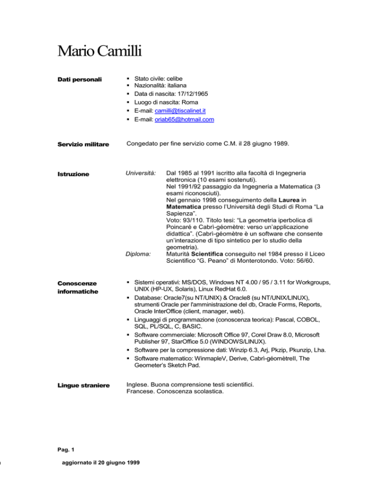 a Mario Camilli Dati personali Servizio militare Congedato per fine servizio come C.M. il 28 giugno 1989. Istruzione Università: Stato civile: celibe Nazionalità: italiana Data di nascita: 17/12/1965 Luogo di nascita: Roma E-mail: [email protected] E-mail: [email protected] Diploma: Dal 1985 al 1991 iscritto alla facoltà di Ingegneria elettronica (10 esami sostenuti). Nel 1991/92 passaggio da Ingegneria a Matematica (3 esami riconosciuti). Nel gennaio 1998 conseguimento della Laurea in Matematica presso l’Università degli Studi di Roma “La Sapienza”. Voto: 93/110. Titolo tesi: “La geometria iperbolica di Poincaré e Cabrì-géomètre: verso un’applicazione didattica”. (Cabrì-géomètre è un software che consente un’interazione di tipo sintetico per lo studio della geometria). Maturità Scientifica conseguito nel 1984 presso il Liceo Scientifico “G. Peano” di Monterotondo. Voto: 56/60. Conoscenze informatiche Sistemi operativi: MS/DOS, Windows NT 4.00 / 95 / 3.11 for Workgroups, UNIX (HP-UX, Solaris), Linux RedHat 6.0. Database: Oracle7(su NT/UNIX) & Oracle8 (su NT/UNIX/LINUX), strumenti Oracle per l'amministrazione del db, Oracle Forms, Reports, Oracle InterOffice (client, manager, web). Linguaggi di programmazione (conoscenza teorica): Pascal, COBOL, SQL, PL/SQL, C, BASIC. Software commerciale: Microsoft Office 97, Corel Draw 8.0, Microsoft Publisher 97, StarOffice 5.0 (WINDOWS/LINUX). Software per la compressione dati: Winzip 6.3, Arj, Pkzip, Pkunzip, Lha. Software matematico: WinmapleV, Derive, Cabrì-géomètreII, The Geometer’s Sketch Pad. Lingue straniere Inglese. Buona comprensione testi scientifici. Francese. Conoscenza scolastica. Pag. 1 aggiornato il 20 giugno 1999 a Corsi Corso presso la società ACSI dal 1 aprile al 19 giugno 1998: «Introduzione all’informatica». Panoramica generale sull’informatica: componenti hardware; codifica delle informazioni; sistemi di numerazione; memorie di massa; organizzazione dei files e loro accessi; sistemi operativi e software applicativo. Una settimana di corso. «Programmazione strutturata». Sistemi informativi e ingegneria del software; progettazione Top-Down; diagramma strutturale; strutture di controllo; modalità di realizzazione dei programmi. Tre settimane di corso con esame finale per accedere alla terza fase. «Cobol». Generalità; struttura di un programma; definizione dei dati; trattamento dei dati; trattamento dei files; le tabelle. Tre settimane di corso con esame finale per accedere alla quarta fase. «Programmare in ambiente IMS/ESA». Panoramica sistema online; messaggi, transazioni e loro flusso; message format service; data base management system; programmazione online; conversazioni; programmazione batch. Una settimana di corso. «Linguaggio SQL». Il modello relazionale DB2; le operazioni su tabelle; le funzioni speciali; il linguaggio SQL (DDL/DCL/DML); la programmazione. Due settimane di corso. Corsi presso la società SPIN s.r.l.: «Linguaggio SQL». Cenni sul database relazionale e sue proprietà; caratteristiche principali di Oracle server; cenni sulla struttura di Oracle server; introduzione ai linguaggi SQL e PL/SQL: il set dei comandi; utilizzo del linguaggio SQL: statement di SELECT, display dei dati, calcoli, operatori e funzioni SQL, join, selfjoin ed outer join, subquery informazioni, strutturate ad albero: CONNECT BY e START WITH; comandi SQL*Plus; esempi di costruzioni di script SQL*Plus; creazioni di oggetti: tavole, viste, sequenze, indici, sinonimi; definizione di constraints; descrizione dei datatypes di Oracle7 ed Oracle8; manipolazione dei dati; transazioni. Due settimane. «ORACLE 7: architettura e amministrazione».Vedi Oracle8: DBA. Una settimana. Corsi presso la ORACLE education: «ORACLE 8: DBA».Architettura del database server (ORACLE7 e ORACLE8); strutture di memoria; processi; struttura fisica; creazione e gestione di un nuovo database; gestione di Tablespace e Rollback segment; gestione degli spazi; Indici, Cluster indicizzati ed Hash Cluster; operazioni di Startup e Shutdown; gestione della concorrenza e della consistenza nelle transazioni; creazione e monitoraggio di Utenti e Profili; gestione di Ruoli e Privilegi. Cinque giorni. «ORACLE 8: backup & recover».Strategie e motivazioni di Backup e Recovery; architettura di un Oracle server (overview); Configurazione del server (ARCHIVELOG e NOARCHIVELOG mode); introduzione ad Oracle Recovery Manager (RMAN); configurazione di RMAN; backup fisici del database; tipi di failure e trobleshooting; restore e recovery del database; recovery complete e incomplete; utility Export e Import (backup logici); standby database. Tre giorni. Pag. 2 aggiornato il 20 giugno 1999 a Esperienze professionali Consulenze informatiche in un agenzia di assicurazioni e presso privati. Installazioni hardware, dei software e dei sistemi operativi suddetti (tranne UNIX). Ripetizioni di matematica, fisica ed informatica. Impiegato dal 17 giugno 1998 presso la società SPIN s.r.l. Dal 1 novembre 1998 consulente Oracle alla Camera dei Deputati (assistenza sistemistica dei db Oracle in produzione; controllo dei backups programmati dei db Oracle). Dal 13 maggio 1999 consulente Oracle in Saritel (implementazione della procedura di backup/recovery con RMAN su un db Oracle 8.0.5.1) Pag. 3 aggiornato il 20 giugno 1999