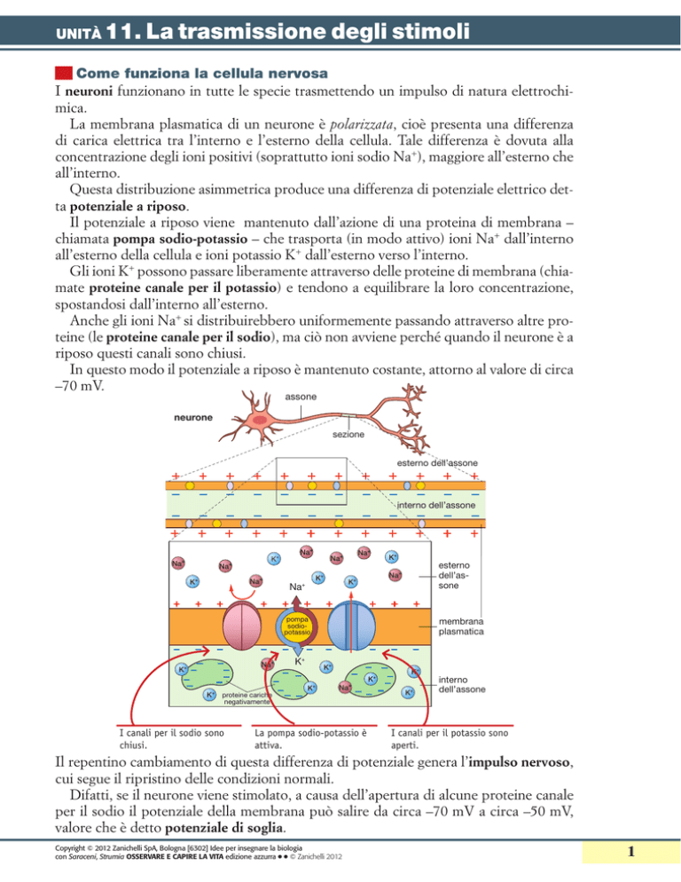 unità 11. La trasmissione degli stimoli Come funziona la cellula nervosa I neuroni funzionano in tutte le specie trasmettendo un impulso di natura elettrochimica. La membrana plasmatica di un neurone è polarizzata, cioè presenta una differenza di carica elettrica tra l’interno e l’esterno della cellula. Tale differenza è dovuta alla concentrazione degli ioni positivi (soprattutto ioni sodio Na+), maggiore all’esterno che all’interno. Questa distribuzione asimmetrica produce una differenza di potenziale elettrico detta potenziale a riposo. Il potenziale a riposo viene mantenuto dall’azione di una proteina di membrana – chiamata pompa sodio-potassio – che trasporta (in modo attivo) ioni Na+ dall’interno all’esterno della cellula e ioni potassio K+ dall’esterno verso l’interno. Gli ioni K+ possono passare liberamente attraverso delle proteine di membrana (chiamate proteine canale per il potassio) e tendono a equilibrare la loro concentrazione, spostandosi dall’interno all’esterno. Anche gli ioni Na+ si distribuirebbero uniformemente passando attraverso altre proteine (le proteine canale per il sodio), ma ciò non avviene perché quando il neurone è a riposo questi canali sono chiusi. In questo modo il potenziale a riposo è mantenuto costante, attorno al valore di circa –70 mV. assone neurone sezione esterno dell’assone interno dell’assone Na+ K+ Na+ Na+ K+ Na+ K+ Na+ Na+ Na+ K+ esterno dell’assone Na+ K+ pompa sodiopotassio Na+ K+ + K proteine cariche negativamente I canali per il sodio sono chiusi. K+ membrana plasmatica K+ K+ + Na La pompa sodio-potassio è attiva. BIO_11_02_01 K+ K+ K+ interno dell’assone I canali per il potassio sono aperti. Il repentino cambiamento di questa differenza di potenziale genera l’impulso nervoso, cui segue il ripristino delle condizioni normali. Difatti, se il neurone viene stimolato, a causa dell’apertura di alcune proteine canale per il sodio il potenziale della membrana può salire da circa –70 mV a circa –50 mV, valore che è detto potenziale di soglia. Copyright © 2012 Zanichelli SpA, Bologna [6302] Idee per insegnare la biologia con Saraceni, Strumia Osservare e capire la vita edizione azzurra ● ● © Zanichelli 2012 1 unità 11. La trasmissione degli stimoli Raggiunto questo valore di soglia, molti canali per il sodio si aprono e un gran numero di ioni Na+ passano dall’esterno all’interno della cellula. Dato che la concentrazione di cariche positive all’interno aumenta, il potenziale si inverte bruscamente e raggiunge un valore di +35 mV, che viene detto potenziale d’azione. Questa sequenza di eventi è detta depolarizzazione della membrana. Pochi istanti dopo le proteine canale per il sodio si richiudono, mentre quelle per il potassio – che nel frattempo erano chiuse – si riaprono e, grazie all’azione della pompa sodio-potassio, vengono ristabilite le condizioni a riposo. Questo processo è detto ripolarizzazione della membrana. esterno dell’assone interno dell’assone K+ K+ K+ Na+ K+ Na+ Na+ K+ Na+ esterno dell’assone pompa sodiopotassio Na+ Na+ membrana plasmatica K+ I canali per il sodio si aprono. Na K+ + K+ + K+ K+ Na+ + K+ Na K La pompa sodio-potassio è BIO_11_02_02 inattiva. + Na interno dell’assone I canali per il potassio si chiudono. L’impulso nervoso si trasmette lungo la membrana degli assoni delle cellule nervose. Il potenziale d’azione è un fenomeno elettrochimico localizzato. Perché si verifichi la trasmissione dell’impulso, la depolarizzazione deve trasmettersi dalla zona in cui è avvenuta al tratto immediatamente adiacente. La propagazione dello stimolo avviene esclusivamente in una direzione grazie al fatto che, nel tratto interessato dal potenziale d’azione, la pompa sodio-potassio sta operando per riportare le condizioni a riposo. La concentrazione di ioni potassio nel liquido interstiziale all’esterno della cellula, per un breve istante, risulta superiore rispetto a quella delle condizioni normali a riposo; ciò determina una iperpolarizzazione della membrana che persiste finché non viene ripristinato il valore di -70 mV. In questo lasso di tempo, che dura circa 2 millisecondi, la membrana non può ricevere alcuno stimolo. Questo periodo di refrattarietà impedisce la trasmissione della depolarizzazione nella stessa direzione da cui è provenuta, evitando di fatto che la trasmissione dell’impulso si blocchi. Gli assoni delle cellule nervose umane sono avvolti dalle cellule di Schwann che formano la guaina mielinica isolante, interrotta in corrispondenza dei cosiddetti nodi di Ranvier. L’impulso nervoso procede «saltando» da un nodo di Ranvier all’altro e quindi avanza molto più rapidamente di quanto farebbe se dovesse percorrere l’intero assone. Copyright © 2012 Zanichelli SpA, Bologna [6302] Idee per insegnare la biologia con Saraceni, Strumia Osservare e capire la vita edizione azzurra ● ● © Zanichelli 2012 2 unità 11. La trasmissione degli stimoli La trasmissione dell’impulso tra neuroni I neuroni sensoriali, che acquisiscono lo stimolo sensoriale, e i neuroni di associazione, che svolgono la funzione di elaborazione e integrazione, trasmettono l’impulso ad altre cellule nervose. I neuroni motori invece passano lo stimolo alle cellule muscolari. L’impulso nervoso viene trasferito da una cellula all’altra e alle cellule muscolari attraverso le sinapsi. Le sinapsi sono i punti di contatto tra due neuroni o tra un neurone e una cellula muscolare. Le sinapsi trasmettono alla cellula successiva l’impulso nervoso nel momento in cui esso arriva al termine dell’assone. Esistono due tipi di sinapsi: –le sinapsi elettriche, –le sinapsi chimiche. 1.Nelle sinapsi elettriche il potenziale d’azione passa da una cellula alla successiva con un meccanismo del tutto simile a quello di propagazione dell’impulso all’interno della cellula stessa. Molto spesso le sinapsi elettriche possono trasmettere l’impulso nervos