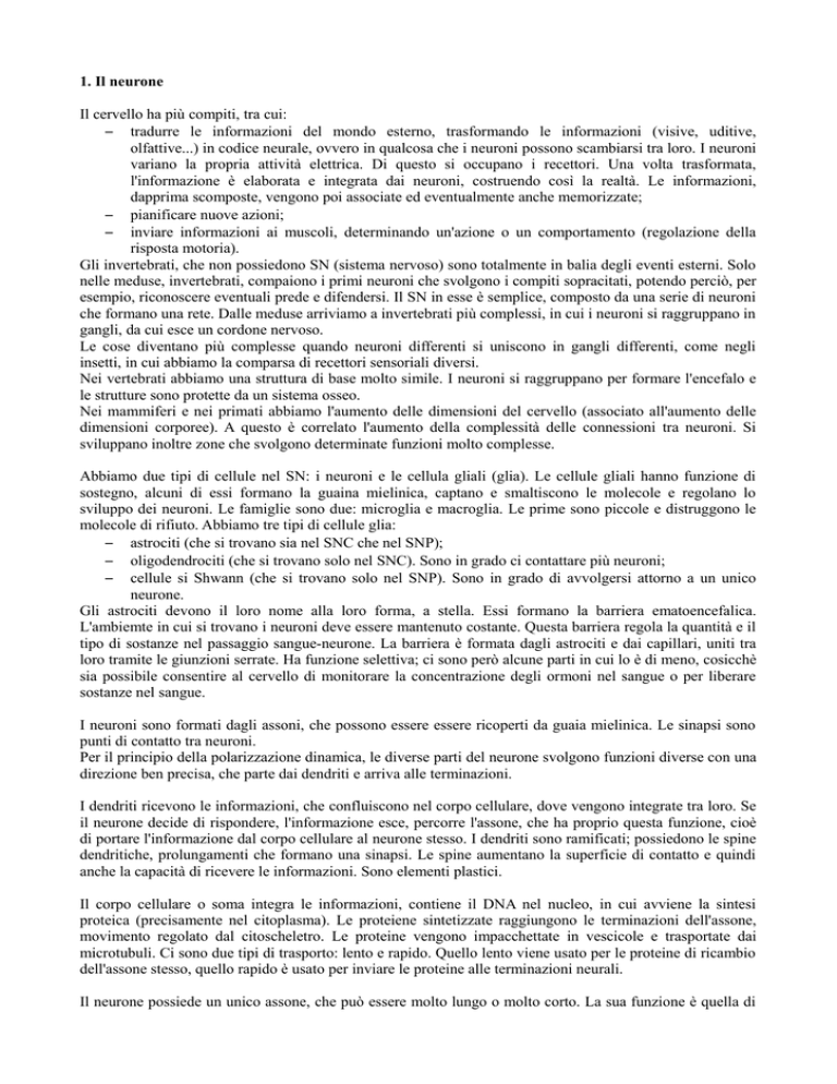 1. Il neurone Il cervello ha più compiti, tra cui: – tradurre le informazioni del mondo esterno, trasformando le informazioni (visive, uditive, olfattive...) in codice neurale, ovvero in qualcosa che i neuroni possono scambiarsi tra loro. I neuroni variano la propria attività elettrica. Di questo si occupano i recettori. Una volta trasformata, l'informazione è elaborata e integrata dai neuroni, costruendo così la realtà. Le informazioni, dapprima scomposte, vengono poi associate ed eventualmente anche memorizzate; – pianificare nuove azioni; – inviare informazioni ai muscoli, determinando un'azione o un comportamento (regolazione della risposta motoria). Gli invertebrati, che non possiedono SN (sistema nervoso) sono totalmente in balia degli eventi esterni. Solo nelle meduse, invertebrati, compaiono i primi neuroni che svolgono i compiti sopracitati, potendo perciò, per esempio, riconoscere eventuali prede e difendersi. Il SN in esse è semplice, composto da una serie di neuroni che formano una rete. Dalle meduse arriviamo a invertebrati più complessi, in cui i neuroni si raggruppano in gangli, da cui esce un cordone nervoso. Le cose diventano più complesse quando neuroni differenti si uniscono in gangli differenti, come negli insetti, in cui abbiamo la comparsa di recettori sensoriali diversi. Nei vertebrati abbiamo una struttura di base molto simile. I neuroni si raggruppano per formare l'encefalo e le strutture sono protette da un sistema osseo. Nei mammiferi e nei primati abbiamo l'aumento delle dimensioni del cervello (associato all'aumento delle dimensioni corporee). A questo è correlato l'aumento della complessità delle connessioni tra neuroni. Si sviluppano inoltre zone che svolgono determinate funzioni molto complesse. Abbiamo due tipi di cellule nel SN: i neuroni e le cellula gliali (glia). Le cellule gliali hanno funzione di sostegno, alcuni di essi formano la guaina mielinica, captano e smaltiscono le molecole e regolano lo sviluppo dei neuroni. Le famiglie sono due: microglia e macroglia. Le prime sono piccole e distruggono le molecole di rifiuto. Abbiamo tre tipi di cellule glia: – astrociti (che si trovano sia nel SNC che nel SNP); – oligodendrociti (che si trovano solo nel SNC). Sono in grado ci contattare più neuroni; – cellule si Shwann (che si trovano solo nel SNP). Sono in grado di avvolgersi attorno a un unico neurone. Gli astrociti devono il loro nome alla loro forma, a stella. Essi formano la barriera ematoencefalica. L'ambiemte in cui si trovano i neuroni deve essere mantenuto costante. Questa barriera regola la quantità e il tipo di sostanze nel passaggio sangue-neurone. La barriera è formata dagli astrociti e dai capillari, uniti tra loro tramite le giunzioni serrate. Ha funzione selettiva; ci sono però alcune parti in cui lo è di meno, cosicchè sia possibile consentire al cervello di monitorare la concentrazione degli ormoni nel sangue o per liberare sostanze nel sangue. I neuroni sono formati dagli assoni, che possono essere essere ricoperti da guaia mielinica. Le sinapsi sono punti di contatto tra neuroni. Per il principio della polarizzazione dinamica, le diverse parti del neurone svolgono funzioni diverse con una direzione ben precisa, che parte dai dendriti e arriva alle terminazioni. I dendriti ricevono le informazioni, che confluiscono nel corpo cellulare, dove vengono integrate tra loro. Se il neurone decide di rispondere, l'informazione esce, percorre l'assone, che ha proprio questa funzione, cioè di portare l'informazione dal corpo cellulare al neurone stesso. I dendriti sono ramificati; possiedono le spine dendritiche, prolungamenti che formano una sinapsi. Le spine aumentano la superficie di contatto e quindi anche la capacità di ricevere le informazioni. Sono elementi plastici. Il corpo cellulare o soma integra le informazioni, contiene il DNA nel nucleo, in cui avviene la sintesi proteica (precisamente nel citoplasma). Le proteiene sintetizzate raggiungono le terminazioni dell'assone, movimento regolato dal citoscheletro. Le proteine vengono impacchettate in vescicole e trasportate dai microtubuli. Ci sono due tipi di trasporto: lento e rapido. Quello lento viene usato per le proteine di ricambio dell'assone stesso, quello rapido è usato per inviare le proteine alle terminazioni neurali. Il neurone possiede un unico assone, che può essere molto lungo o molto corto. La sua funzione è quella di condurre i segnali elettrici, dal corpo cellulare alle strutture bersaglio. La guaina mielinica aumenta la capacità dell'assone di condurre le informazioni. Si ramifica nel terminale dell'assone. Se ce l'ha, nel terminale l'assone perde la guaina mielinica. I neuroni possono essere classificati in tre modi: – a seconda del numero di prolungamenti, il neurone può essere unipolare (una propaggine), bipolare, pseudo-unipolare (a T), multipolare (unico assone, tante propaggini); – a seconda della funzione. I neuroni sensitivi partecipano all'acquisizione di stimoli, trasportando le informazioni dagli organi sensoriali al sistema nervoso centrale. Gli interneuroni, all'interno del sistema centrale, integrano i dati forniti dai neuroni sensoriali e li trasmettono ai neuroni motori. I motoneuroni emanano impulsi di tipo motorio agli organi della periferia corporea. Nel SNC abbiamo gli interneuroni locali e i neuroni a proiezione, così chiamati perché proeittano al di fuori della struttura in cui si trovano. 2. La membrana neuronale I neuroni, come tutte le altre cellule, sono completamente avvolti dalla membrana cellulare, in questo caso chiamata neuronale. La membrana neuronale ha un doppio strato fosfolipido, con teste polari e code apolari, disposte con la parte polare rivolta verso l'esterno e l'interno e la parte polare nel mezzo. Come tutte le altre cellule, i neuroni sono formati da glucidi, lipidi, protidi e acidi nucleici. Gli elementi principali che li compongono sono principalmente l'idrogeno, l'ossigeno, il carbon