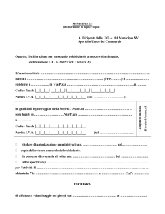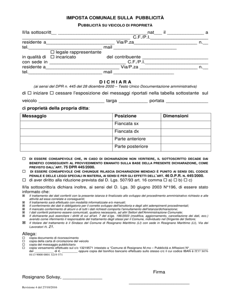 IMPOSTA COMUNALE SULLA PUBBLICITÀ PUBBLICITÀ SU VEICOLO DI PROPRIETÀ Il/la sottoscritt__ __________________________________nat___ il ______________ a _________________________________________ C.F./P.I.______________________ residente a__________________________ Via/P.za________________________ n.__ tel.____________________________ mail ________________________ legale rappresentante in qualità di incaricato del contribuente _________________________ con sede in _____________________________ C.F./P.I.________________________ residente a____________________________ Via/P.za ______________________ n.__ tel.____________________________ mail _______________________ DICHIARA (ai sensi del DPR n. 445 del 28 dicembre 2000 – Testo Unico Documentazione amministrativa) di iniziare cessare l’esposizione dei messaggi riportati nella tabella sottostante sul veicolo _________________________ targa ___________ portata ________________ di proprietà della propria ditta: Messaggio Posizione Dimensioni Fiancata sx Fiancata dx Parte anteriore Parte posteriore DI ESSERE CONSAPEVOLE CHE, IN CASO DI DICHIARAZIONI NON VERITIERE, IL SOTTOSCRITTO DECADE DAI BENEFICI CONSEGUENTI AL PROVVEDIMENTO EMANATO SULLA BASE DELLA PRESENTE DICHIARAZIONE, COME PREVISTO DALL’ART. 75 DPR 445/2000. DI ESSERE CONSAPEVOLE CHE CHIUNQUE RILASCIA DICHIARAZIONI MENDACI È PUNITO AI SENSI DEL CODICE PENALE E DELLE LEGGI SPECIALI IN MATERIA, AI SENSI E PER GLI EFFETTI DELL’ART. 46 D.P.R. N. 445/2000. di aver diritto alla riduzione prevista dal D. Lgs. 507/93 art. 16 comma a) b) c) Il/la sottoscritto/a dichiara inoltre, ai sensi del D. Lgs. 30 giugno 2003 N°196, di essere stato informato che: Il trattamento dei dati conferiti con la presente istanza è finalizzato allo sviluppo del procedimento amministrativo richiesto e alle attività ad essa correlate e conseguenti; Il trattamento sarà effettuato con modalità informatizzate e/o manuali; Il conferimento dei dati è obbligatorio per il corretto sviluppo dell'istruttoria e degli altri adempimenti procedimentali; Il mancato conferimento di alcuni o di tutti i dati richiesti comporta l'annullamento dell'istanza/dichiarazione; I dati conferiti potranno essere comunicati, qualora necessario, ad altri Settori dell'Amministrazione Comunale; Il dichiarante può esercitare i diritti di cui all'art. 7 del d.lgs. 196/2003 (modifica, aggiornamento, cancellazione dei dati, ecc.) avendo come riferimento il responsabile del trattamento degli stessi per il Comune, individuato nel Dirigente del Settore; Il titolare del trattamento è il Sindaco del Comune di Rosignano Marittimo (LI) con sede in Rosignano Marittimo (LI), Via dei Lavoratori n. 21. Allega: copia documento di riconoscimento copia della carta di circolazione del veicolo copia del messaggio pubblicitario copia versamento effettuato sul c/c 13219571 intestato a “Comune di Rosignano M.mo – Pubblicità e Affissioni N°___________ del ___________ di €. _________ oppure copia del bonifico bancario effettuato sullo stesso c/c il cui codice IBAN è IT37 S076 0113 9000 0001 3219 571 Firma Rosignano Solvay, _______________ _______________________ Revisione 4 del 27/10/2016 Esente IVA (art. 10/5 DPR 633/72) – Esente da bollo (art. 5/tab. b. DPR 642/72)
