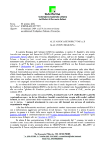 AZIENDA OSPEDALIERA DELLA PROVINCIA DI LODI ______________________________________________________________________ Sede: 26900 Lodi – Via Fissiraga, 15 C.F. - P.I. n. 03426440966 ______________________________________________________________________ PROPOSTA DI DELIBERAZIONE ______________________________________________________________________ Servizio/U.O. proponente Responsabile del procedimento A.O. Gestione e Sviluppo Risorse Umane MARIA FRANCESCA FASANO Numero repertorio ufficio Funzionario Istruttore 0538-13 Lia Ferla OGGETTO: PRONTUARIO FARMACEUTICO ALLE DIMISSIONI. AGGIORNAMENTO 5° REVISIONE - SETTEMBRE 2013 ELENCO INCARICHI DI CONSULENZA INDIVIDUALI / CON SOCIETA’ PRESENTI IN AZIENDA DA PUBBLICARE SUL SITO AZIENDALE: NOMINATIVO/ DENOMINAZIONE SOCIETA’/ STUDIO PROF.LE OGGETTO PROVVEDIMENTO QUALIFICA PROFESSIONALE/ AMBITO DI UTILIZZO/ MATERIA SPECIFICA TIPOLOGIA DI CONTRATTO PRONTUARIO FARMACEUTICO ALLE DIMISSIONI. AGGIORNAMENTO 5° REVISIONE - SETTEMBRE 2013 AREA / SETTORE DI ASSEGNAZIONE DATA INIZIO CONTRATTO SCADENZA CONTRATTO TOTALE COMPENSO ANNUO (in unità di Euro) ________________________________________________________________________ ISTRUTTORIA Libro delle deliberazioni del Direttore Generale Foglio n. Il Direttore Generale (dott. Giuseppe Rossi) AZIENDA OSPEDALIERA DELLA PROVINCIA DI LODI _______________________________________________________________________ Sede: 26900 Lodi – Via Fissiraga, 15 C.F. - P.I. n. 03426440966 _______________________________________________________________________ VERBALE DI DELIBERAZIONE DEL DIRETTORE GENERALE N 0651-13 DEL 14/11/2013 Servizio/U.O. proponente A.O. Gestione e Sviluppo Risorse Umane Responsabile del procedimento (firma) MARIA FRANCESCA FASANO ________________________________________________________________________ OGGETTO: PRONTUARIO FARMACEUTICO ALLE DIMISSIONI. AGGIORNAMENTO 5° REVISIONE - SETTEMBRE 2013 ________________________________________________________________________ IL DIRETTORE GENERALE RICHIAMATE le precedenti deliberazioni n. 959 del 16.12.2008, n. 1057 del 23.12.2009, n. 891 del 26.10.2010, n. 1190 del 22.12.2011e n. 968 del 16.11.2012, con le quali è stato aggiornato il “Prontuario alle dimissioni” che prevede un elenco dei farmaci ATC indicati dalla Regione, per i quali è valutata la concedibilità, la presenza dei farmaci equivalenti, le note AIFA e le indicazioni d’uso approvate; DATO ATTO che l’iniziativa, in linea con le indicazioni emanate dal Ministero della Salute, Agenzia del Farmaco (AIFA), è stata motivata dagli obiettivi che la Regione con la DGR n. IX/2633 del 6.12.2011 ha dato ai Direttori Generali per l’anno 2013 (Promozione dei farmaci equivalenti con condivisione con la ASL, produzione e pubblicazione su sito web del prontuario alla dimissione, condiviso con l’ASL, con indicazione di farmaci equivalenti) e dai Progetti di Miglioramento concordati con l’ASL; Libro delle deliberazioni del Direttore Generale segue deliberazione n. 0651-13 Foglio n. del Il Direttore Generale (dott. Giuseppe Rossi) 14/11/2013 VISTO il Prontuario alle Dimissioni aggiornato al settembre 2013, predisposto a cura del Responsabile del Servizio di Farmacia dell’A.O., sulla base delle indicazioni emerse, previa approfondito esame, dal giudizio al riguardo espresso dalla Commissione Farmaco terapeutica Interaziendale A.O. e ASL della Provincia di Lodi, nella quale sono state esaminate analiticamente i farmaci ascrivibili ai vari gruppi terapeutici; RITENUTO di approvare il citato Prontuario alle Dimissioni e l’elenco dei farmaci, documento che si allega al presente provvedimento di cui costituisce parte integrante e sostanziale; DATO ATTO dell’istruttoria compiuta dal Responsabile del Procedimento, che ne attesta la completezza e della dichiarazione di regolarità tecnica e legittimità espressa dal Direttore dell’Unità Operativa Gestione e Sviluppo Risorse Umane proponente il presente provvedimento; PRESO ATTO del parere favorevole del Direttore Amministrativo e del Direttore Sanitario, ciascuno per le rispettive competenze DELIBERA 1. per i motivi descritti in narrativa, di approvare il Prontuario alle Dimissioni e l’elenco dei farmaci aggiornato al settembre 2013, predisposto a cura del Responsabile del Servizio Farmaceutico dell’A.O. della Provincia di Lodi, sulla base delle indicazioni emerse, previa approfondito esame, dal giudizio al riguardo espresso dalla Commissione Farmaco terapeutica Interaziendale A.O. e ASL della Provincia di Lodi, nella quale sono state esaminate analiticamente i farmaci ascrivibili ai vari gruppi terapeutici, prontuario che si allega al presente atto, come sua parte integrante e sostanziale 2. di comunicare la decisione assunta con la presente deliberazione alle persone, UU.OO e servizi dell’A.O. e all’ASL , con pubblicazione sul sito web del Prontuario alle Dimissioni, affinché allo stesso sia data la massima diffusione, per la sua pratica applicazione, nonché al Collegio Sindacale dell’A.O. e alla Regione Lombarda, Assessorato alla Sanità, posto che la stesura del Prontuario, come precisato in premessa, rientra tra gli obiettivi che la Regione Lombardia ha stabilito per i Direttori Generali per l’anno 2013; 3. di conferire al Direttore dell’Unità Operativa Gestione e Sviluppo Risorse Umane per l’adozione del presente atto deliberativo ogni più ampia facoltà di attuazione della presente deliberazione, compresa la diffusione eventuale agli uffici interessati e coinvolti nel presente procedimento. IL DIRETTORE GENERALE (Dott. Giuseppe Rossi) Libro delle deliberazioni del Direttore Generale segue deliberazione n. 0651-13 Foglio n. del Il Direttore Generale (dott. Giuseppe Rossi) 14/11/2013 ATTESTAZIONI DI REGOLARITA’ TECNICA E CONTABILE SERVIZIO O UNITA’ OPERATIVA PROPONENTE: NOME U.O.: A.O. Gestione e Sviluppo Risorse Umane Si attesta la regolarità tecnica del provvedimento essendo state osservate le norme e le procedure previs