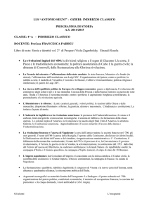 LICEO GINNASIO PARITARIO “SAN GIOVANNI BOSCO” CAGLIARI Anno scolastico 2012-2013 PROGRAMMA DI STORIA 2° LICEO CLASSICO Testo adottato “Chiaroscuro” di F. Feltri; M. M. Bertazzoni; F. Neri vol. II SEI ed. prof. Mocci Giuseppe MODULO 1 La politica europea del XVI secolo Il concetto di “economia mondo”. Il concetto di “capitalismo”. Il caso olandese nella prima metà del XVII secolo. Lettura e approfondimento di: Il capitalismo e le disuguaglianze nel mondo. (di Fernand Braudel). Il Seicento: secolo di ombre e di luci. Il concetto Stato e Nazione. La guerra dei 30 anni: le conseguenze geopolitiche in Europa. La Francia di Richelieu e Mazzarino. Luigi XIV: la realizzazione del potere assoluto. Gli imperi coloniali: il caso olandese nel XVII secolo. Francia: Il mercantilismo. Il “Colbertismo”. La guerra franco-olandese. La crisi di successione spagnola. La crisi dell’impero spagnolo. L’Inghilterra e la restaurazione degli Stuart. Il pensiero politico di Hobbes e quello di Locke a confronto. Conflitti tra whigs e tories. La seconda rivoluzione inglese. The “Bill of rights”. Il dibattito sulla democrazia in Inghilterra. I livellatori. La figura di Cromwell. I limiti della concezione liberale. La restaurazione della monarchia. MODULO 2 Dal concetto di guerra “mondiale” alla rivoluzione americana Il dispotismo illuminato in Austria. Le riforme. Austria e Prussia. Le differenti teorie filosofiche ed illuminstiche in relazione al potere moderno: Verri e Beccaria. La Guerra dei 7 anni: una guerra mondiale. La rivoluzione americana. La mentalità puritana. La nascita degli Stati Uniti d’America. Proclamazione dell’indipendenza. La costituzione del 1787. La paura della democrazia. MODULO 3 La rivoluzione francese e la figura di Napoleone La rivoluzione francese: dagli Stati generali all’Assemblea Nazionale. L’assemblea costituente e la Costituzione del 1791. La fine della monarchia. La costituzione del 1793. Robespierre. Dalla repubblica giacobina alla repubblica borghese. Il terrore. La costituzione moderata del 1795. Il Direttorio. La figura di Napoleone. L’ascesa e la costruzione dell’impero. Il codice civile. L’egemonia francese in Europa. Il crollo dell’impero napoleonico. La rivoluzione industriale. Approfondimento su il concetto di “liberismo”. Adam Smith e la mano invisibile. Malthus. MODULO 4 Congresso di Vienna: I moti insurrezionali in Europa verso l’unificazione italiana Il Congresso di Vienna. Le conseguenze del Congresso di Vienna. L’Europa e il processo di difficile restaurazione. L’opposizione ai governi restaurati: le società segrete in Italia. I moti del 1820-21. I moti del 1830 in Francia. Mazzini e il mazzinianesimo. La Giovine Italia. Moderati e neoguelfi. Gioberti, Cattaneo. I moti del ’48 in Europa. La Francia dalla repubblica democratica alla presidenza di Luigi Napoleone. La I guerra di indipendenza. Il Piemonte di Carlo Alberto e il ruolo di Pio IX. Il Piemonte costituzionale. Cavour: dalla II guerra d’indipendenza alla spedizione dei mille. L’unificazione italiana. L’unificazione tedesca. La seconda rivoluzione industriale. La grande depressione. I processi di concentrazione industriale. L’età dell’imperialismo. Le diverse forme e le ragioni dell’imperialismo. I problemi dell’Italia unita. La questione meridionale. La “destra storica”. I problemi della “sinistra storica”. Le principali riforme. Il governo di Crispi. La politica coloniale. La nascita del partito socialista. La crisi del “giolittismo” di fine secolo. Educazione civica: Alcuni temi di carattere generale sono stati trattati durante lo svolgimento del programma di Storia. Cagliari 4 giugno 2013 Per la classe L’insegnante