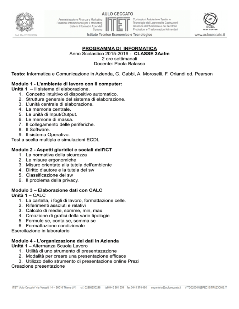 PROGRAMMA DI INFORMATICA Anno Scolastico 2015-2016 - CLASSE 3Aafm 2 ore settimanali Docente: Paola Balasso Testo: Informatica e Comunicazione in Azienda, G. Gabbi, A. Moroselli, F. Orlandi ed. Pearson Modulo 1 - L’ambiente di lavoro con il computer: Unità 1 – Il sistema di elaborazione. 1. Concetto intuitivo di dispositivo automatico. 2. Struttura generale del sistema di elaborazione. 3. L’unità centrale di elaborazione. 4. La memoria centrale. 5. Le unità di Input/Output. 6. Le memorie di massa. 7. Il collegamento delle periferiche. 8. Il Software. 9. Il sistema Operativo. Test a scelta multipla e simulazioni ECDL Modulo 2 - Aspetti giuridici e sociali dell'ICT 1. La normativa della sicurezza 2. Le misure ergonomiche 3. Misure orientate alla tutela dell'ambiente 4. Diritto d'autore e la tutela del sw 5. Classificazione del sw 6. Il problema della privacy. Modulo 3 – Elaborazione dati con CALC Unità 1 – CALC 1. La cartella, i fogli di lavoro, formattazione celle. 2. Riferimenti assoluti e relativi 3. Calcolo di medie, somme, min, max 4. Creazione di grafici della varie tipologie 5. Formule se, conta.se, somma.se 6. Formattazione condizionale Esercitazione in laboratorio Modulo 4 - L'organizzazione dei dati in Azienda Unità 1 – Alternanza Scuola Lavoro 1. Utilità di uno strumento di presentazazione 2. Modalità per creare una presentazione efficace 3. Utilizzo dello strumento di presentazione online Prezi Creazione presentazione Unità 2 – Gli archivi e le basi di dati 1. Dagli archivi ai database 2. Utilizzo del DBMS Access e Base 3. Creazione di batabase Unità 3 – Progettazione dei database: livello concettuale 1. Modello E/R 2. Entità: definizioni, terminologia specifica 3. Attributi: tipologia, caratteristiche generali 4. Associazioni: 1:1,1:N e N:M Test teorico Unità 3 – Progettazione dei database: livello logico 1. Mapping del modello E/R nel modello relazionale 2. Grado, cardinalità Unità 4 – Creazione di una base di dati in Base 1. Creazione tabelle 2. La manipolazione dei dati in una tabella 3. Vincoli sugli attributi 4. Relazioni tra tabelle 5. Creazioni query, funzioni, criteri, ordinamenti e query parametriche 6. Creazione maschere e report Esercizi di riepilogo in laboratorio con la realizzazione di semplici DBMS con Base di Libre Office a partire dalle progettazioni concettuale e logica Compiti di laboratorio con creazione di data base e risposta alle query Thiene 06/06/2016 I Rappresentanti di Classe L’insegnante Paola Balasso ______________________________ ________________________ ______________________________