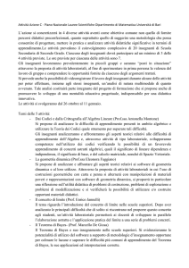 Liceo Scientifico Statale “Leonardo” – Brescia PROGRAMMA DI MATEMATICA CLASSE 5 T Scientifico a.s. 2012/2013 Prof.ssa Caruzzo Laura GEOMETRIA 1. Ciclometria: classi contigue di grandezze, la rettificazione della circonferenza, lunghezza della circonferenza e di un arco, area del cerchio e di un settore circolare, Sezione Aurea, Tre Problemi Classici della Geometria. 2. Geometria solida: rette e piani nello spazio, incidenza, parallelismo, ortogonalità nello spazio, Teorema delle tre perpendicolari, angoli di rette e piani, angoli diedri, triedri e angoloidi, poliedri : definizioni e principali caratteristiche, solidi di rotazione: definizioni e principali caratteristiche, poliedri platonici: definizioni e principali caratteristiche, sviluppo della superficie di un solido, misura della superficie di un solido, equivalenza tra solidi e principio di Cavalieri, misura del volume dei solidi . 3. Geometrie non euclidee: il metodo assiomatico nelle teorie ipotetiche deduttive, postulati ed assiomi della geometria euclidea, ipotesi di Lobacevskij, geometria iperbolica: modello di Klein, modello di Poincaré, la geometria ellittica di Riemann e il modello della superficie sferica. PROBABILITA’ E STATISTICA 1. Calcolo combinatorio: insiemi e raggruppamenti; disposizioni semplici e con ripetizione; permutazioni semplici e con ripetizione; combinazioni semplici e con ripetizione; coefficienti binomiali. 2. Probabilità: eventi, definizione classica, statistica, soggettiva di probabilità; definizione assiomatica di probabilità; probabilità totale, probabilità condizionata, probabilità composta, il problema delle prove ripetute, il teorema di Bayes TOPOLOGIA 1. Elementi di topologia della retta reale: insiemi di numeri o di punti, estremo superiore e inferiore di un insieme, massimo e minimo di un insieme, insiemi limitati e illimitati, intorni ed intervalli, punti di accumulazione, punti isolati. Il concetto di infinito. ANALISI MATEMATICA 1. Relazioni e funzioni: nascita ed evoluzione storica dell’analisi matematica e del concetto di funzione, concetto di funzione, definizioni fondamentali: funzione univoca, biettiva, 1 Liceo Scientifico Statale “Leonardo” – Brescia monotona, funzione inversa, funzione composta, dominio, condominio, Teorema sulla monotonia ed invertibilità di una funzione. Ripasso di grafici: coniche, funzioni irrazionali riconducibili alle coniche, funzioni esponenziale e logaritmica, , funzioni goniometriche, curve deducibili dalle precedenti. Risoluzione grafica di un’equazione: metodo di bisezione, metodo del punto unito, metodo delle tangenti di Newton. 2. Limiti: nozione di limite di una funzione, definizione di limite nei vari casi, rappresentazione grafica e verifica algebrica, Teorema dell'unicità del limite, Teoremi della permanenza del segno, Teoremi del confronto, operazioni sui limiti e forme indeterminate, somma di due funzioni, prodotto di due funzioni, quoziente di due funzioni, elevamento a potenza, definizione di successione numerica, successioni convergenti, divergenti e indeterminate, progressioni aritmetiche, progressioni geometriche. 3. Funzioni continue: funzione continua in un punto x0 e in un intervallo [a,b], limiti notevoli, forme indeterminate, punti di discontinuità e loro classificazione, Teorema di esistenza degli zeri, Teorema di Weierstrass, Teorema di Darboux. Infinitesimi, ordine di un infinitesimo, Principio di sostituzione degli infinitesimi, infiniti, gerarchia degli infiniti. 4. Calcolo differenziale: rapporto incrementale di una funzione nell'intorno di un suo punto, definizione di derivata di una funzione in un suo punto, significato geometrico di rapporto incrementale e di derivata, punti stazionari, funzioni non derivabili in un punto, Teorema della continuità delle funzioni derivabili. Derivate delle funzioni elementari, teoremi sul calcolo delle derivate, derivata logaritmica, derivata di una funzione inversa, derivate successive di una funzione. Differenziale di una funzione, significato geometrico del differenziale. Teorema di Rolle, Teorema di Lagrange, Teorema di Cauchy, forme indeterminate e Teorema di De L'Hospital. Punti a tangente orizzontale, funzioni crescenti e decrescenti, massimi e minimi locali, concavità e convessità, flessi. Asintoti di una funzione. Studio dell'andamento di una funzione. Problemi di minimo e massimo assoluti. 5. Calcolo integrale: definizione di funzione primitiva, integrale indefinito, metodi d'integrazione: integrazione mediante scomposizione o semplice trasformazione della funzione integranda, integrazione delle funzioni razionali, integrazione delle funzioni irrazionali, integrazione per sostituzione, integrazione per parti. Definizione di integrale definito, Teorema della media, Teorema di Torricelli-Barrow, applicazioni al calcolo di aree di regioni piane, di volumi di solidi di rotazione, di lunghezze di archi di curve, di aree di superfici di rotazione, Teorema di Pappo-Guldino. Integrali impropri. Integrazione numerica: metodo dei trapezi, metodo di Cavalieri-Simpson. I rappresentanti degli studenti L’insegnante Prof.ssa Caruzzo Laura Brescia, 8 giugno 2013 2