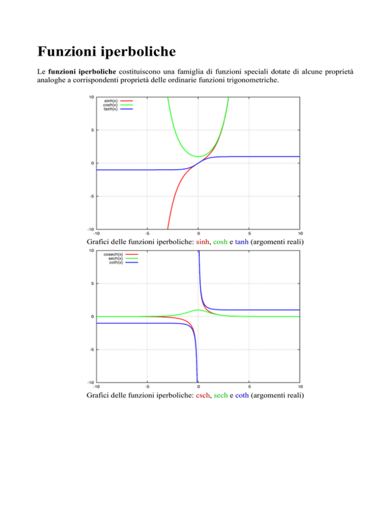 Funzioni iperboliche Le funzioni iperboliche costituiscono una famiglia di funzioni speciali dotate di alcune proprietà analoghe a corrispondenti proprietà delle ordinarie funzioni trigonometriche. Grafici delle funzioni iperboliche: sinh, cosh e tanh (argomenti reali) Grafici delle funzioni iperboliche: csch, sech e coth (argomenti reali) Definizioni Possiamo definire le funzioni iperboliche in questo modo: Data un'iperbole equilatera, con π = π, centrata con gli assi sugli assi coordinati e dato un angolo πΌ, consideriamo il settore iperbolico di area πΌ/2, questo determina un punto P come intersezione con l'iperbole; definiamo quindi seno iperbolico ππππ l'ordinata del punto P e coseno iperbolico ππππ l'ascissa del punto P; conseguentemente si possono definire le altre funzioni iperboliche tramite π ππβ e πππ β così come si fa per quelle trigonometriche. Possiamo anche dare le loro definizioni basate su funzioni esponenziali. ο· Funzione seno iperbolico ο· Funzione coseno iperbolico ο· Funzione tangente iperbolica ο· Funzione cotangente iperbolica ο· Funzione secante iperbolica ο· Funzione cosecante iperbolica In queste definizioni x si può considerare variabile reale o complessa. Relazione con le funzioni trigonometriche Per x reale la funzione πππ βπ₯ è una funzione pari, cioè simmetrica rispetto all'asse y; la funzione π ππβπ₯ è invece una funzione dispari, cioè simmetrica rispetto all'origine. Conseguentemente sono funzioni dispari anche π‘ππβπ₯, πππ‘βπ₯, ππ πβπ₯, mentre π ππβπ₯ è pari. Si trovano poi i seguenti valori particolari: Così come al variare della variabile reale t i punti (πππ π‘, π πππ‘) definiscono la circonferenza π₯ 2 + π¦ 2 = 1, analogamente i punti (πππ βπ‘, π ππβπ‘) definiscono l'iperbole equilatera π₯ 2 − π¦ 2 = 1 . Questa è una conseguenza dell'identità: (πππ βπ‘)2 − (π ππβπ‘)2 = 1 derivabile dalle definizioni mediante funzioni esponenziali con manipolazioni algebriche elementari. Al contrario delle corrispondenti funzioni trigonometriche, le funzioni iperboliche non sono periodiche. L'argomento t delle funzioni seno e coseno che definiscono la circonferenza può essere interpretato naturalmente come un angolo; la argomento delle funzioni iperboliche rappresenta invece due volte l'area del settore compreso tra il segmento che collega l'origine con il punto (πππ βπ‘, π ππβπ‘) su un ramo dell'iperbole equilatera, l'arco di tale iperbole che si conclude nel punto (π‘, 0) sull'asse x e il segmento sull'asse x da questo punto all'origine. Le funzioni iperboliche soddisfano molte identità, simili a corrispondenti identità trigonometriche. In effetti, la formula di Osborne specifica che si può convertire ogni identità trigonometrica in una identità iperbolica sviluppandola completamente in termini di potenze intere di seni e coseni, trasformando ogni sin in sinh e ogni cos in cosh e infine cambiando il segno di ogni termine che contiene un prodotto di due sinh. Procedendo in questo modo, ad esempio, si trovano i teoremi di addizione: e le formule dell'angolo dimezzato Funzioni iperboliche inverse Le inverse delle funzioni iperboliche sono: ο· ο· ο· ο· ο· ο·