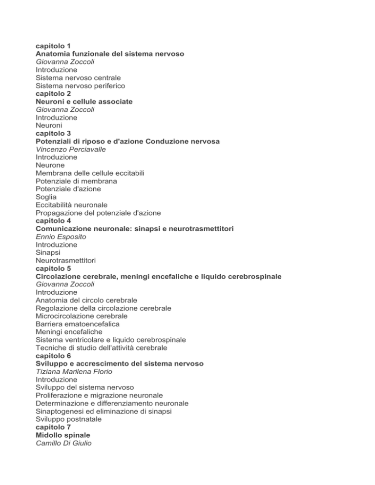 capitolo 1 Anatomia funzionale del sistema nervoso Giovanna Zoccoli Introduzione Sistema nervoso centrale Sistema nervoso periferico capitolo 2 Neuroni e cellule associate Giovanna Zoccoli Introduzione Neuroni capitolo 3 Potenziali di riposo e d'azione Conduzione nervosa Vincenzo Perciavalle Introduzione Neurone Membrana delle cellule eccitabili Potenziale di membrana Potenziale d'azione Soglia Eccitabilità neuronale Propagazione del potenziale d'azione capitolo 4 Comunicazione neuronale: sinapsi e neurotrasmettitori Ennio Esposito Introduzione Sinapsi Neurotrasmettitori capitolo 5 Circolazione cerebrale, meningi encefaliche e liquido cerebrospinale Giovanna Zoccoli Introduzione Anatomia del circolo cerebrale Regolazione della circolazione cerebrale Microcircolazione cerebrale Barriera ematoencefalica Meningi encefaliche Sistema ventricolare e liquido cerebrospinale Tecniche di studio dell'attività cerebrale capitolo 6 Sviluppo e accrescimento del sistema nervoso Tiziana Marilena Florio Introduzione Sviluppo del sistema nervoso Proliferazione e migrazione neuronale Determinazione e differenziamento neuronale Sinaptogenesi ed eliminazione di sinapsi Sviluppo postnatale capitolo 7 Midollo spinale Camillo Di Giulio Introduzione Organizzazione Funzioni Somatotopia Organizzazione della sostanza grigia capitolo 8 Riflessi e tono muscolare Camillo Di Giulio Introduzione Recettori articolari e muscolari capitolo 9 Sensibilità somatoestesica e recettori sensoriali Camillo Di Giulio Introduzione Organizzazione funzionale Discriminazione di due punti Vie del tatto Sostanza P Organizzazione crociata Homunculus sensoriale Corteccia cerebrale capitolo 10 Sensibilità termica e dolorifica Camillo Di Giulio Introduzione Principali vie afferenti somatiche generali Convergenza di input nocicettori Tipologia di dolore Dolore primario e dolore secondario Vie discendenti dolorifiche Componenti e decorso del sistema laterale capitolo 11 Tronco dell'encefalo e sistema reticolare Camillo Di Giulio Introduzione Funzioni dei nervi cranici Formazione reticolare capitolo 12 Controllo corticale del movimento Leonardo Fogassi Introduzione Corteccia motoria e sue connessioni discendenti Organizzazione funzionale della corteccia motoria sulla base dell'eccitabilità elettrica Organizzazione generale del sistema motoriocorticale Lesioni del sistema motorio Conclusioni capitolo 13 Cervelletto Vincenzo Perciavalle Introduzione Organizzazione strutturale Circuiti neuronali della corteccia cerebellare Effetti indotti da lesioni del cervelletto Funzioni capitolo 14 Sistema extrapiramidale Tiziana Marilena Florio Introduzione Nuclei della base capitolo 15 Sistema visivo Leonardo Fogassi Introduzione Occhio Struttura della retina e fotorecettori Dall'iperpolarizzazione dei fotorecettori all'attivazione delle cellule ganglionari Sistemi magnocellulare e parvocellulare Campo visivo e sue proiezioni sulla retina Vie visive Corteccia visiva primaria Dalla corteccia visiva primaria alle aree visive di ordine superiore: verso la percezione capitolo 16 Sistemi acustico e vestibolare Leonardo Fogassi Sistema acustico Introduzione Caratteristiche fisiche del suono Anatomia dell'orecchio Anatomia e fisiologia dei recettori cocleari Trasmissione dell'informazione nelle vie acustiche Corteccia uditiva Lesioni Sistema vestibolare Introduzione Anatomia dell'apparato vestibolare Recettori vestibolari Vie vestibolari Percezione vestibolare a livello della corteccia cerebrale capitolo 17 Sensibilità olfattiva e gustativa Tiziana Marilena Florio Introduzione Olfatto capitolo 18 Diencefalo: talamo-ipotalamo - Termoregolazione; regolazione di equilibrio idrico, apporto alimentare e ciclo mestruale Massimiliano Oliveri Introduzione Ipotalamo: anatomia e funzioni Ipotalamo e comportamenti motivati Fame Sete Temperatura Funzioni endocrine dell'ipotalamo e ciclo mestruale Conclusioni capitolo 19 Sistema nervoso autonomo Ennio Esposito Introduzione Differenze tra nervi somatici e nervi autonomici Aree cerebrali che controllano e modulano le funzioni autonomiche Divisioni Dettagli dell'innervazione Risposte degli organi effettori agli impulsi nervosi del sistema autonomo Funzioni generali capitolo 20 Sistema limbico: il cervello emozionale Ennio Esposito Introduzione Evoluzione del concetto di emozione Prime teorie neuroanatomiche Amigdala Plasticità nell'amigdala correlata con il condizionamento alla paura Ruolo dell'amigdala nella mediazione delle emozioni umane Ruolo dell'amigdala nella percezione cognitiva delle emozioni (feeling) Ruolo del sistema limbico nei meccanismi di ricompensa cerebrale (reward) Futuro dello studio delle basi neurobiologiche delle emozioni capitolo 21 Corteccia cerebrale - Specializzazione emisferica Massimiliano Oliveri Introduzione Organizzazione Specializzazione emisferica Conclusioni capitolo 22 Connessioni inter- intraemisferiche Basi neurofunzionali della plasticità cerebrale Massimiliano Oliveri Introduzione Vicarianza, riorganizzazione e sostituzione funzionali Neurogenesi Modificazioni a breve termine delle proprietà sinaptiche Modificazioni a lungo termine delle proprietà dei neuroni Plasticità e connettività interemisferica capitolo 23 Circuiti neurofunzionali del linguaggio Massimiliano Oliveri Introduzione Primi protagonisti Parliamo con l'emisfero sinistro? Solo emisfero sinistro? Afasia e modelli neurolinguistici E la semantica? Classificazione delle afasie Indice analitico