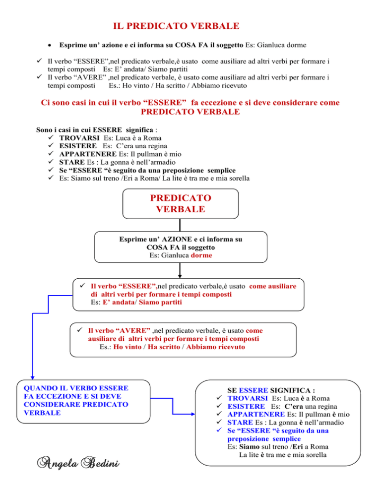 IL PREDICATO VERBALE Esprime un’ azione e ci informa su COSA FA il soggetto Es: Gianluca dorme Il verbo “ESSERE”,nel predicato verbale,è usato come ausiliare ad altri verbi per formare i tempi composti Es: E’ andata/ Siamo partiti Il verbo “AVERE” ,nel predicato verbale, è usato come ausiliare ad altri verbi per formare i tempi composti Es.: Ho vinto / Ha scritto / Abbiamo ricevuto Ci sono casi in cui il verbo “ESSERE” fa eccezione e si deve considerare come PREDICATO VERBALE Sono i casi in cui ESSERE significa : TROVARSI Es: Luca è a Roma ESISTERE Es: C’era una regina APPARTENERE Es: Il pullman è mio STARE Es : La gonna è nell’armadio Se “ESSERE “è seguito da una preposizione semplice Es: Siamo sul treno /Eri a Roma/ La lite è tra me e mia sorella PREDICATO VERBALE Esprime un’ AZIONE e ci informa su COSA FA il soggetto Es: Gianluca dorme Il verbo “ESSERE”,nel predicato verbale,è usato come ausiliare di altri verbi per formare i tempi composti Es: E’ andata/ Siamo partiti Il verbo “AVERE” ,nel predicato verbale, è usato come ausiliare di altri verbi per formare i tempi composti Es.: Ho vinto / Ha scritto / Abbiamo ricevuto QUANDO IL VERBO ESSERE FA ECCEZIONE E SI DEVE CONSIDERARE PREDICATO VERBALE SE ESSERE SIGNIFICA : TROVARSI Es: Luca è a Roma ESISTERE Es: C’era una regina APPARTENERE Es: Il pullman è mio STARE Es : La gonna è nell’armadio Se “ESSERE “è seguito da una preposizione semplice Es: Siamo sul treno /Eri a Roma La lite è tra me e mia sorella
