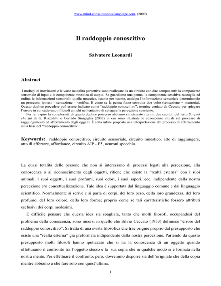 www.mind-consciousness-language.com, (2009) Il raddoppio conoscitivo Salvatore Leonardi Abstract I molteplici movimenti e le varie modalità percettive sono realizzate da un circuito con due componenti: la componente sensoriale di input e la componente mnestica di output. Se guardiamo una penna, la componente sensitiva raccoglie ed ordina le informazioni sensoriali; quella mnestica, istante per istante, anticipa l’informazione sensoriale determinando un processo: ipotesi – sensazione – verifica. È come se la penna fosse costruita due volte (sensazione + memoria). Questo duplice procedere può essere indicato come “raddoppio conoscitivo”, termine coniato da Ceccato per spiegare l’errore in cui cadevano i filosofi antichi nel tentativo di spiegare la percezione cosciente. Per far capire la complessità di questo duplice processo abbiamo sintetizzato i primi due capitoli del testo So quel che fai di G. Rizzolatti e Corrado Sinigaglia (2005) in cui sono illustrate le conoscenze attuali sul processo di raggiungimento ed afferramento degli oggetti. È stata infine proposta una interpretazione del processo di afferramento sulla base del “raddoppio conoscitivo”. Keywords: raddoppio conoscitivo, circuito sensoriale, circuito mnestico, atto di raggiungere, atto di afferrare, affordance, circuito AIP - F5, neuroni specchio. La quasi totalità delle persone che non si interessano di processi legati alla percezione, alla conoscenza o al riconoscimento degli oggetti, ritiene che esiste la “realtà esterna” con i suoi animali, i suoi oggetti, i suoi profumi, suoi odori, i suoi sapori, ecc. indipendente dalla nostra percezione e/o concettualizzazione. Tale idea è supportata dal linguaggio comune e dal linguaggio scientifico. Normalmente si scrive e si parla di corpi, del loro peso, della loro grandezza, del loro profumo, del loro colore, della loro forma; proprio come se tali caratteristiche fossero attributi esclusivi dei corpi medesimi. È difficile pensare che questa idea sia sbagliata, tanto che molti filosofi, occupandosi del problema della conoscenza, sono incorsi in quello che Silvio Ceccato (1953) definisce “errore del raddoppio conoscitivo”. Si tratta di una svista filosofica che trae origine proprio dal presupposto che esiste una “realtà esterna” già preformata indipendente dalla nostra percezione. Partendo da questo presupposto molti filosofi hanno ipotizzato che si ha la conoscenza di un oggetto quando effettuiamo il confronto tra l’oggetto stesso e la sua copia che in qualche modo si è formata nella nostra mente. Per effettuare il confronto, però, dovremmo disporre sia dell’originale che della copia mentre abbiamo a che fare solo con quest’ultima. 1 www.mind-consciousness-language.com, (2009) Vaccarino (1988) sottolinea che il riconoscimento di questo problema era gia balenato in Grecia con Gorgia, Arcesilao, gli Scettici, ecc. e sta alla base della critica kantiana. Secondo Ceccato e gli studiosi della S. O. I., si può superare il problema del raddoppio conoscitivo soltanto sostituendo tutto ciò che è presupposto come “dato” o “preformato”, con l’operare mentale attraverso l’attenzione e poche altre operazioni elementari di base (si veda Benedetti 2005, 2006, 2008 e Marchetti 2006). Invece di partire da oggetti, concetti o idee gia precostituite indipendentemente dal nostro operare mentale, bisogna ricercare le modalità attraverso cui l’operare mentale costruisce tali oggetti, concetti, idee. La realtà esterna assieme ai numeri, ai verbi, ai nomi, al duro/molle, al pesante/leggero, alla passione, al dolore all’amore, eccetera, diventano, in tal modo, il risultato di un preciso operare attenzionale. Il “raddoppio conoscitivo”, ossia la compresenza di due “enti”, di cui uno è la copia dell’altro, nell’atto della percezione cosciente è un errore se si prende il primo dei due “enti”come “preformato”. Se però, ambedue sono costrutti mentali, non è da escludere che la mente agisca nell’atto della percezione cosciente attraverso un meccanismo che li vede interagire. Nel mio saggio I processi cognitivi (Leonardi, 2008), ipotizzo l’agire mentale, in numerosi processi, tra cui la percezione cosciente, come un processo circuitale che vede coinvolti due “costrutti”: il primo costrutto nasce dalla elaborazione delle informazioni provenienti dai recettori sensoriali; il secondo, si origina da una costruzione mnestica. Il costrutto sensoriale è generato da un circuito coinvolgente più aree corticali e subcorticali; il costrutto mnestico è generato da associazioni di popolazioni di neuroni. Tutti e due formano un circuito complesso in cui interagiscono e che determina la percezione cosciente. Il primo circuito genera le sensazioni di “freddo/caldo”, rosso, bianco, forma, ecc.; il secondo sulla base di queste informazioni che giungono elaborate alla coscienza, recupera le informazioni memorizzate. La caratteristica peculiare di questo circuito complesso è che esso agisce come un laboratorio in miniatura. Il recupero, che avviene inconsciamente, infatti, non riguarda il costrutto elaborato a livello sensoriale, bensì quello che si ipotizza seguirà immediatamente dopo. Il secondo costrutto, ossia quello mnestico, infatti, agisce con un meccanismo di anticipazione/ipotesi e la sensazione che segue funge da verifica dell’ipotesi anticipata. In questo modo la mente impara istante per istante, attraverso un processo di ipotesi/verifica, a recuperare e ricostruire autonomamente, ossia precedentemente percepito. 2 senza informazioni sensoriali, quanto www.mind-consciousness-language.com, (2009) Il costrutto mnestico, oltre ad interagire col circuito sensoriale generando il processo di ipotesi/verifica, attiva l’atto motorio (o la stasi) che accompagna sempre la percezione. Possiamo chiarire con un esempio. Supponiamo di guardare una macchina in movimento. Il circuito percettivo è, in questa circostanza, il c