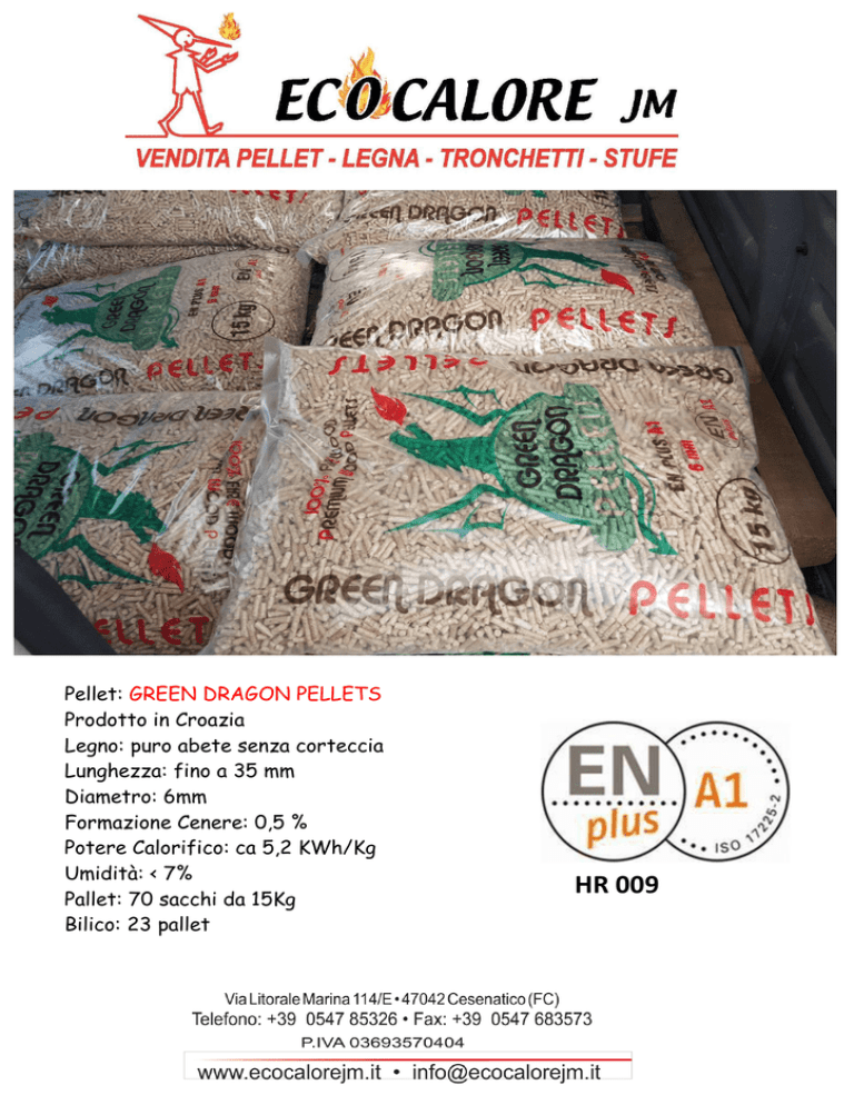 Pellet: GREEN DRAGON PELLETS Prodotto in Croazia Legno: puro abete senza corteccia Lunghezza: fino a 35 mm Diametro: 6mm Formazione Cenere: 0,5 % Potere Calorifico: ca 5,2 KWh/Kg Umidità: < 7% Pallet: 70 sacchi da 15Kg Bilico: 23 pallet HR 009