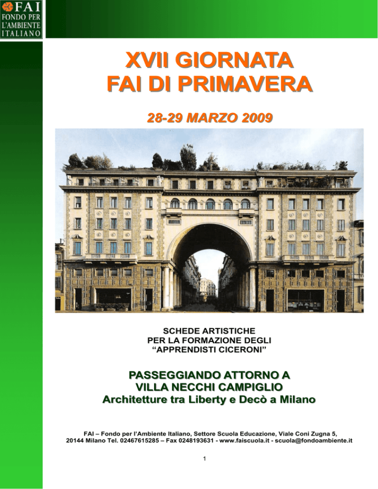 XVII GIORNATA FAI DI PRIMAVERA 28-29 MARZO 2009 SCHEDE ARTISTICHE PER LA FORMAZIONE DEGLI “APPRENDISTI CICERONI” PASSEGGIANDO ATTORNO A VILLA NECCHI CAMPIGLIO Architetture tra Liberty e Decò a Milano FAI – Fondo per l’Ambiente Italiano, Settore Scuola Educazione, Viale Coni Zugna 5, 20144 Milano Tel. 02467615285 – Fax 0248193631 - www.faiscuola.it - [email protected] 1 SIMBOLOGIA UTILIZZATA Gentili insegnanti, gentili studenti, Questa scheda è il testo fondamentale per la preparazione degli Allievi Ciceroni, scritto appositamente per la Giornata di Primavera 2009. Essa ripercorre la storia del quartiere intorno a Villa Necchi Campiglio, ed è strutturata in modo da essere più funzionale possibile in vista dell’esposizione al pubblico. All’interno del testo sono presenti numerosi collegamenti e spunti di discussione, che potranno essere approfonditi in classe. Illustriamo le icone utilizzate all’interno della scheda: Profili storici Citazioni da documenti storico-letterari Definizioni Biografie degli artisti 2 Approfondimento dell’insegnante Approfondimento PREMESSA: IL QUARTIERE DI PORTA ORIENTALE TRA SETTECENTO E OTTOCENTO Il tratto più esterno dell’attuale Corso di Porta Venezia corrisponde all’antico Borgo di Porta Orientale, lo spazio di terre collocate tra le mura medievali (all’altezza di Via Senato) e le mura spagnole (all’altezza di Piazza Oberdan). Fuori dalla cerchia di mura si trovava il Lazzaretto, all’interno la contrada, fino al XVIII secolo, era poco edificata, e destinata a rustici e ortaglie appartenenti ai vicini conventi di San Dionigi, delle Carcanine e dei Cappuccini. Ecco come Alessandro Manzoni descrive il borgo nel capitolo XI de “I Promessi Sposi”, ambientati nella Milano del Seicento: - Saprebbe insegnarmi la strada più corta, per andare al convento de' cappuccini dove sta il padre Bonaventura? [...] - Siete fortunato, bravo giovine; il convento che cercate è poco lontano di qui. Prendete per questa viottola a mancina: è una scorciatoia: in pochi minuti arriverete a una cantonata d'una fabbrica lunga e bassa: è il lazzeretto; costeggiate il fossato che lo circonda, e riuscirete a porta orientale. Entrate, e, dopo tre o quattrocento passi, vedrete una piazzetta con de' begli olmi: là è il convento: non potete sbagliare. Dio v'assista, bravo giovine -. E, accompagnando l'ultime parole con un gesto grazioso della mano, se n'andò. Renzo rimase stupefatto e edificato della buona maniera de' cittadini verso la gente di campagna; e non sapeva ch'era un giorno fuor dell'ordinario, un giorno in cui le cappe s'inchinavano ai farsetti. Fece la strada che gli era stata insegnata, e si trovò a porta orientale. Non bisogna però che, a questo nome, il lettore si lasci correre alla fantasia l'immagini che ora vi sono associate. Quando Renzo entrò per quella porta, la strada al di fuori non andava diritta che per tutta la lunghezza del lazzeretto; poi scorreva serpeggiante e stretta, tra due siepi. La porta consisteva in due pilastri, con sopra una tettoia, per riparare i battenti, e da una parte, una casuccia per i gabellini. I bastioni scendevano in pendìo irregolare, e il Già nel I secolo avanti Cristo fu edificata la prima cinta muraria, completata da Ottaviano Augusto, di forma quadrangolare e in seguito a pliata nel III secolo d.C. da l’Imperatore Massimiano. A questa prima costruzione seguì quella medievale, prima in legno, intorno al 1156, distrutta dal Barbarossa, e ricostruita in muratura nel 1171. Resti della cinta muraria medievale sono osservabili in Via San Damiano, all’altezza di Via Mozart. L’edificazione della cerchia dei Bastioni (mura spagnole), la cinta muraria esterna che proteggeva la città, iniziò intorno al 1550, per ordine del governatore Ferrante Gonzaga. Completata dopo dieci anni, la cinta era di forma circolare, con una marcata rientranza in corrispondenza del Castello Sforzesco, e si estendeva su un perimetro di oltre 11 Km, che la rendeva una delle più lunghe d’Europa. 1. Marc’Antonio Dal Re, Il Lazzaretto 3 terreno era una superficie aspra e inuguale di rottami e di cocci buttati là a caso. La strada che s'apriva dinanzi a chi entrava per quella porta, non si paragonerebbe male a quella che ora si presenta a chi entri da porta Tosa. Un fossatello le scorreva nel mezzo, fino a poca distanza dalla porta, e la divideva così in due stradette tortuose, ricoperte di polvere o di fango, secondo la stagione. Al punto dov'era, e dov'è tuttora quella viuzza chiamata di Borghetto, il fossatello si perdeva in una fogna. Lì c'era una colonna, con sopra una croce, detta di san Dionigi: a destra e a sinistra, erano orti cinti di siepe e, ad intervalli, casucce, abitate per lo più da lavandai. Dopo la soppressione degli ordini monastici promossa dall’amministrazione austriaca, numerosi interventi urbanistici, affidati a Giuseppe Piermarini e condotti tra il 1770 e il 1790, cambiarono la fisionomia del quartiere: il corso divenne la radiale per Vienna e le Venezie, fu coperto il fossato dell’Acqualonga, e la strada pavimentata e allargata per consentire il passaggio delle carrozze. L’area dell’abbazia di San Dionigi e del convento delle Carcanine venne trasformata nei primi giardini pubblici di Milano, destinati alla ricreazione collettiva, dove si posizionarono giostre e spazi per il divertimento. Il quartiere divenne così residenza dei ceti nobiliari e delle classi agiate milanesi soppiantando il corso di Porta Romana come luogo di passeggio della buona società. Ancor di più alla moda divenne in epoca napoleonica, quando diviene sede di feste e sfilate, e la cerchia dei bastioni venne utilizzata come larga e ombrosa via di passeggio. La riqualificazione della zona si completa con la costruzione, nel 1826, dell’ingresso trionfale in Porta Orientale, con i due caselli daziari in stile neoclassico di Rodolfo Vantini. Porta Tosa era un altro accesso alla città che si apriva nei bastioni