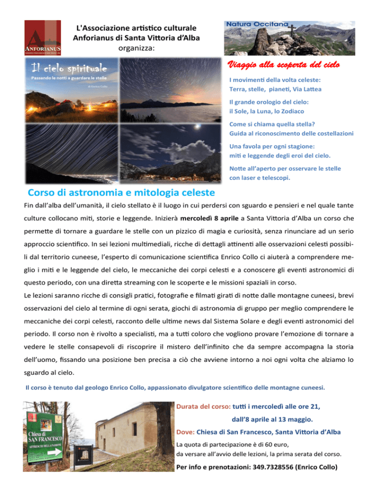 L'Associazione artistico culturale Anforianus di Santa Vittoria d’Alba organizza: Viaggio alla scoperta del cielo I movimenti della volta celeste: Terra, stelle, pianeti, Via Lattea Il grande orologio del cielo: il Sole, la Luna, lo Zodiaco Come si chiama quella stella? Guida al riconoscimento delle costellazioni Una favola per ogni stagione: miti e leggende degli eroi del cielo. Notte all’aperto per osservare le stelle con laser e telescopi. Corso di astronomia e mitologia celeste Fin dall’alba dell’umanità, il cielo stellato è il luogo in cui perdersi con sguardo e pensieri e nel quale tante culture collocano miti, storie e leggende. Inizierà mercoledì 8 aprile a Santa Vittoria d’Alba un corso che permette di tornare a guardare le stelle con un pizzico di magia e curiosità, senza rinunciare ad un serio approccio scientifico. In sei lezioni multimediali, ricche di dettagli attinenti alle osservazioni celesti possibili dal territorio cuneese, l’esperto di comunicazione scientifica Enrico Collo ci aiuterà a comprendere meglio i miti e le leggende del cielo, le meccaniche dei corpi celesti e a conoscere gli eventi astronomici di questo periodo, con una diretta streaming con le scoperte e le missioni spaziali in corso. Le lezioni saranno ricche di consigli pratici, fotografie e filmati girati di notte dalle montagne cuneesi, brevi osservazioni del cielo al termine di ogni serata, giochi di astronomia di gruppo per meglio comprendere le meccaniche dei corpi celesti, racconto delle ultime news dal Sistema Solare e degli eventi astronomici del periodo. Il corso non è rivolto a specialisti, ma a tutti coloro che vogliono provare l’emozione di tornare a vedere le stelle consapevoli di riscoprire il mistero dell’infinito che da sempre accompagna la storia dell’uomo, fissando una posizione ben precisa a ciò che avviene intorno a noi ogni volta che alziamo lo sguardo al cielo. Il corso è tenuto dal geologo Enrico Collo, appassionato divulgatore scientifico delle montagne cuneesi. Durata del corso: tutti i mercoledì alle ore 21, dall’8 aprile al 13 maggio. Dove: Chiesa di San Francesco, Santa Vittoria d’Alba La quota di partecipazione è di 60 euro, da versare all’avvio delle lezioni, la prima serata del corso. Per info e prenotazioni: 349.7328556 (Enrico Collo)
