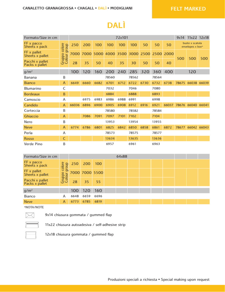 FELT MARKED CANALETTO GRANAGROSSA • CHAGALL • DALÌ • MODIGLIANI DALÌ FF x pallet Sheets x pallet Pacchi x pallet Packs x pallet 72x101 Gruppo colore Colour group Formato/Size in cm FF x pacco Sheets x pack 250 200 100 100 100 9x14 11x22 12x18 100 50 50 50 7000 7000 5000 4000 3500 3000 2500 2500 2000 500 28 35 50 40 35 30 50 50 Banana B Bianco A Blumarino C 78560 6649 6660 6682 78562 6701 6712 6722 7046 6730 6732 7080 6893 Bordeaux B 6884 6888 Camoscio A 6975 6983 6986 6988 6991 Candido A 66036 6896 6900 6905 6908 6912 Corteccia B Ghiaccio A Nero B Neve A Perla A 78573 78575 78577 Rosso C 13634 13635 13636 Verde Pino B 6957 6961 6963 7086 7091 7097 6774 6786 6801 6825 FF x pallet Sheets x pallet Pacchi x pallet Packs x pallet 6921 78675 66038 66039 66037 78676 66040 66041 78584 7102 7104 13954 13955 6842 6850 6738 6858 6861 6872 78677 66042 66043 64x88 Gruppo colore Colour group Formato/Size in cm FF x pacco Sheets x pack 7101 120 6998 6916 78582 13953 500 78564 7032 78580 500 40 100 120 160 200 240 285 320 360 400 g/m2 buste x scatola envelopes x box* 250 200 100 7000 7000 5500 28 35 55 100 120 160 g/m2 Bianco A 6648 6659 6696 Neve A 6773 6785 6819 *NOTA/NOTE 9x14 chiusura gommata / gummed flap 11x22 chiusura autoadesiva / self-adhesive strip 12x18 chiusura gommata / gummed flap Produzioni speciali a richiesta • Special making upon request