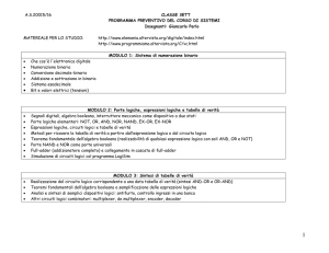 MONOSTABILI E CIRCUITI TRIGGER La larghezza dell'impulso d'uscita è determinata da una rete realizzata con resistenza e capacità durata W legata soltanto alle caratteristiche della costante di tempo =RC qualunque sia la durata del segnale di ingresso, l'uscita ha sempre e solo la durata W circuiti detti resettabili: hanno, cioè, la possibilità di interrompere la durata dell'impulso di uscita inviando un impulso di reset. Retriggerabili tw( uscita) CR ln 2 0,7RC CIRCUITI TRIGGER L'intervallo di tensione fra VH e VL è appunto l'isteresi del circuito. CIRCUITI SEQUENZIALI Gli elementi fondamentali di un circuito sequenziale sono i flip-flop tutti i flip-flop commutano con lo stesso comando di clock La struttura di una tale macchina è riportata in figura 1 sia le uscite che gli stati futuri sono una funzione degli ingressi e degli stati presenti lo stato successivo della macchina è determinato dal blocco logico "stato successivo F" come una funzione dello stato presente e dell'ingresso. Il blocco logico di uscita "G" determina l'uscita come una funzione dello stato presente e dell'ingresso i circuiti "G" ed "F" sono dei circuiti strettamente combinatori Stato successivo = F ( stato presente, ingresso) Uscita = G (stato presente, ingresso) Un circuito sequenziale in cui l'uscita dipende da stato ed ingresso, come in figura 1, viene identificata come "macchina di Mealy"; fig 1 Uscita = G(stato presente) Quest'ultimo tipo di macchina viene identificata come "macchina di Moore" e la sua struttura generale è riportata in figura 2. Fig. 2 L'analisi di un circuito sequenziale consiste nell'ottenere una tavola o diagramma della sequenza temporale degli ingressi, uscite,e stati interni esempio di circuito sequenziale circuito con una variabile di ingresso, una variabile di uscita due flip-flop di tipo RS, Fig. 3 flip-flops triggerati sui fronti negativi del segnale di clock stato presente durante l'intervallo fra una transizione e la successiva del segnale di clock che lo porta allo stato futuro. Costruiamo per questo circuito sequenziale di figura 3 una "tabella di stato" che evidenzi la sequenza temporale del segnale (o segnali) di ingresso, di uscita e dello stato dei flip-flops. Questa tabella sarà divisa in tre sezioni etichettate come "stato presente" , "stato successivo" ed "uscita" Stato presente Stato successivo x=0 USCITA x=1 x=0 x=1 A B A B A B y y 0 0 0 0 0 1 0 0 0 1 1 1 0 1 0 0 1 0 1 0 0 0 0 1 1 1 1 0 1 1 0 0 Lo stato presente evidenzia gli stati dei flip-flops prima dell'arrivo del segnale di clock. lo stato successivo evidenzia gli stati dei flipflops dopo l'applicazione del segnale di clock, la colonna relativa all'uscita mostra i valori della variabile uscita durante lo stato presente. Sia lo stato successivo che l'uscita hanno due colonne, una per x=0 ed una per x=1. Per costruire la tabella di stato occorre partire da uno stato iniziale. (Nella maggior parte dei circuiti sequenziali è preso quello con tutti i flip-flops nello stato "0"). Comunque l'analisi può partire da uno stato arbitrario Quindi la prima situazione sarà A = 0 e B = 0. La situazione dell'uscita invece è molto più facile da derivare In generale, un circuito sequenziale con "m" flip-flops ed "n" variabili di ingresso avrà 2 elevato ad m righe, una per ciascuno stato. Lo stato successivo e la sezione uscita avranno 2 elevato ad n colonne, una per ciascuna combinazione di ingresso. Le informazioni contenute nella tabella di stato si possono rappresentare graficamente in un "diagramma di stato". in questo diagramma, uno stato viene rappresentato da un cerchio, e la transizione fra gli stati da una linea che collega direttamente i vari cerchi. Il diagramma di stato dell'esempio che stiamo analizzando è riportato in figura 4 Fig. 4 Il numero binario contenuto all'interno di ogni cerchio identifica lo stato che quel cerchio rappresenta. Le linee che collegano direttamente i vari cerchi sono etichettate con due numeri binari separati da uno /. L'elemento che viene scritto per primo rappresenta il valore di ingresso che determina il cambiamento di stato; il numero scritto dopo il segno / fornisce il valore dell'uscita che si ha durante lo stato presente. ING/USC(stato presente) La linea che un cerchio ha con se stesso non determina un cambiamento di stato. Il diagramma di stato fornisce le stesse informazioni della tabella di stato Il diagramma di stato viene spesso usato come specifica di progetto di un circuito sequenziale. Riferendoci alla figura 1 e 2, vediamo che le procedure di analisi svolte fino a questo punto si possono riassumere in tre step base: 1) Determinare lo stato successivo e l'uscita, funzioni F e G 2) Usare F e G per costruire la tabella stato/uscita che specifica completamente lo stato successivo e l'uscita del circuito per ogni possibile combinazione dello stato corrente e ingresso 3) (optional) Disegnare un diagramma di stato che presenta le informazioni del precedente step in forma grafica. Consideriamo ora un ulteriore passo per completare l'analisi di un circuito sequenziale. L'equazione di stato è una espressione algebrica che specifica le condizioni per il passaggio di stato di un flip-flop. Il membro alla sinistra dell'equazione indica lo stato successivo del flip-flop ed il membro alla destra è una espressione Booleana che specifica le condizioni sullo stato presente che porteranno lo stato successivo ad essere uguale ad "1". Una equazione di stato è nella forma simile alla equazione caratteristica di un flip-flop eccetto per il fatto che questa specifica la condizione dello stato successivo in termini di variabili di ingresso esterne ed altri valori relativi ai vari flip-flop. L'equazione di stato si ottiene direttamente dalla tabella di stato. Considerando sempre il nostro esempio, l'equazione di stato relativa al flip-flop (A) si ottiene osservando la tabella di stato. Dalla colonna degli stati successivi si vede che il flip-flop (A) va nello stato "1" quattro volte: x=0 