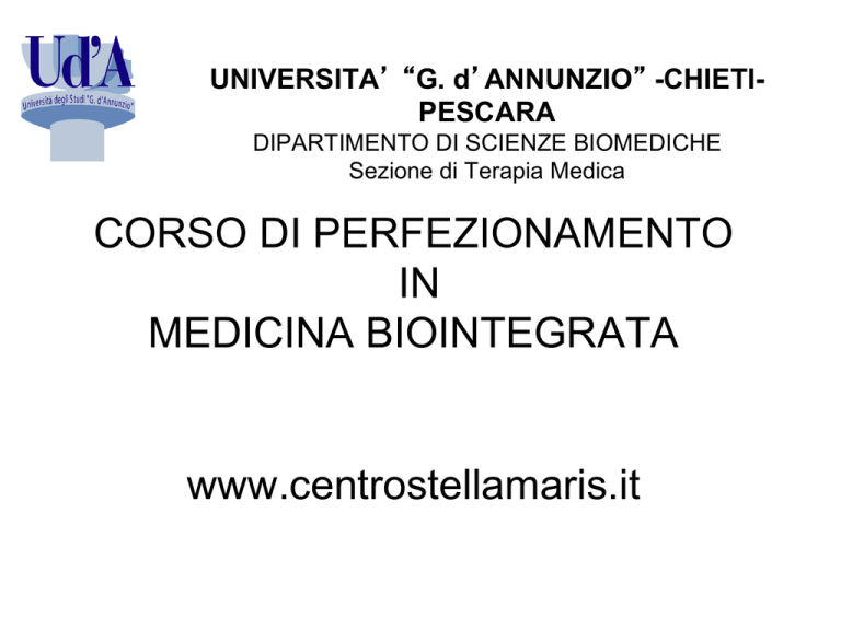 UNIVERSITA G. d ANNUNZIO -CHIETIPESCARA DIPARTIMENTO DI SCIENZE BIOMEDICHE Sezione di Terapia Medica CORSO DI PERFEZIONAMENTO IN MEDICINA BIOINTEGRATA www.centrostellamaris.it Programma AA.2010-2011 • Definizione di PNEIG. Cenni introduttivi al Sistema nervoso: le cellule del SN e loro connessioni; il tronco encefalo, diencefalo, SNV. Cenni introduttivi al Sistema endocrino: gli ormoni, loro funzioni e comunicazioni. Controllo cerebrale sul Sistema endocrino. Assi neuroendocrini: ipotalamo-ipofisi, ipotalamo-ipofisi-surreni, ipotalamo-ipofisi-tiroide, ipotalamoipofisi-gonadi. Cenni introduttivi al Sistema immunitario: cenni di immunologia (teoria della selezione clonale, immunità naturale ed acquisita, sistema HLA, sistema immunitario come organo di senso, produzione di ormoni da parte del sistema immunitario che fungono da mediatori tra cervello e sistema endocrino). Cenni introduttivi alla genetica:.elementi di biochimica e di biofisica e per la comprensione delle dinamiche molecolari del DNA, genetica, genomica, tecniche per l analisi delle varianti genetiche. Cervello e psiche. La grande connessione: Sistema nervoso ed immunità; sistema dello stress; sistema endocrino e cervello. Endocrinosenescenza e P.N.E.I.G. DCA come prototipo clinico di P.N.E.I.G.. Condizionamento Epigenetico Il sistema nervoso Gli studi condotti dagli anni settanta ad oggi, hanno portato alla individuazione di particolari proteine, i neuropeptidi. La loro scoperta giustifica l integrazione dei SN, SE e SI, nello scopo comune di adattare sempre meglio l organismo all ambiente. La loro produzione contemporanea sia a livello centrale (SN), con funzioni di neuromodulazione, che a livello periferico (SI e SE o digerente), pone il problema del loro significato funzionale. I neuropeptidi e i rispettivi recettori, hanno messo in discussione i principi basilari della neurotrasmissione classica. La trasmissione nervosa avviene tramite la trasformazione dell impulso da elettrico in chimico a livello delle sinapsi, ma si supponeva che le sostanze chimiche coinvolte fossero di un solo tipo, i neurotrasmettitori, molecole semplici, eccitatrici o inibitrici, a struttura non polipeptidica e a rapida inattivazione, attualmente identificate in noradrenalina, adrenalina, serotonina, acetilcolina, Gaba (acido gamma amino butirrico), dopamina. Ma la cellula nervosa libera anche neuropeptidi ("cotrasmissione"), molecole più grosse e più complesse, con una vita più lunga, così che ogni impulso, durante il suo tragitto, viene modulato, ossia arricchito di sfumature al variare dei neurotrasmettitori, dei neuropeptidi e del tipo dei recettori coinvolti. Ma la distinzione tra neurotrasmettitori e neuropeptidi a volte è impossibile: ad es. la vasopressina, è al tempo stesso un neuropeptide, un ormone, e un neurotrasmettitore a seconda della sede e della funzione presa di volta in volta in considerazione. Non si parla più di accesospento ON-OFF ma di "neuromodulazione". • Per lo psicofisiologo francese Lambert, i neuromodulatori neuropeptidici hanno durata relativamente lunga, sono così numerosi e con funzioni tanto integrate che si parla di sistemi neuropeptidici. Essi agiscono su aree sinaptiche assai vaste armonizzando e modulando insieme le centinaia di migliaia di impulsi elementari che transitano nelle vie nervose, così da influenzare funzioni sempre più complesse, e in ultima analisi il comportamento stesso. • Possiamo dunque dividere le molecole che garantiscono la comunicazione all interno del sistema nervoso in tre grosse categorie: • Neurotrasmettitori di 1° tipo (aminoacidi) Neurotrasmettitori di 2° tipo (sintetizzati nel neurone a partire da un aminoacido o da una molecola semplice come la colina); • Neuromodulatori (Neuropeptidi, Lipidi, Nucleosidi, Gas solubili*); • Ormoni (Angiotensina, Ossitocina, Vasopressina,etc). • Con il compito di attivare comportamenti più o meno complessi, che riguardano funzioni vitali come la fame, la sete, la libido, la percezione del dolore, il sonno, il freddo, il caldo, etc. • *nell intolleranza primaria al lattosio (PLI) si libera idrogeno. EMBRIOGENESI • Il SNC prende origine da un foglietto di tessuto, ectodermico, il disco neurale, sulla superficie superiore dell'embrione • I settori laterali del disco neurale si ispessiscono come due onde che sono denominate creste o pieghe neurali, che confluiscono nell'asse mediale, dove formano il tubo neurale • (Fig. B). La porzione cefalica del tubo neurale si sviluppa nell'encefalo, e la porzione caudale nel midollo spinale. • Le cellule della cresta neurale si separano dalle creste stesse e danno origine al sistema nervoso periferico. La porzione del tubo neurale che diventerà l'encefalo forma una serie di tasche. La serie di tasche dà origine alle varie parti dell'encefalo adulto, e le loro cavità si trasformano in ventricoli contenenti il liquido cerebrospinale. I ventricoli sono in comunicazione con il canale centrale del midollo spinale, anch'esso derivante dalla cavità centrale del tubo. Il tubo neurale subisce inoltre delle pressioni, che fanno sì che l'encefalo sia orientato a circa 90° rispetto al midollo spinale. Nell'embrione in fase iniziale si possono distinguere tre regioni principali dell'encefalo: il proencefalo, il mesencefalo e il romboencefalo. • Nell'arco di breve tempo il proencefalo si trasforma nel telencefalo, che diverrà il cervello propriamente detto e il diencefalo. Il mesencefalo rimane una struttura a sé, mentre il romboencefalo si divide in metencefalo, che a sua volta si dividerà in ponte e cervelletto, e in mielencefalo che diverrà il midollo allungato. • Il sistema nervoso, sede delle capacità più avanzate dell intelletto, regola sia le funzioni della vita di relazione (quelle cioè che mettono in rapporto il nostro organismo con il mondo che lo circonda), sia quelle della vita vegetativa (che riguarda il funzionamento "silenzioso" di organi e apparati). • Dist