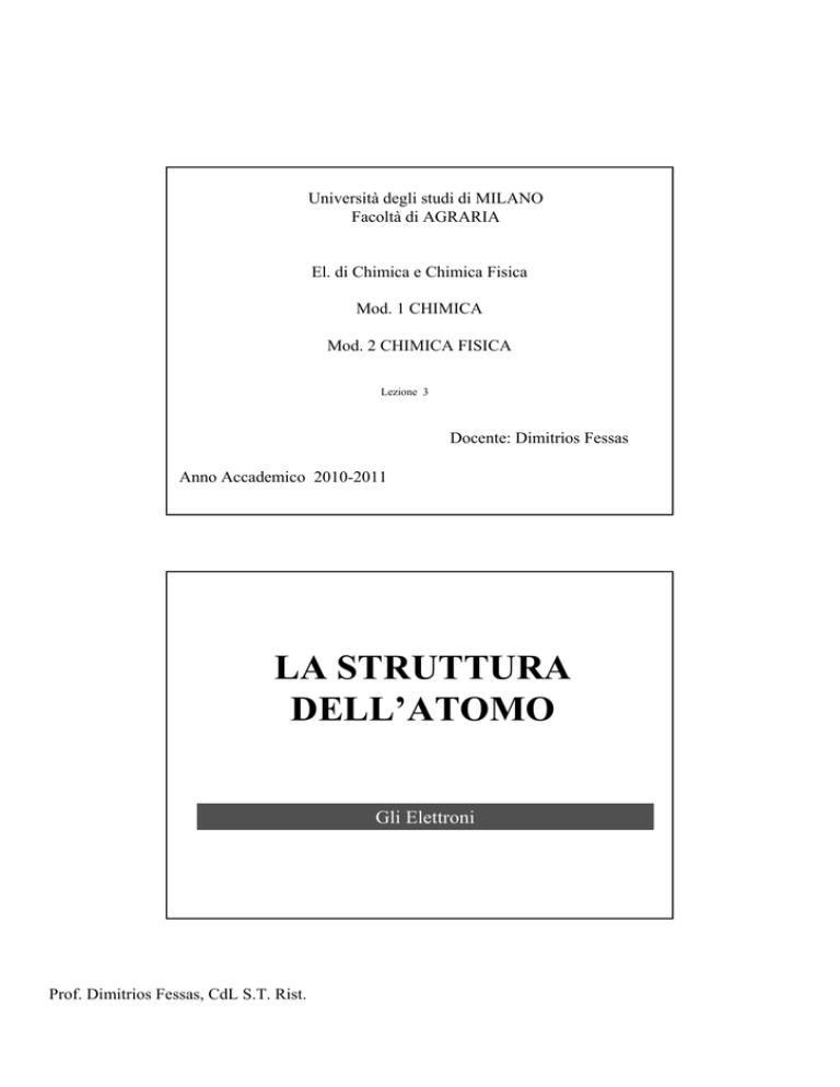 Università degli studi di MILANO Facoltà di AGRARIA El. di Chimica e Chimica Fisica Mod. 1 CHIMICA Mod. 2 CHIMICA FISICA Lezione 3 Docente: Dimitrios Fessas Anno Accademico 2010-2011 LA STRUTTURA DELL’ATOMO Gli Elettroni Prof. Dimitrios Fessas, CdL S.T. Rist. L’ATOMO DEVE ESSERE ELETTRICAMENTE NEUTRO Numero protoni = numero elettroni La distribuzione nello spazio della nuvola elettronica di un atomo, denominata struttura elettronica, dipende dal numero complessivo di elettroni, cioè dal numero atomico dell’elemento. Nel suo continuo spostamento ad elevata velocità, ogni elettrone impegna una regione dello spazio definibile, sia per estensione che per geometria, con una funzione delle coordinate cartesiane dell’elettrone e del tempo, denominata orbitale atomico. la funzione matematica “orbitale” permette di definire l’energia dell’elettrone e la regione dello spazio nella quale è probabile trovare l’elettrone. Prof. Dimitrios Fessas, CdL S.T. Rist. Meccanica Quantistica atomo idrogenoide, costituito da un nucleo di un solo protone e quindi da un solo elettrone: È un atomo fittizio per il quale è relativamente facile definire le funzioni “orbitali atomici” Gli orbitali atomici di un atomo idrogenoide sono distinguibili con 4 numeri quantici, denominati rispettivamente Ciascun orbitale ha caratteristiche particolari ORIENTAMENTO ENERGIA GEOMETRIA Numero Quantico n Prof. Dimitrios Fessas, CdL S.T. Rist. Numero quantico l Numero Quantico m • Esiste anche il numero quantico di SPIN • può assumere solo i valori + 1/2 o – 1/2 Numero quantico n • Assume valori interi positivi ( 1,2,3,4,5,6 ) •Stabilisce il livello energetico degli orbitali e quindi degli elettroni che li occupano • (aumenta all’aumentare della “distanza” dal nucleo) • Ciascun livello energetico può contenere un numero massimo di elettroni uguale a 2n2 Prof. Dimitrios Fessas, CdL S.T. Rist. Numero quantico l • Assume valori interi positivi che vanno da 0 a n-1 l=2 l=1 l=0 Orbitale d Orbitale p Orbitale s Numero quantico m •Il valore varia da - l a + l compreso lo zero l=0 per n ≥ 1 orbitale s l=1 orbitali p m = -1 m=0 Prof. Dimitrios Fessas, CdL S.T. Rist. per n ≥ 2 m = +1 (per n ≥ 3) l=2 orbitali d m = -2 m = -1 m=0 m = +1 m = +2 Meccanica Quantistica principale, n, ≥ 1; individua i livelli di energia possibili. orbitale, l; 0 ≤ l ≤ (n-1); geometria della regione dello spazio in cui è più probabile trovare l’elettrone. magnetico, m; - l ≤ m ≤ + l; indica piccole variazioni di energia dell’elettrone in presenza di un campo magnetico. di spin, s; può assumere due valori: s = +1/2, s= -1/2 Prof. Dimitrios Fessas, CdL S.T. Rist. Si può immaginare di “costruire la struttura elettronica” di un atomo andando a collocare un elettrone dopo l’altro nell’orbitale libero ad energia più bassa. In questa operazione si devono tenere presenti due principi della meccanica quantistica. Principio di Pauli: due elettroni di un dato atomo devono differire almeno per il numero quantico di spin. Ciò significa che un dato orbitale, definito da n, l e m, può “ospitare” due elettroni, uno con s = + ½ , l’altro con s = - ½. Regola di Hund: nel costruire la struttura elettronica, gli orbitali, corrispondenti ad un dato valore di l, devono essere “occupati” ciascuno con un elettrone con spin = +1/2, e solo successivamente “completati” col secondo elettrone avente spin di segno opposto. A questo punto, noto il numero di elettroni di un determinato atomo, con che ordine procedo nel riempimento dell’orbitale ? Ogni orbitale può contenere al massimo due elettroni Cerco di riempire sempre il maggior numero di orbitali con la stessa energia Vanno riempiti per primi gli orbitali con minore energia cioè quelli più vicini al nucleo Prof. Dimitrios Fessas, CdL S.T. Rist. Elemento H He Li Be B C N O F Ne Na Mg Al Si P S Cl Ar Z 1 2 3 4 5 6 7 8 9 10 11 12 13 14 15 16 17 18 Struttura Elettronica 1s1 1s2 1s2 1s2 1s2 1s2 1s2 1s2 1s2 1s2 1s2 1s2 1s2 1s2 1s2 1s2 1s2 1s2 2s1 2s2 2s2 2px1 2s2 2px12py1 2s2 2px12py12pz1 2s2 2px22py12pz1 2s2 2px22py22pz1 2s2 2px22py22pz2 2s2 2px22py22pz2 2s2 2px22py22pz2 2s2 2px22py22pz2 2s2 2px22py22pz2 2s2 2px22py22pz2 2s2 2px22py22pz2 2s2 2px22py22pz2 2s2 2px22py22pz2 3s1 3s2 3s23px1 3s23px13py1 3s23px13py13pz1 3s23px23py13pz1 3s23px23py23pz1 3s23px23py23pz2 Le Dimensioni degli Atomi • Un atomo ha un diametro di circa 10-10 m. • Il nucleo ha un diametro di circa 10-15 m. • Se il nucleo fosse delle dimensioni di una mosca e stesse al centro del cerchio di centrocampo, gli elettroni starebbero in Curva • Se gli elettroni si muovessero sulla superficie del nucleo, gli oggetti si contrarrebbero di 105 volte conservando la stessa massa. • L’Everest diventerebbe una montagna alta 8 cm. Prof. Dimitrios Fessas, CdL S.T. Rist. La massa atomica, M.A., di un elemento = “media pesata” delle masse dei suoi isotopi: M.A. = ∑i (fi Mi), dove fi è l’abbondanza dell’isotopo i-esimo di massa Mi. L'unità di massa atomica unificata (u) detta anche dalton (Da) corrisponde alla dodicesima parte della massa del 12C, il cui nucleo contiene 6 protoni e 6 neutroni. 1 u nel S.I, corrisponderebbe a 1,660565x10-27 kg. L’ approssimazione è comunque grossolana poiché non tiene in conto della massa che si trasforma in energia di legame dei nuclei atomici Prof. Dimitrios Fessas, CdL S.T. Rist.
