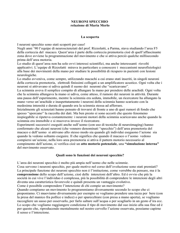 NEURONI SPECCHIO relazione di Maria Merlo La scoperta I neuroni specchio sono stati scoperti per caso! Negli anni ‘90 l’equipe di neuroscienziati del prof. Rizzolatti, a Parma, stava studiando l’area F5 della corteccia del macaco. Quest’area è parte della corteccia premotoria cioè di quell’affascinante zona dove avviene la programmazione del movimento e che si attiva perciò qualche millisecondo prima dell’area motoria. Lo studio di quest’area non ha solo ovvi interessi scientifici, ma anche interessanti risvolti applicativi. L’equipe di Rizzolatti mirava in particolare a conoscere i meccanismi neurofisiologici alla base dei movimenti della mano per studiare le possibilità di ricupero in pazienti con lesioni neurologiche. Lo studio avveniva, come sempre, utilizzando macachi a cui erano stati inseriti, in singoli neuroni della corteccia premotoria, elettrodi finissimi collegati a un amplificatore acustico. Ogni volta che i neuroni si attivavano si udiva quindi il suono dei neuroni che “scaricavano”. La scimmia aveva il semplice compito di allungare la mano per prendere delle arachidi. Ogni volta che la scimmia allungava la mano si udiva, come atteso, il rumore dei neuroni in attività. Durante una pausa dell’esperimento, mentre la scimmia era seduta, immobile, un ricercatore ha allungato la mano verso un’arachide e inaspettatamente i neuroni della scimmia hanno scaricato con la medesima intensità e durata di quando era la scimmia stessa ad afferrare. Inizialmente gli scienziati hanno pensato di trovarsi di fronte a uno di quei rumori di fondo che spesso “sporcano” la raccolta dei dati. Ma ben presto si sono accorti che questo fenomeno inspiegabile si ripeteva costantemente: i neuroni motori della scimmia scaricavano anche quando la scimmia era immobile e si muoveva invece il ricercatore. Esperimenti successivi eseguiti anche sull’uomo (con uso di tecniche di neuroimaging) hanno confermato che alcuni neuroni (che vennero denominati “specchio”) dell’area premotoria del macaco e dell’uomo si attivano allo stesso modo sia quando gli individui eseguono l’azione sia quando la vedono soltanto eseguire. Il che significa che quando il macaco o l’uomo vedono compiersi un’azione, nella loro area premotoria si attiva il pattern motorio necessario al compimento dell’azione, si verifica cioè un atto motorio potenziale, una “simulazione interna” del movimento osservato. Quali sono le funzioni dei neuroni specchio? L’area dei neuroni specchio è molto più ampia nell’uomo che nelle scimmie. Cosa servono i neuroni specchio, per quale motivo nel corso dell’evoluzione sono stati premiati? La principale funzione dei neuroni specchio non è l’imitazione, come verrebbe da pensare, ma è la comprensione dello scopo dell’azione, cioè delle intenzioni dell’altro. Ed è ovvio che più la società in cui vive l’individuo è complessa, più la possibilità di comprendere le intenzioni degli altri diventa una caratteristica favorevole e quindi presenta un vantaggio evolutivo. Come è possibile comprendere l’intenzione di chi compie un movimento? Quando compiamo un movimento lo programmiamo diversamente secondo lo scopo che ci proponiamo. Ci muoviamo diversamente per esempio se vogliamo prendere una tazza per bere (con la presa del manico fra pollice e indice) o per sparecchiare (con presa a mano aperta), se vogliamo raccogliere un sasso per osservarlo, per farlo saltare sull’acqua o per scagliarlo in un gesto d’ira ecc. Lo scopo che vogliamo raggiungere condiziona il tipo di movimento dal suo inizio alla sua fine ed è per questo che, riproducendo mentalmente nel nostro cervello l’azione osservata, possiamo capirne il senso e l’intenzione. La comprensione attraverso i neuroni specchio non è l’unica forma di comprensione a nostra disposizione. Noi comprendiamo le intenzioni degli altri anche in modo razionale, per vie più complesse e integrate, servendoci delle informazioni provenienti dal contesto e facendo dei ragionamenti di tipo deduttivo. Ma la comprensione attraverso i neuroni specchio è preziosa principalmente per 2 motivi: perché, nascendo da una simulazione interna del movimento, è intima e corporea e perché è immediata, simultanea a ciò che osserviamo. Per capire meglio cosa significa programmare il movimento e attivare un pattern motorio occorre conoscere come funziona l’area premotoria. Siamo abituati a pensare a un cervello di tipo ingegneristico, cioè a pensare che il movimento si realizzi, dopo che è stata presa la decisione, per impulsi nervosi che partono dalla corteccia motoria (l’homunculus motorio) diretti ai vari muscoli. In effetti questo è lo schema di azione della corteccia motoria (figura 1). Ben diverso è il funzionamento della corteccia premotoria, di cui ci stiamo occupando ora, che pianifica le azioni (figura 2). In essa si trovano neuroni altamente specializzati, detti canonici, già noti prima degli anni ’90. Essi vengono attivati da stimoli visivi che percorrono la via visiva ventrale (la quale porta informazioni su dove è l’oggetto, non su cosa è). I neuroni canonici si attivano non secondo i muscoli interessati ma secondo lo scopo e le modalità dell’azione da compiere e funzionano in modo coordinato e in sequenze. Per quanto riguarda per esempio i movimenti della mano ci sono neuroni “prendere”, neuroni “tenere”, neuroni “strappare”, neuroni “lasciare”. Gli stessi neuroni si attivano indifferentemente se l’azione è compiuta con la mano destra o la sinistra, ma non se gli stessi muscoli vengono utilizzati per altri scopi, per esempio per grattarsi la testa. Si attivano se la scimmia prende a mano nuda o con strumenti e anche quando la scimmia usa, per lo stesso scopo, muscoli antagonisti (esempio prende con una pinza tradizionale o con una pinza inversa, come quelle per le escargot). E’ lo scopo, dunque, che l’individuo si prefigge che stabilisce quale neuro