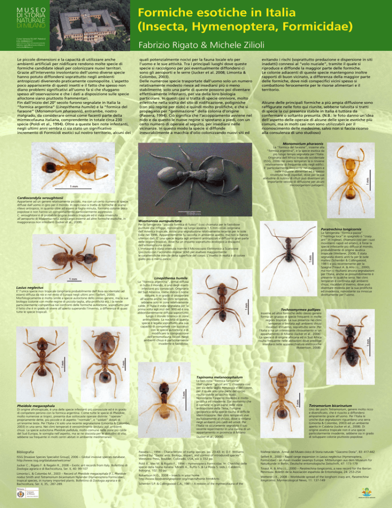 Formiche esotiche in Italia (Insecta, Hymenoptera, Formicidae) MUSEO DI STORIA NATURALE DI MILANO Corso Venezia 55 (M1 Palestro) Info 0288463337 Fabrizio Rigato & Michele Zilioli www.comune.milano.it/museostorianaturale [email protected] [email protected] Le piccole dimensioni e la capacità di utilizzare anche ambienti artificiali per nidificare rendono molte specie di formiche candidate ideali per colonizzare nuovi territori. Grazie all’intervento involontario dell’uomo diverse specie hanno potuto diffondersi soprattutto negli ambienti antropizzati divenendo praticamente cosmopolite. L’aspetto poco appariscente di questi insetti e il fatto che spesso non diano problemi significativi all’uomo fa sì che sfuggano spesso all’osservazione e che i dati a disposizione sulle specie alloctone siano piuttosto frammentari. Fin dall’inizio del 20° secolo furono segnalate in Italia la “formica argentina” (Linepithema humile) e la “formica del faraone” (Monomorium pharaonis), entrambe, nostro malgrado, da considerare ormai come facenti parte della mirmecofauna italiana, comprendente in totale circa 230 specie (Poldi et al., 1994). Oltre a queste ben note infestanti, negli ultimi anni sembra ci sia stato un significativo incremento di Formicidi esotici sul nostro territorio, alcuni dei quali potenzialmente nocivi per la fauna locale e/o per l’uomo e le sue attività. Tra i principali luoghi dove queste specie si raccolgono per poi eventualmente diffondersi ci sono gli aeroporti e le serre (Jucker et al. 2008; Limonta & Colombo, 2003). Delle numerose specie trasportate dall’uomo solo un numero relativamente modesto riesce ad insediarsi più o meno stabilmente; solo una parte di queste possono poi diventare effettivamente infestanti, per via della loro biologia particolare. In questi casi si tratta di specie onnivore, molto eclettiche nella scelta del sito di nidificazione, poliginiche (con più regine per nido) e quindi molto prolifiche, e che si propagano per “gemmazione” della colonia d’origine (Passera, 1994). Ciò significa che l’accoppiamento avviene nel nido e da questo le nuove regine si spostano a piedi, con un certo numero di operaie al seguito, per insediarsi nelle vicinanze. In questo modo la specie si diffonde inesorabilmente a macchia d’olio colonizzando nuovi siti ed evitando i rischi (soprattutto predazione e dispersione in siti inadatti) connessi al “volo nuziale”, tramite il quale si riproduce e diffonde la maggior parte delle formiche. Le colonie adiacenti di queste specie mantengono inoltre rapporti di buon vicinato, a differenza della maggior parte delle formiche, dove nidi conspecifici vicini spesso si combattono ferocemente per le risorse alimentari e il territorio. Alcune delle principali formiche a più ampia diffusione sono raffigurate nelle foto qui riunite, sebbene talvolta si tratti di specie la cui presenza stabile in Italia è tuttora da confermare o soltanto presunta. (N.B.: le foto danno un’idea dell’aspetto delle operaie di alcune delle specie esotiche più comuni, ma in molti casi non sono utilizzabili per il riconoscimento delle medesime, salvo non si faccia ricorso alla consulenza di uno studioso) La “formica del faraone”, insieme alla “formica argentina”, è la specie esotica da più lungo tempo segnalata per l’Italia. Originaria dell’Africa tropicale occidentale (ISSG, 2006) nei paesi temperati la si rinviene relativamente di frequente solo negli edifici. E’ particolarmente frequente nei magazzini e nelle industrie alimentari ed è spesso rinvenuta negli ospedali, dove per la sua abitudine di nutrirsi di rifiuti può diventare un importante veicolo di diffusione per alcuni microorganismi patogeni. 1 mm 1 mm Monomorium pharaonis Cardiocondyla wroughtonii Per la famigerata “piccola formica di fuoco” (così chiamata per le fastidiose punture che infligge, nonostante sia lunga appena 1,5 mm circa), originaria dell’America tropicale, esiste una segnalazione relativamente recente per le isole Eolie nel 1996. Apparentemente fu raccolta in ambiente aperto, ma non si hanno ulteriori dati. E’ una specie legata agli ambienti antropizzati e diffusa in gran parte delle regioni tropicali, dove ha un impatto soprattutto ecologico a discapito dell’entomofauna locale. L’immagine è stata ottenuta tramite il Microscopio Elettronico a Scansione (più noto con l’acronimo inglese SEM) per esaltare maggiormente le caratteristiche minute della superficie del corpo. L’insetto in realtà è di colore giallo più o meno carico. Paratrechina longicornis Linepithema humile Technomyrmex pallipes Insieme ad altre formiche dello stesso genere forma un gruppo di specie frequenti in molte regioni tropicali. La sua presenza nei climi temperati è limitata agli ambienti chiusi riscaldati d’inverno, soprattutto serre. Per l’Italia si ha un interessante ritrovamento in un appartamento di Milano (Jucker et al., 2008). La specie è di origine africana ed in Sud Africa risulta frequente nelle abitazioni dove predilige insediarsi nelle apparecchiature elettroniche (Robertson, 2008). 1 mm E’ l’unica specie non tropicale (originaria probabilmente dell’Asia occidentale) ad essersi diffusa da noi e nel resto d’Europa negli ultimi anni (Seifert, 2000). Morfologicamente è molto simile a specie autoctone dello stesso genere, ma la sua biologia (colonie con molte regine di piccola taglia, alta prolificità ecc.) la rende particolarmente competitiva nei confronti delle formiche autoctone, soprattutto per il fatto che è in grado di vivere all’aperto superando l’inverno, a differenza di quasi tutte le specie tropicali. La famigerata “formica pazza” (“hormiga loca” in spagnolo o “crazy ant” in inglese), chiamata così per i suoi movimenti rapidi ed erratici, è forse la specie infestante più diffusa al mondo, probabilmente di origine asiatica tropicale (Wetterer, 2008). È stata segnalata diversi anni fa per le i