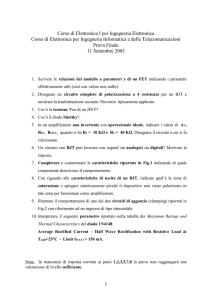SOMMARIO Il guadagno statico hFE............................................................................................................................ 2 Polarizzazione di un BJT .......................................................................................................................... 2 Scelta del punto di lavoro per assicurare un buon funzionamento in zona attiva...................................... 3 Instabilità del punto di lavoro ................................................................................................................... 3 -Influenza della temperatura..................................................................................................................... 3 -Influenza della dispersione delle caratteristiche ...................................................................................... 4 Deriva Termica (Thermal Running) .......................................................................................................... 4 Criterio di polarizzazione con tensione di batteria dimezzata.................................................................... 5 Circuiti di stabilizzazione termica............................................................................................................. 5 Elementi di calcolo della rete di stabilizzazione termica........................................................................... 6 Circuito con BJT al germanio................................................................................................................... 6 Circuito con BJT al silicio ........................................................................................................................ 7 Compensazione termica della VBE ............................................................................................................. 7 Compensazione termica della ICBO ........................................................................................................... 7 Connessioni Darlinghton .......................................................................................................................... 8 La dissipazione termica nei BJT ............................................................................................................... 9 Analisi dei dati forniti dal costruttore ..................................................................................................... 10 BJT connesso al dissipatore.................................................................................................................... 10 Curve di Derating della Potenza............................................................................................................. 11 Esempio :................................................................................................................................................ 11 BIBLIOGRAFIA...................................................................................................................................... 12 BJT: Complementi prof. Cleto Azzani IPSIA Moretto Brescia Novembre 1995 Il guadagno statico hFE hFE è un parametro fornito dal costruttore; esso prende il nome di Guadagno di Corrente Statico del transistore BJT ed è così definito: hFE = IC IB 1.1 esso dipende da : 1) la corrente di collettore Ic. Come si nota dal grafico, a T costante, la curva presenta un massimo per un valore di Ic compreso fra 5 e 10 mA; per Ic tendente a 0, hFE tende a 0 nei BJT al Ge; mantiene valori diversi da 0 nel caso di BJT al Si. 2) la Temperatura: al crescere della T della giunzione hFE cresce mentre al diminuire della T, hFE diminuisce. Facendo riferimento all'equazione fondamentale del BJT nella connessione CE si ha: I C = β ⋅ I B + (β + 1) ⋅ I CBO 1.2 da cui risulta facilmente : β= I C − I CBO I B + I CBO 1.3 nei BJT al Si essendo Icbo dell'ordine dei nA risulta sicuramente trascurabile sia rispetto alla Ic che rispetto alla Ib pertanto risulta: β= IC = hFE IB (nei BJT al Silicio) 1.4 nei BJT al Ge essendo ICB0 dell'ordine dei µA risulta trascurabile rispetto alla IC ma non trascurabile rispetto alla IB pertanto ß risulta diverso da hFE. β= IC ≠ hFE I B + I CBO Polarizzazione di un BJT Polarizzare un BJT significa fornire al BJT, mediante opportune reti elettriche, le tensioni e le correnti di cui esso necessita per un determinato tipo di funzionamento per cui si intende impiegarlo. Gioverà perciò ricordare che se il BJT funziona Vcc da amplificatore, il punto di lavoro o di riposo andrà scelto in "Zona Attiva" e perciò la giunzione J BE dovrà essere polarizzata direttamente Rb Rc mentre la giunzione J BC dovrà essere polarizzata inversamente; mentre se il BJT funziona da "interruttore", come avviene nei circuiti Ib Ic logici o digitali, il punto di riposo andrà scelto o in saturazione oppure in interdizione. Il circuito di fig. 3 è il più semplice circuito di polarizzazione di un Vce BJT mediante una sola batteria di alimentazione; facendo riferimento Vbe ad esso si può scrivere: VCE = VCC − RC ⋅ I C 1.5 fig. 3 Cleto Azzani 2 VBE = VCC − RB ⋅ I B 1.6 Scegliere il punto di lavoro significa scegliere o prefissare VCE, IC ,VBE, IB per cui restano univocamente determinati i valori di RB e di RC. Risolvendo la 1.5 rispetto a RC e la 1.6 rispetto ad RB si ottiene: VCC − VCE IC V − VBE RB = CC IB RC = 1.7 1.8 Giova osservare tuttavia che mentre VCE, IC, IB possono assumere valori diversi , VBE vale costantemente: 0,2 - 0,3 V per i BJT al Germanio, 0,5 - 0,7 V per i BJT al Silicio. Scelta del punto di lavoro per assicurare un buon funzionamento in zona attiva La scelta del punto di lavoro vicino alla zona di interdizione (caso del punto P1 nel grafico di fig. 4), produce, nell'ipotesi che il BJT venga impiegato come amplificatore di segnale perfettamente sinusoidale, una "compressione" della semionda negativa del segnale di ingresso e una amplificazione della semionda positiva; ciò da 