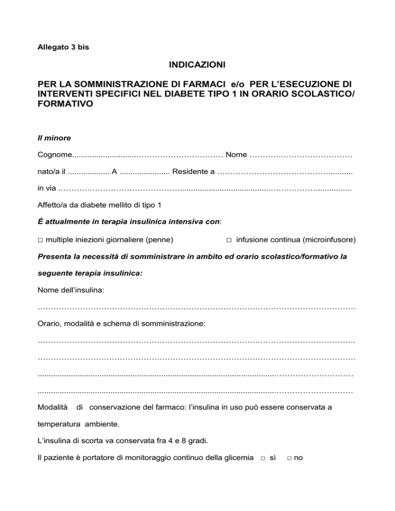 Allegato 3 bis INDICAZIONI PER LA SOMMINISTRAZIONE DI FARMACI e/o PER L’ESECUZIONE DI INTERVENTI SPECIFICI NEL DIABETE TIPO 1 IN ORARIO SCOLASTICO/ FORMATIVO Il minore Cognome.............................…………………………… Nome ………………………………… nato/a il ................... A ....................... Residente a ……………………………………........... in via .……………………………………….........................................………………............... Affetto/a da diabete mellito di tipo 1 È attualmente in terapia insulinica intensiva con: □ multiple iniezioni giornaliere (penne) □ infusione continua (microinfusore) Presenta la necessità di somministrare in ambito ed orario scolastico/formativo la seguente terapia insulinica: Nome dell’insulina: ………………………………………………………………………………………………………… Orario, modalità e schema di somministrazione: ………………………………………………………………………………………………………… ………………………………………………………………………………………………………… ...........................................................................................................………………………… ...........................................................................................................………………………… Modalità di conservazione del farmaco: l’insulina in uso può essere conservata a temperatura ambiente. L’insulina di scorta va conservata fra 4 e 8 gradi. Il paziente è portatore di monitoraggio continuo della glicemia □ sì □ no In caso di ipoglicemia grave con perdita di coscienza somministrare: - glucagone (nome farmaco=.................................................... ) Sottocute e/o intramuscolo alla dose: 1 fiala= 1 mg se il peso è > 30 Kg, ½ fiala se minore Modalità di conservazione del farmaco:a temperatura refrigerata (4-8 gradi).Se conservato a temperatura ambiente è stabile per 18 mesi. I genitori del paziente sono stati correttamente istruiti su tutta la gestione terapeutica del diabete e sono □ non sono ancora □ idonei a dare indicazioni sulle variazioni della terapia. Eventuali note: ……………………………………………………………………………………………………………………………… ……………………………………………………………………………………………………………………………… ……………………………………………………………………………………………………………………………… …………………………………………………………………………………………………....................................... ……………………………………………………………………………………………………………………………… ...…………………………………………………………………………………………………………………………… Luogo e data Timbro e firma del medico (1) (1) Il medico del SSR che ha formulato il piano terapeutico e/o che ha prescritto la somministrazione del farmaco o l’intervento specifico