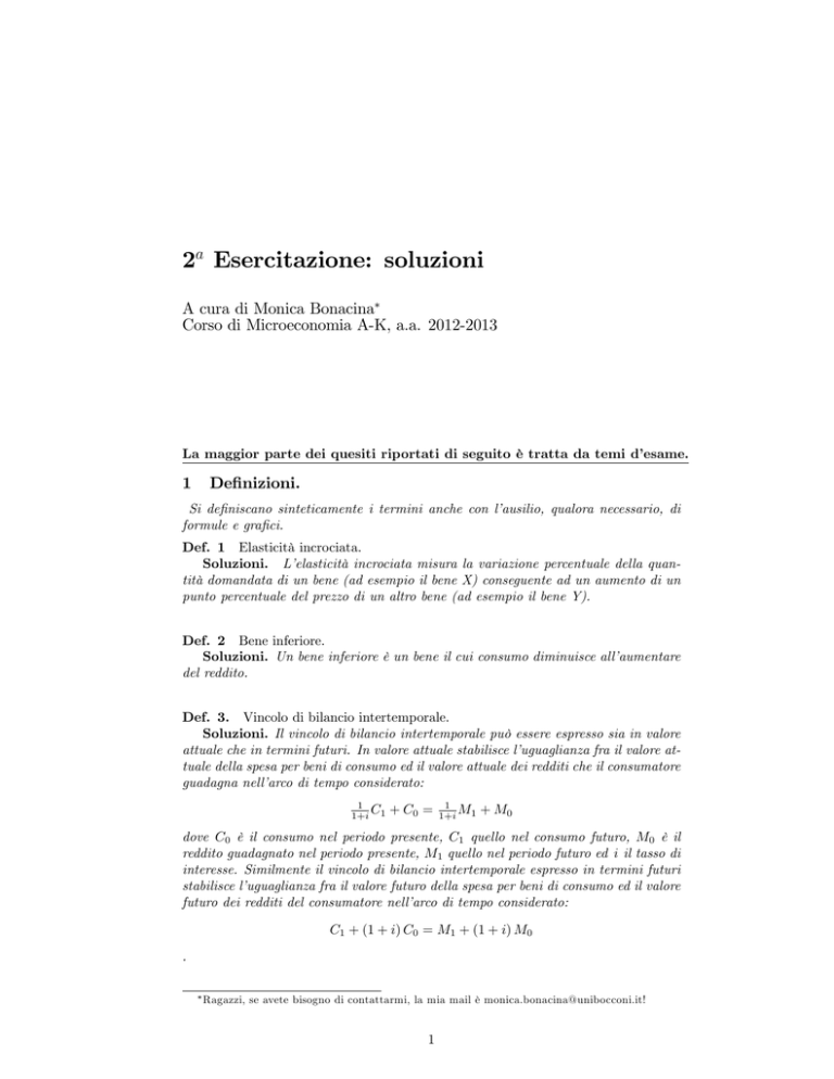 2a Esercitazione: soluzioni A cura di Monica Bonacina Corso di Microeconomia A-K, a.a. 2012-2013 La maggior parte dei quesiti riportati di seguito è tratta da temi d’esame. 1 De…nizioni. Si de…niscano sinteticamente i termini anche con l’ausilio, qualora necessario, di formule e gra…ci. Def. 1 Elasticità incrociata. Soluzioni. L’elasticità incrociata misura la variazione percentuale della quantità domandata di un bene (ad esempio il bene X) conseguente ad un aumento di un punto percentuale del prezzo di un altro bene (ad esempio il bene Y). Def. 2 Bene inferiore. Soluzioni. Un bene inferiore è un bene il cui consumo diminuisce all’aumentare del reddito. Def. 3. Vincolo di bilancio intertemporale. Soluzioni. Il vincolo di bilancio intertemporale può essere espresso sia in valore attuale che in termini futuri. In valore attuale stabilisce l’uguaglianza fra il valore attuale della spesa per beni di consumo ed il valore attuale dei redditi che il consumatore guadagna nell’arco di tempo considerato: 1 1+i C1 + C0 = 1 1+i M1 + M0 dove C0 è il consumo nel periodo presente, C1 quello nel consumo futuro, M0 è il reddito guadagnato nel periodo presente, M1 quello nel periodo futuro ed i il tasso di interesse. Similmente il vincolo di bilancio intertemporale espresso in termini futuri stabilisce l’uguaglianza fra il valore futuro della spesa per beni di consumo ed il valore futuro dei redditi del consumatore nell’arco di tempo considerato: C1 + (1 + i) C0 = M1 + (1 + i) M0 . Ragazzi, se avete bisogno di contattarmi, la mia mail è [email protected]! 1 2 Vero/Falso. Si stabilisca se gli enunciati sono veri, falsi, o incerti. Si fornisca una spiegazione (anche gra…ca se opportuno) e si argomenti compiutamente la risposta. Vero/Falso 4 Se la funzione di domanda di un bene è perfettamente anelastica, signi…ca che esiste un perfetto sostituto di quel bene. Soluzioni. FALSO. Una curva di domanda perfettamente anelastica indica che il consumatore non è disposto a rinunciare all’acquisto del bene qualunque sia suo prezzo; dunque non esistono sostituti del bene. Vero/Falso 5 Se il bene X è un bene inferiore, una diminuzione della pressione …scale (ovvero una riduzione delle tasse sul reddito) non servirà a stimolarne la domanda. Soluzioni. VERO. La diminuzione della tassa sul reddito genera un incremento del reddito disponibile per acquisto di beni di consumo (il consumatore diventa relativamente più ricco). Nel caso di beni inferiori, all’aumentare del reddito diminuisce la domanda. Quindi, il provvedimento non stimola la domanda del bene, anzi ne produce una riduzione. Vero/Falso 6 Se l’elasticità dei cioccolatini rispetto al reddito è pari a 3 e il reddito si riduce del 10% allora la quantità domandata di cioccolatini deve crescere del 30%. Soluzioni. FALSO. Sostituendo i valori del testo nella formula dell’elasticità dei cioccolatini (bene X) rispetto al reddito (M), "reddito = X=X M=M ( M=M = 10% e "reddito = 3) si ottiene che la quantità domandata deve diminuire del 30% ( X=X = 30%). Vero/Falso 7 Un soggetto dispone di 24 ore di tempo libero T (in ascissa) e di nessuna una unità di bene di consumo Y (in ordinata); supponiamo che il salario orario sia w, e che il prezzo del bene di consumo sia p. Allora il suo vincolo di bilancio è Y = 24 (w=p)T . Soluzioni. FALSO. Sostituendo nella forma generale del vincolo di bilancio pY = w(24 T) si ottiene Y = w p 24 w pT . Vero/Falso 8 Un consumatore ha la seguente funzione di utilità per Mango (M) e Papaia (P): U (M; P ) = M a P b , con a e b positivi e (a+b)<1. Allora l’elasticità della domanda di Mango rispetto al prezzo del Mango è -(a+b). Soluzioni. FALSO. Nel caso di preferenze di tipo Cobb-Douglas, l’elasticità della domanda di ciascun bene rispetto al proprio prezzo è pari ad uno (in valore assoluto). 2 Vero/Falso 9 Se X e Y sono perfetti complementi, allora l’elasticità della domanda di bene X rispetto al prezzo di Y è nulla. Soluzioni. FALSO. Nel caso di beni perfetti complementi un aumento del prezzi di Y comporta una contrazione della domanda di X (perchè il consumatore desidera consumarli congiuntamente). Vero/Falso 10 Nello scegliere come allocare il tempo disponibile tra tempo libero e tempo dedicato al lavoro, un individuo razionale deciderà sempre di lavorare di più in seguito ad un aumento del salario. Soluzioni. INCERTO. Se il consumatore riceve un salario orario più elevato potrebbe anche decidere di lavorare meno ore perchè può guadagnare lo stesso reddito (e dunque permettersi lo stesso consumo) raggiunto in precedenza impegnando meno ore. Vero/Falso 11 In seguito ad un aumento del tasso di interesse un risparmiatore potrebbe decidere di indebitarsi. Soluzioni. FALSO. In seguito all’aumento del tasso di interesse il risparmiatore potrebbe ridurre il suo livello di risparmio (che, come evidenziato dal gra…co sottostante potrebbe passare da S = M 0 C0 a S0 = M0 C0 < S) ma non è possibile che il paniere ottimo appartenga al tratto di vincolo di bilancio caratterizzato da un consumo presente superiore al reddito presente. C1 Nuovo paniere ottimo Paniere ottimo iniziale M1 Paniere delle dotazioni iniziali C*0 C**0 M0 1+i C0 Vero/Falso 12 Le preferenze di Guido per consumo presente (C0 ) e consumo futuro (C1 ) sono rappresentate dalla seguente funzione di utilità: U (C0 ; C1 ) = min(C0 ; C1 ). I prezzi dei due beni sono entrambi pari ad 1. Guido sa che il suo reddito di quest’anno è M0 = 20, mentre il reddito del prossimo anno è M1 = 40. Qualunque sia il tasso di interesse (i), Guido deciderà di risparmiare. Soluzioni. FALSO. Il paniere ottimo di Guido, stanti le preferenze del consumatore, si caratterizzerà per un livello di consumo presente pari al livello di consumo futuro (infatti dalla funzione di utilità si evince che la retta dei vertici è C0 = C1 ). Dato che il reddito prsente di Guido è inferiore al reddito futuro ( M0 < M1 ) ci aspettiamo che Guido 